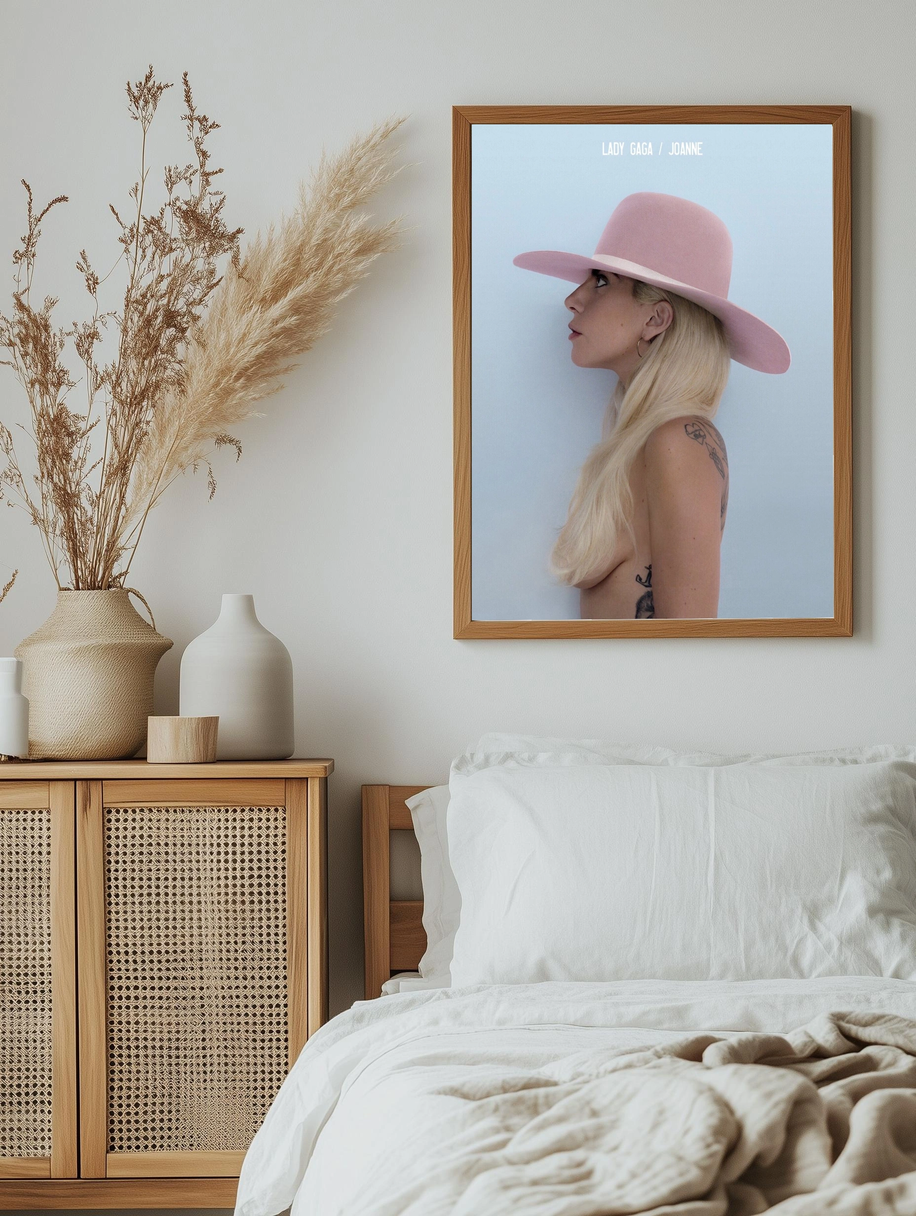 На изображении изображена знаменитая певица Lady Gaga в профиль, одетая в широкополую розовую шляпу на фоне мягкого голубого неба. Тонкая и минималистичная композиция, подчёркивающая красоту и индивидуальность, идеально подходит как интерьерный постер на холсте для гостиной или спальни. Это современное искусство для стен с акцентом на элегантность и стиль.