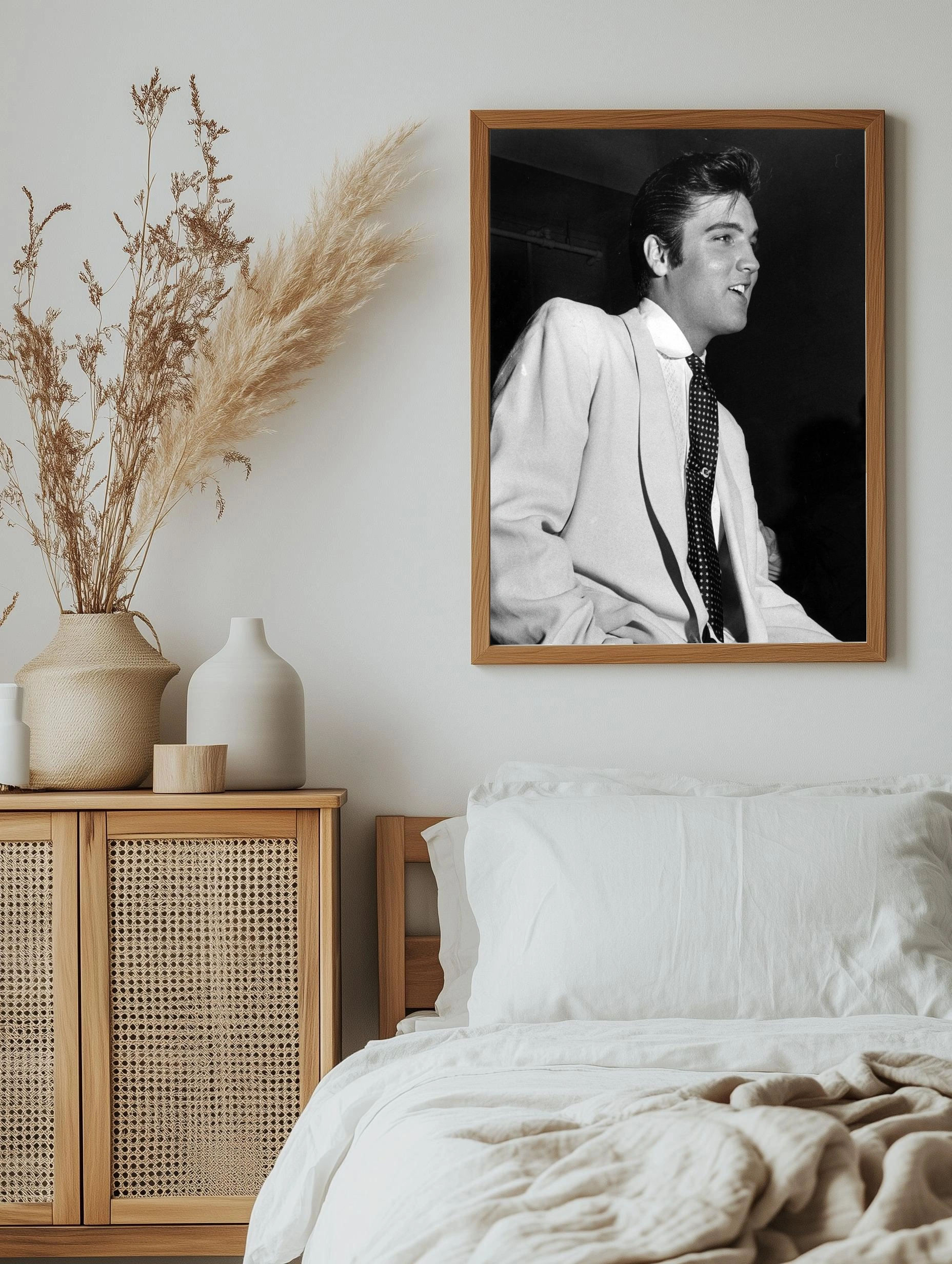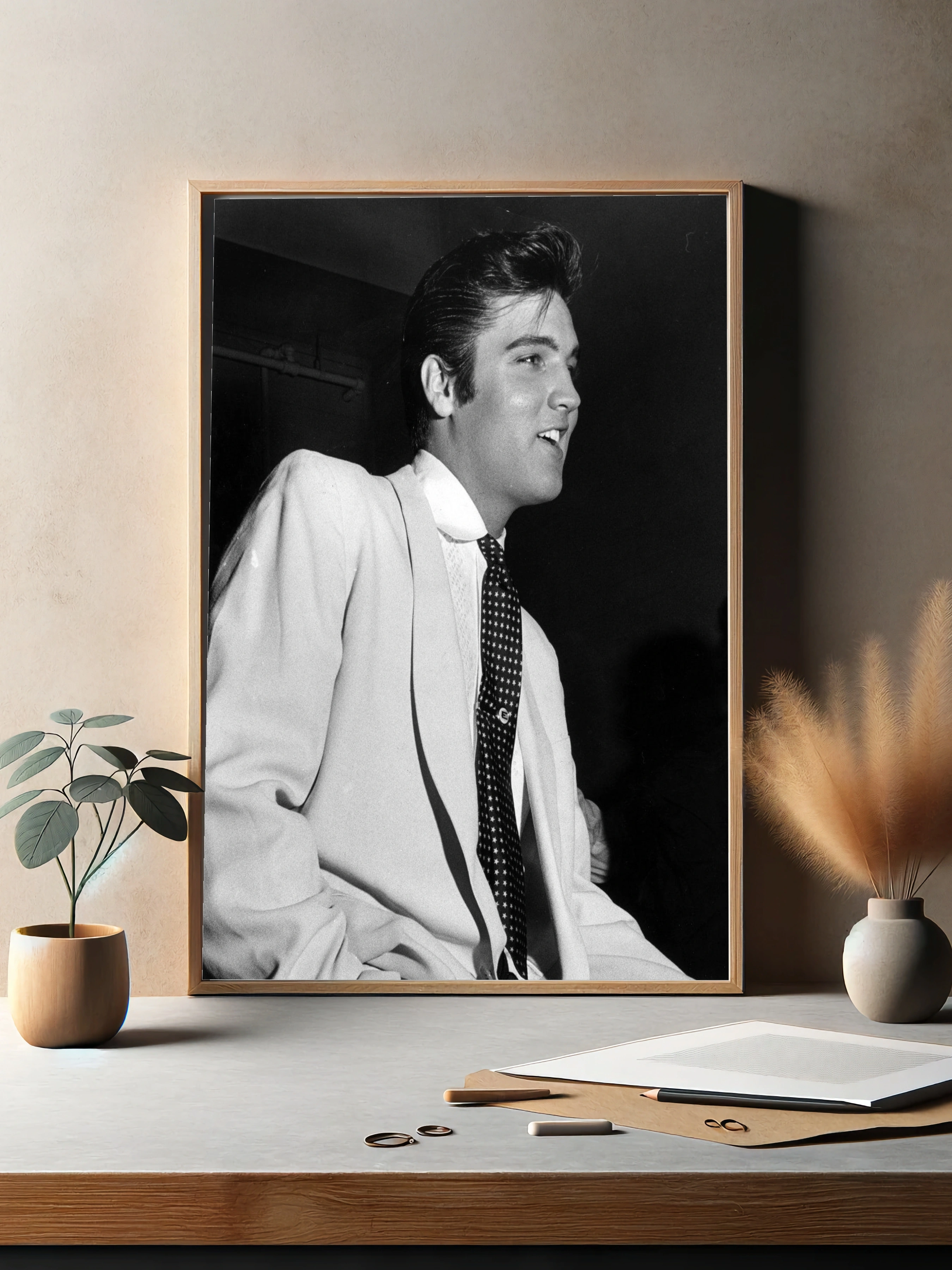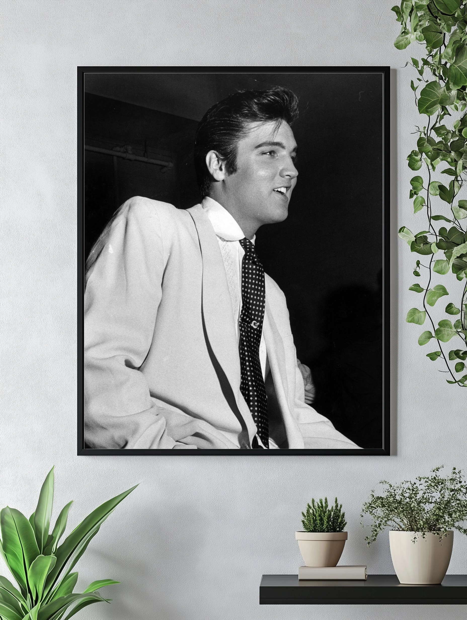 Чёрно-белая фотография с изображением Элвиса Пресли — ikonой рок-н-ролла. На снимке исполнитель в светлом пиджаке и галстуке с узором звезд, что подчёркивает стиль и эпоху 50-х. Этот интерьерный фотоплакаты станет отличным декоративным элементом для гостиной, спальни или офиса, придавая пространству атмосферу классики и музыкальной истории.
