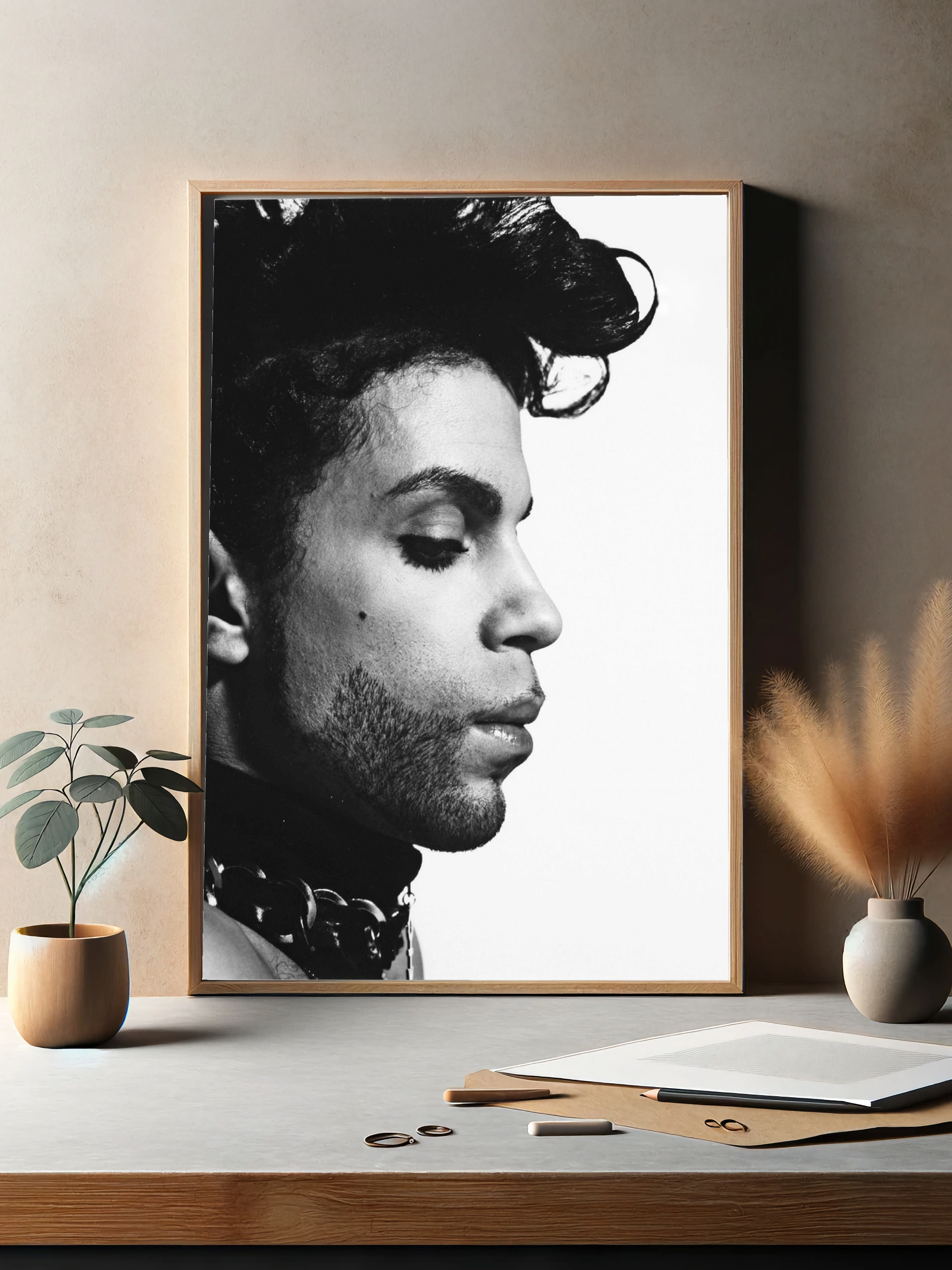 Чёрно-белое фото с крупным портретом Принса в профиль подчёркивает его выразительность и стиль. Стильная картина для гостиной или офиса, отражающая харизму и уникальность легендарного музыканта. Идеально подходит для современного искусства на стены и стильного декора.