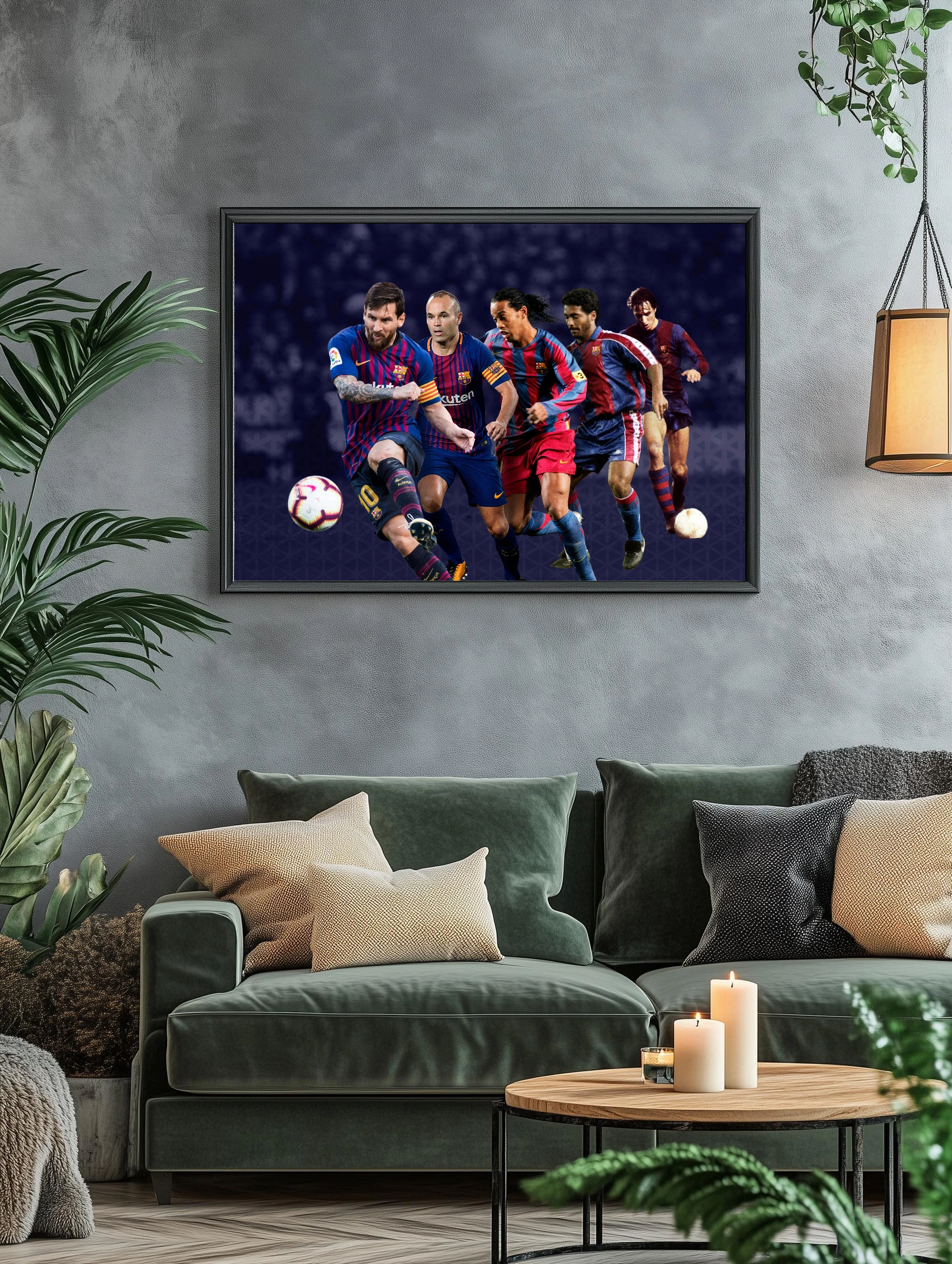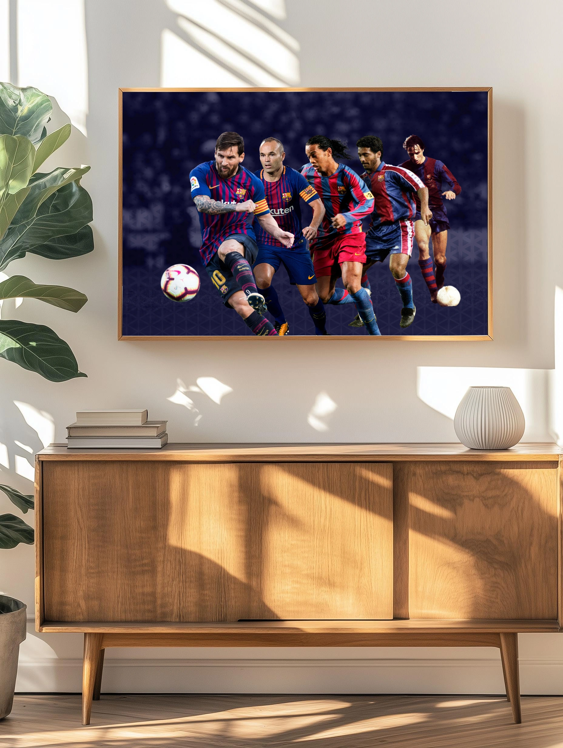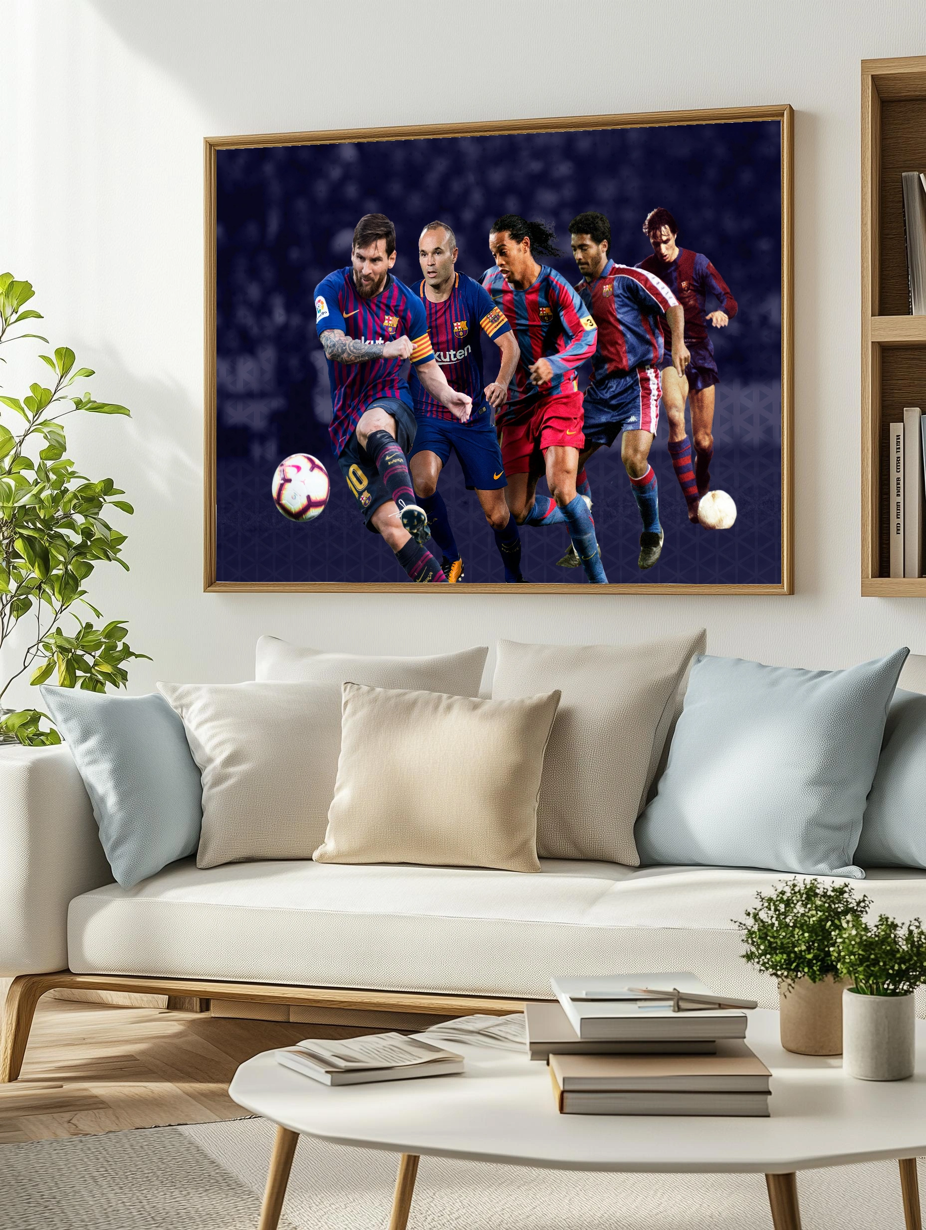 Декоративный плакат с изображением легендарных футболистов футбольного клуба Барселона: Лионель Месси, Андрес Иньеста, Роналдиньо и других. Современное искусство для стен с яркими сине-красными цветами команды создает стильный декор стен для гостиной или офиса.