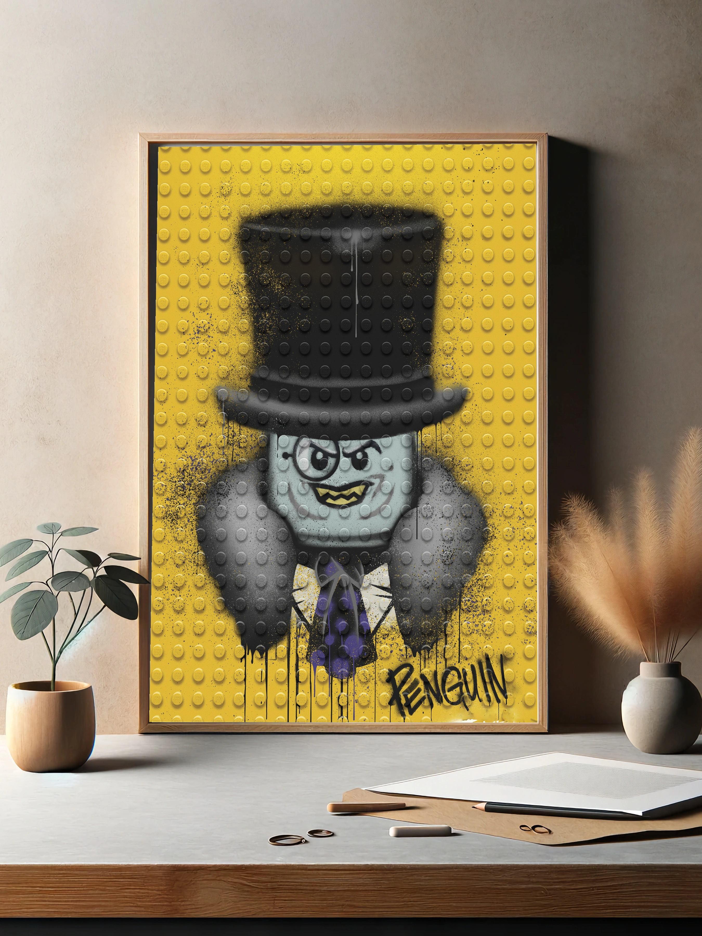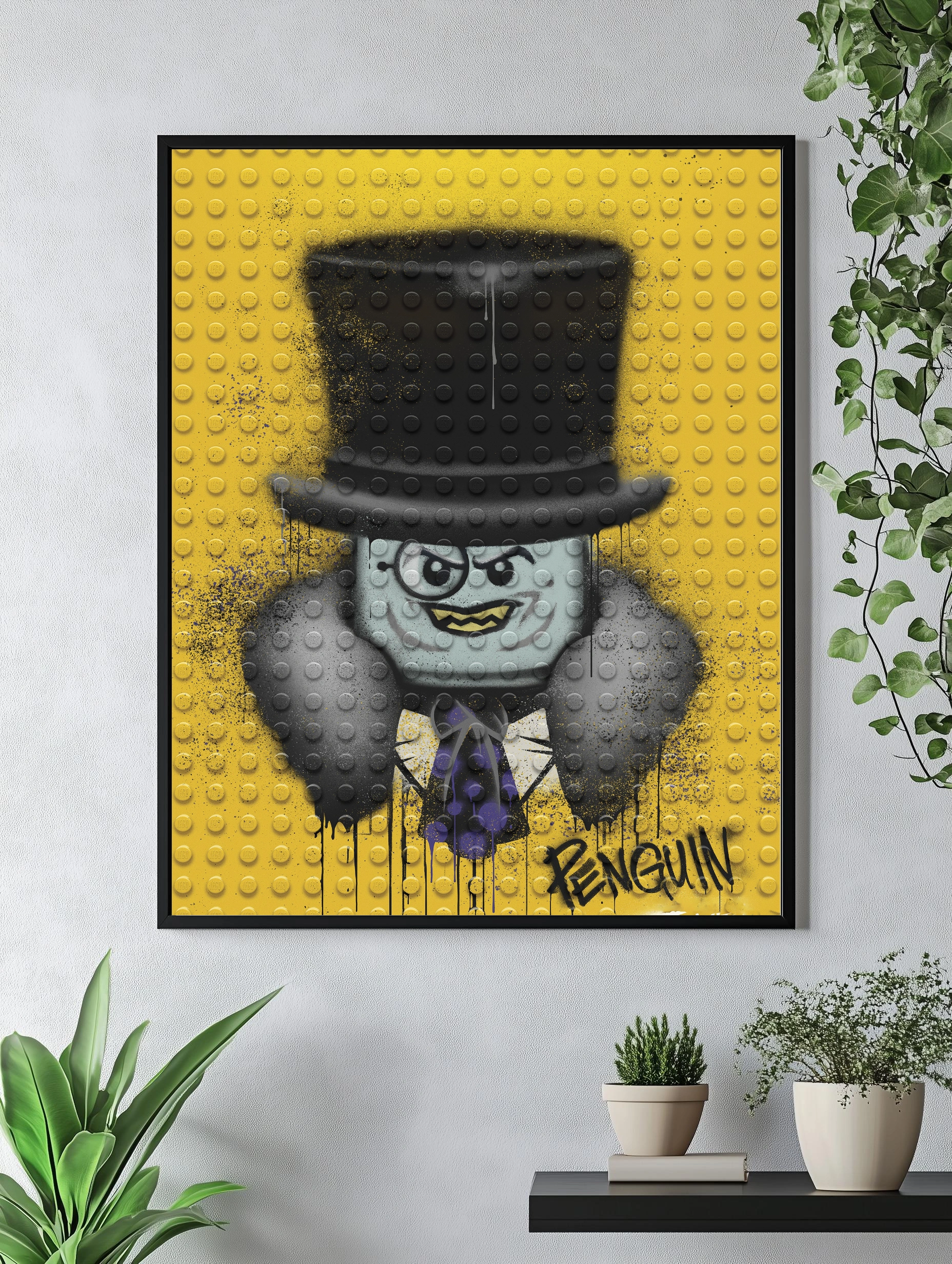 Яркое современное искусство с изображением персонажа Пингвина из вселенной DC Comics в стиле граффити на желтом фоне с текстурой Лего. Черные и серые оттенки создают готическое настроение, дополненное выразительным взглядом и классическим цилиндром. Идеально подойдет как интерьерное искусство для гостиной или офиса, уникальные картины для дома с атмосферой злодейства.