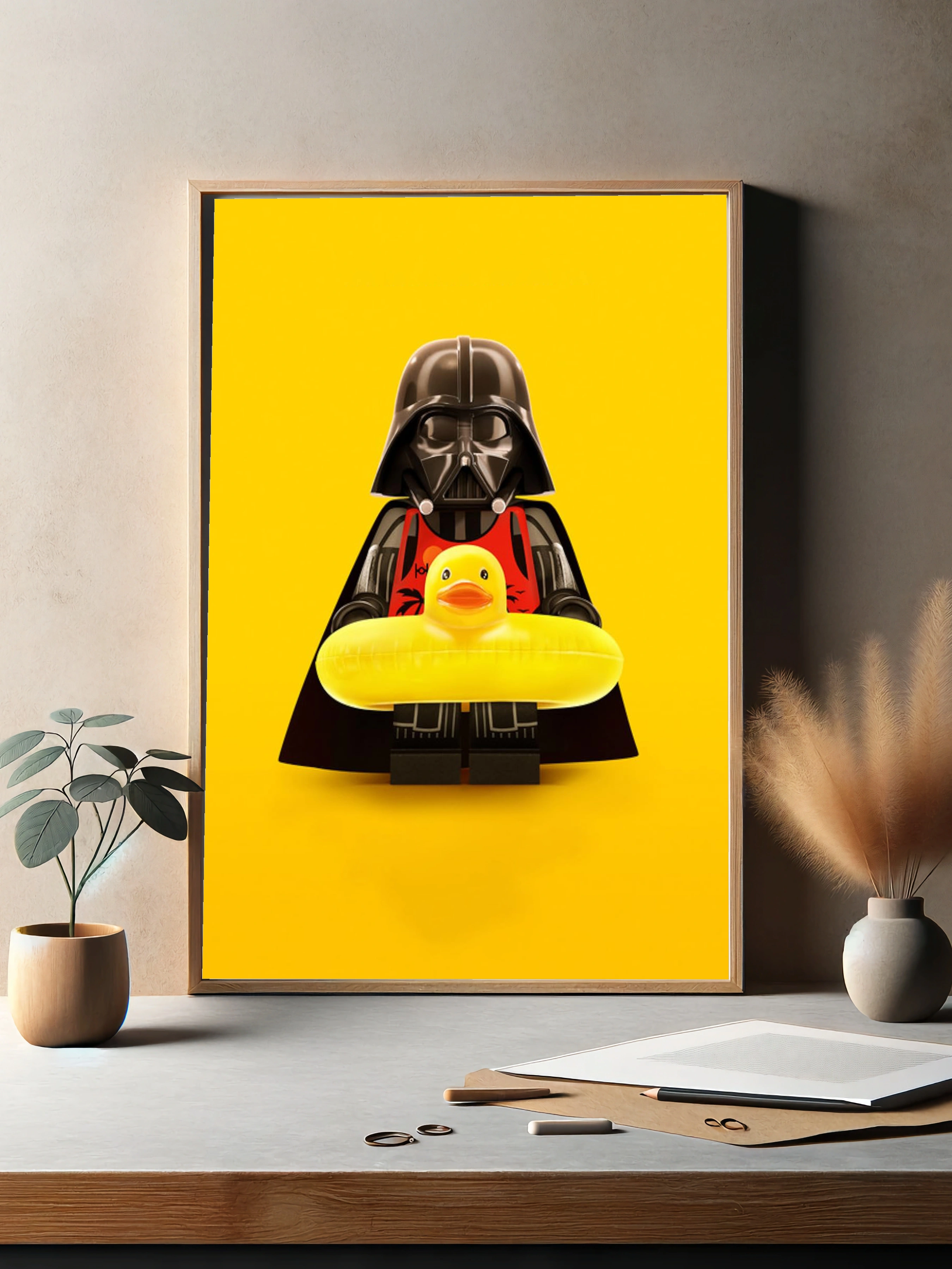 Яркий интерьерный арт с фигуркой Лего Дарта Вейдера на жёлтом фоне. Он одет в красную майку и держит надувной жёлтый плавательный круг с утёнком, что создаёт смешанный эффект серьёзности и юмора. Отличное современное искусство для стен, добавляющее живости и стилевого контраста в гостиную или офис.