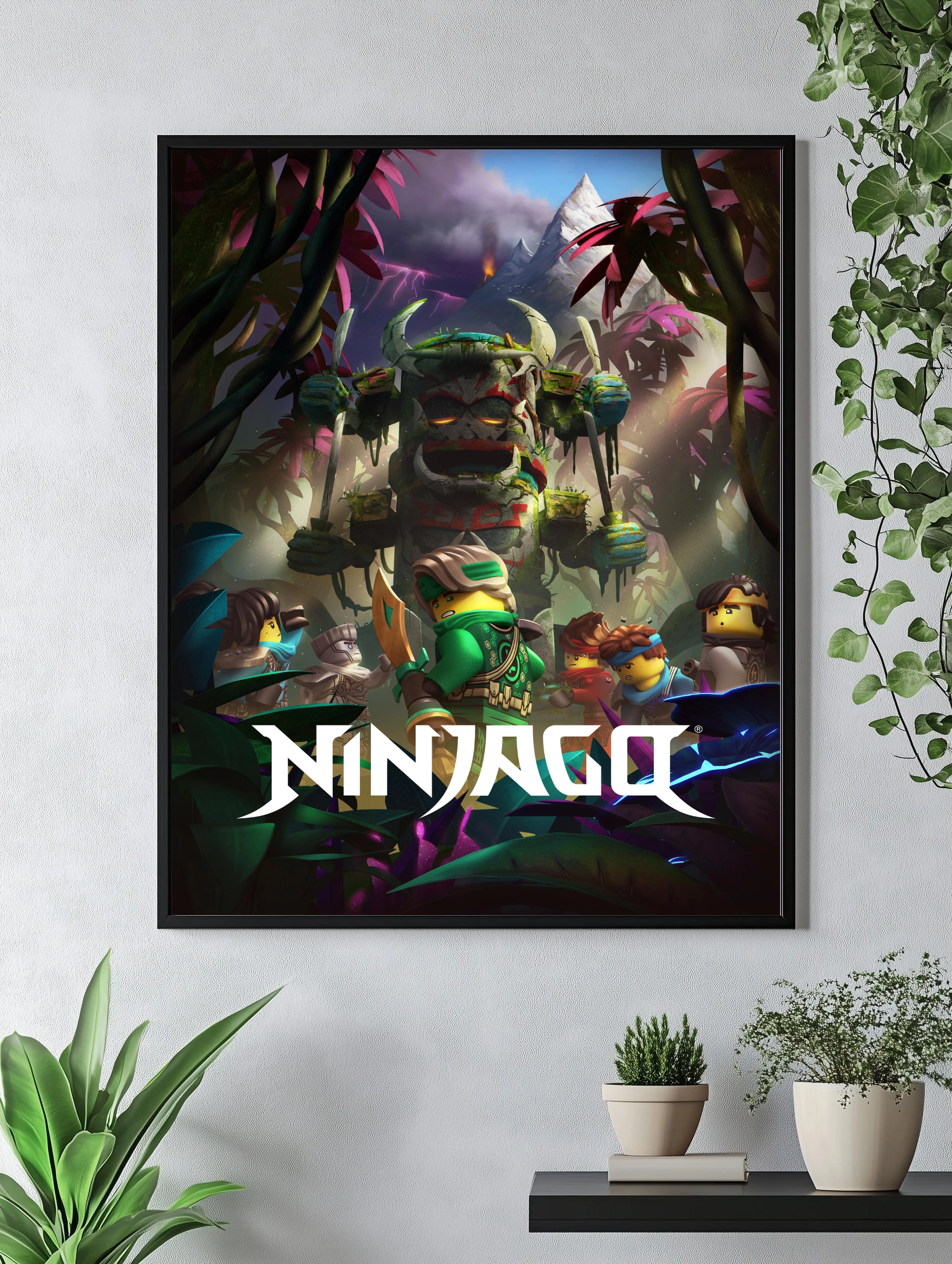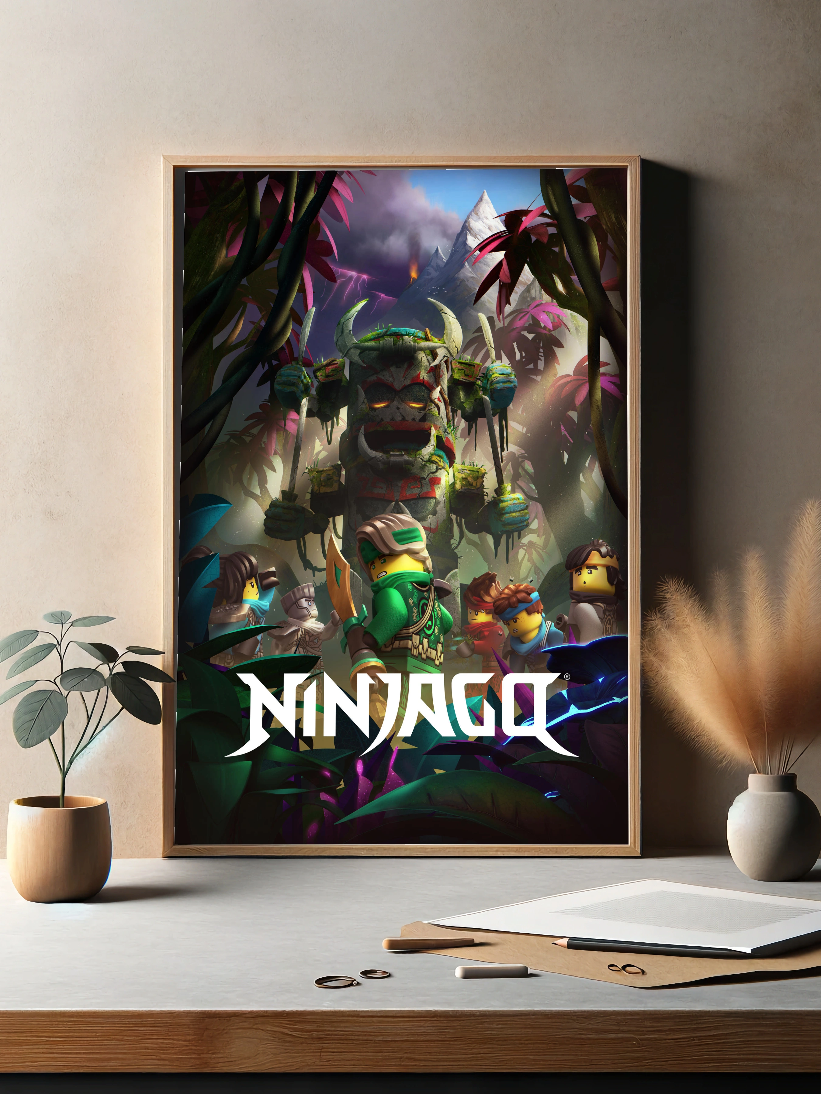 Яркое интерьерное искусство с персонажами LEGO Ninjago в динамичной сцене битвы с гигантской статуей в джунглях на фоне горы и грозового неба. Картина для гостиной и офиса, подходящая для любителей современного стиля и уникального декоративного декора. Энергия и мистицизм раскрываются через насыщенные цвета и яркий сюжет.