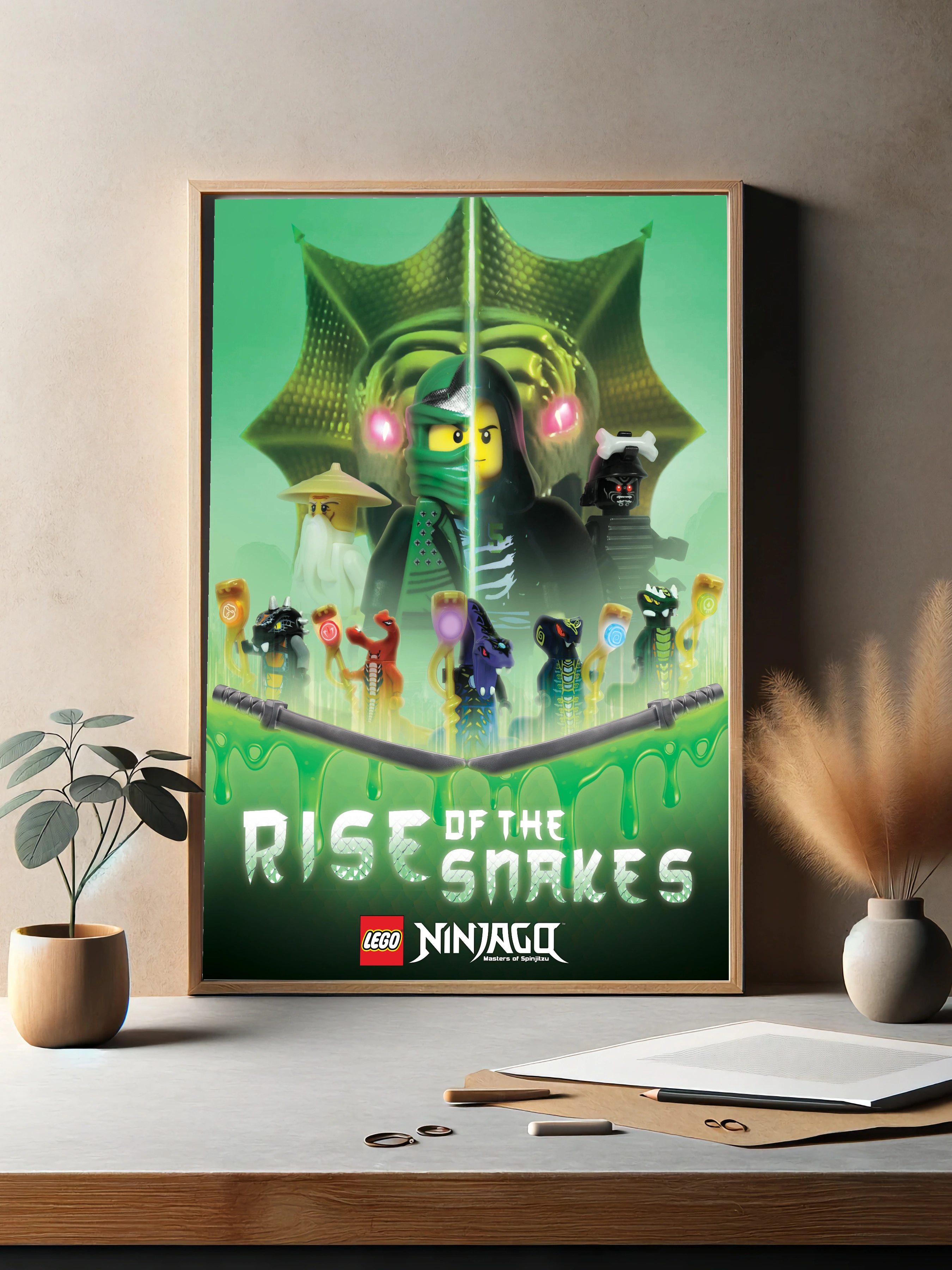 Яркая картина для гостиной в стиле LEGO Ninjago с героями ниндзя и зловещими змеями. Центральный персонаж стоит на фоне большой змеи, другие фигурки ниндзя и змей расположены по бокам. Зеленая палитра и динамичный свет создают атмосферу загадочного и динамичного боевого приключения. Идеально для современного интерьера и фанатов LEGO.