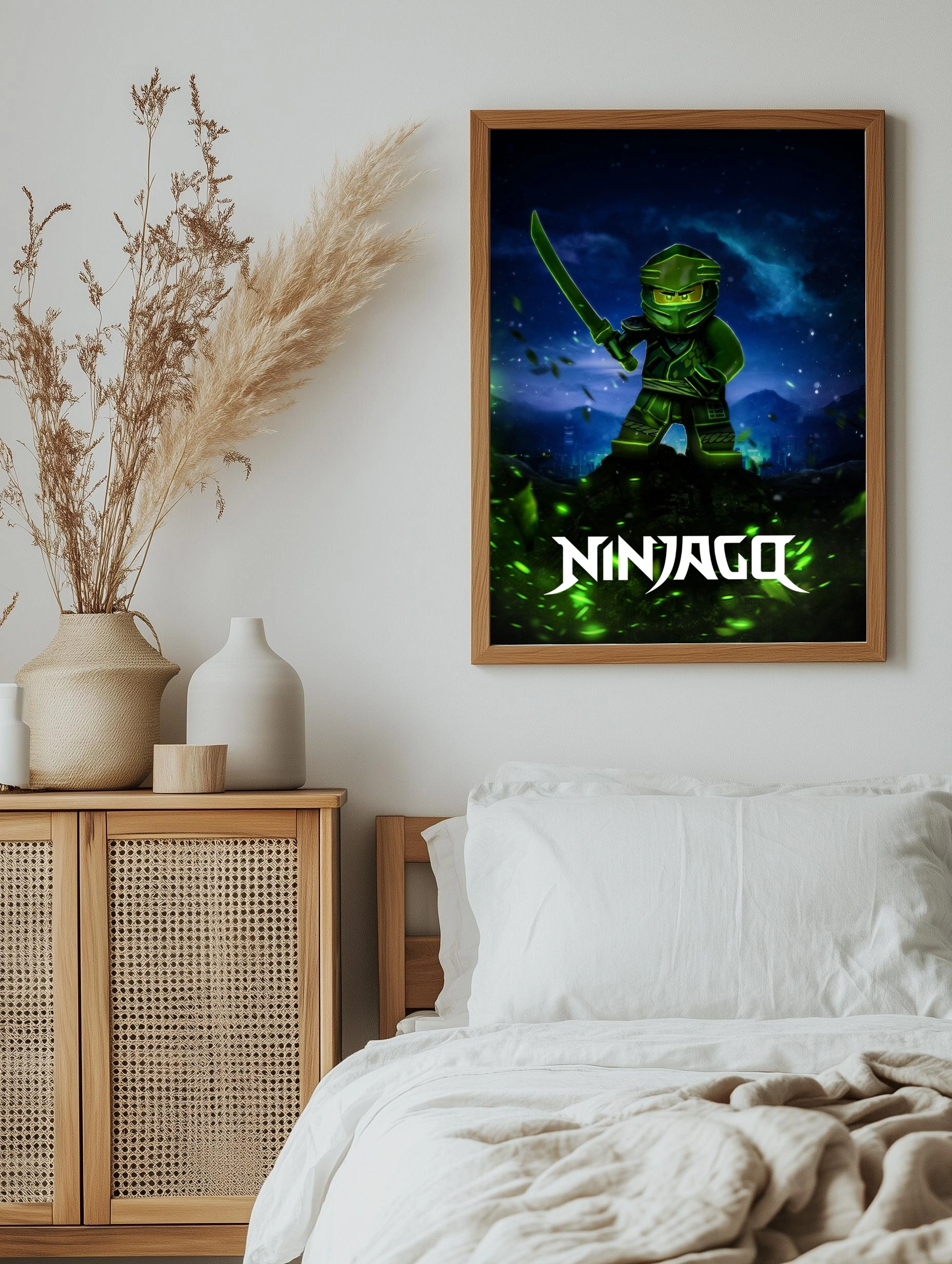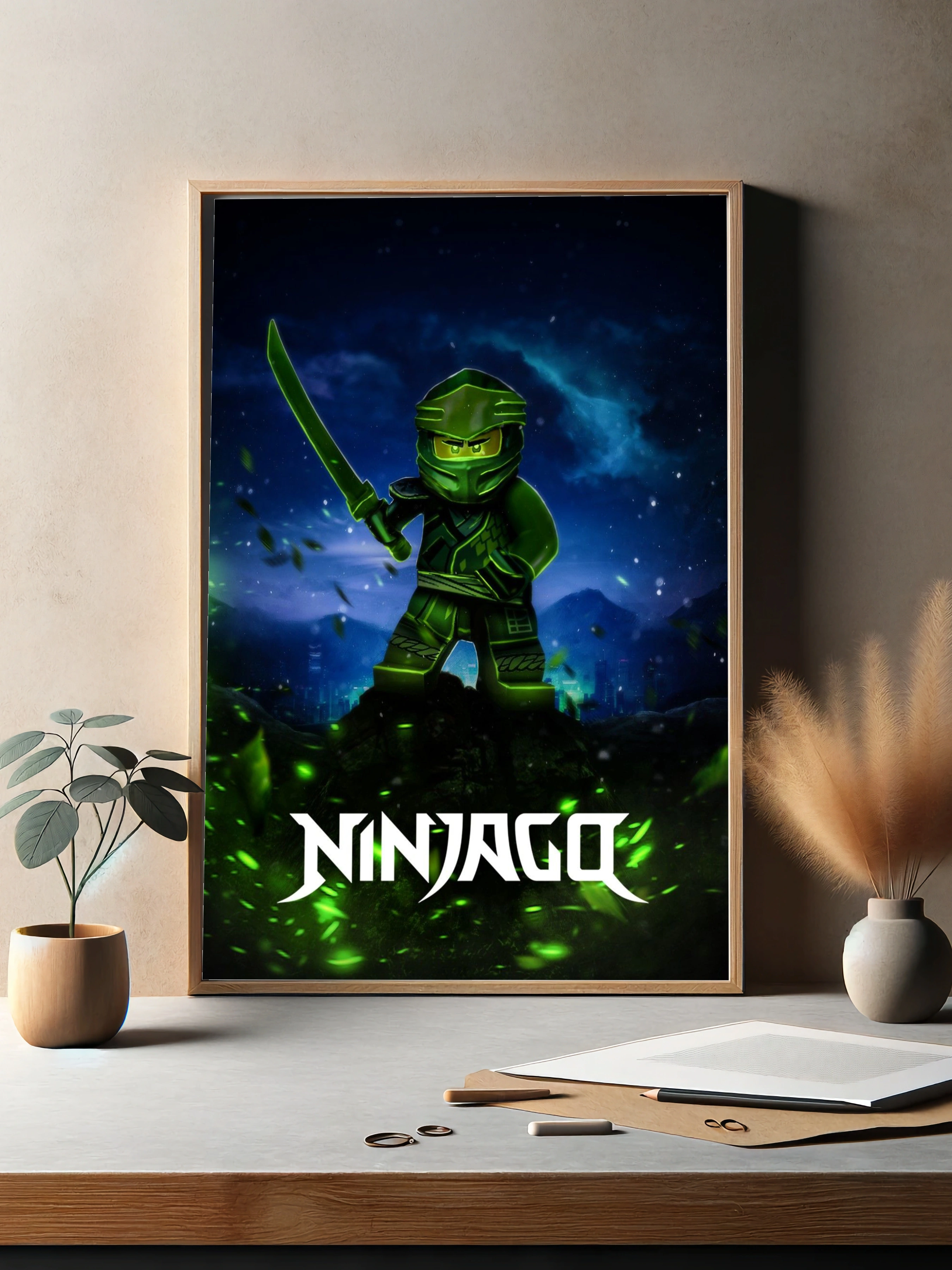 Декоративный плакат на холсте с изображением зелёного ниндзя из популярного мультфильма LEGO Ninjago. Персонаж в полной экипировке держит меч на фоне ночного неба и окутанного мистической атмосферой города, создавая эффект современного искусства для стен. Уникальные картины для дома и стильный декор стен в интерьере.