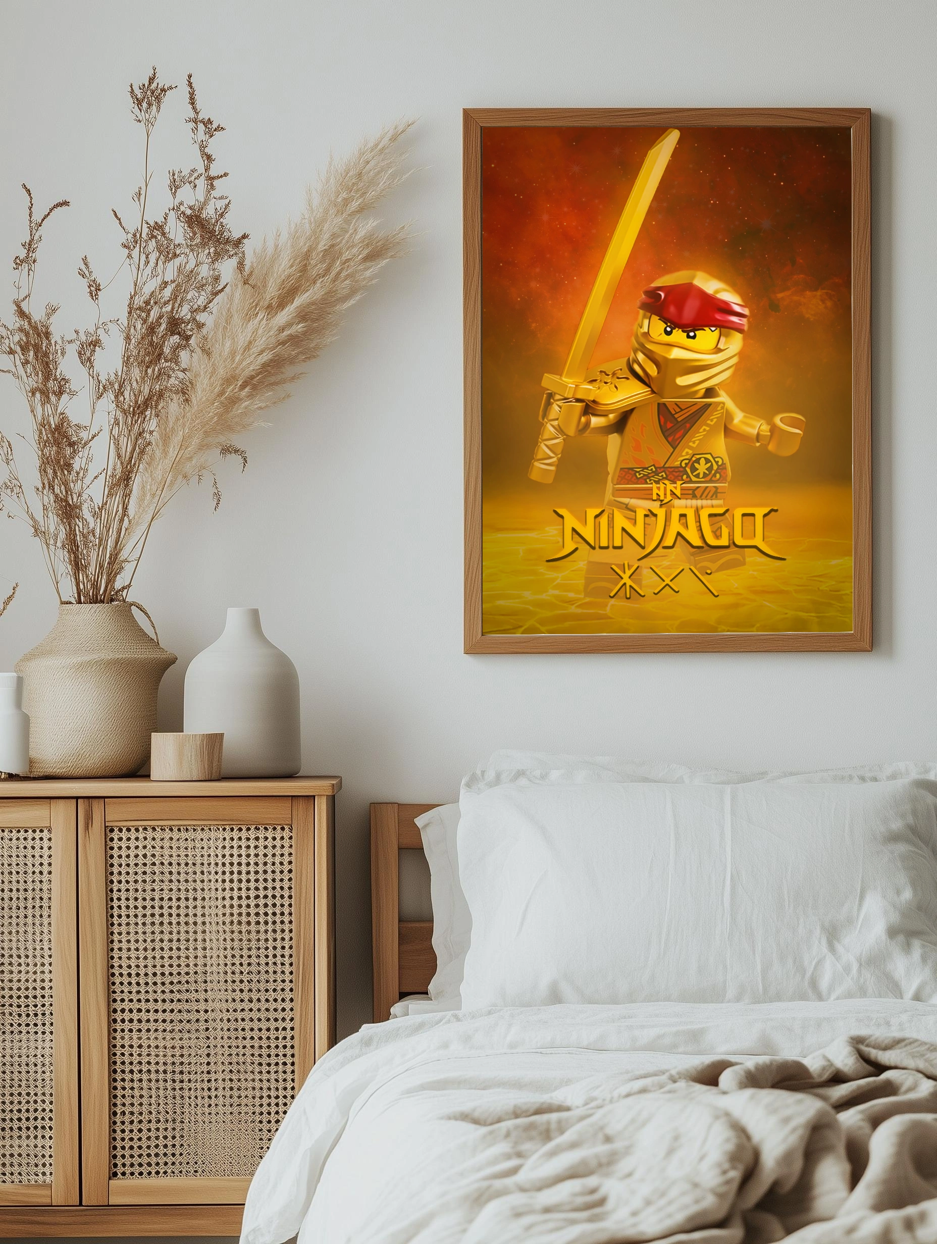 Яркий интерьерный плакат с изображением персонажа из Лего Ниндзяго — золотого ниндзя в полной экипировке с катаной. Эта картина для гостиной или комнаты фаната мультсериала поражает насыщенными золотыми и красными оттенками и создает настроение силы, решимости и приключений. Отличный выбор для декора стен и уникального декоративного плаката.
