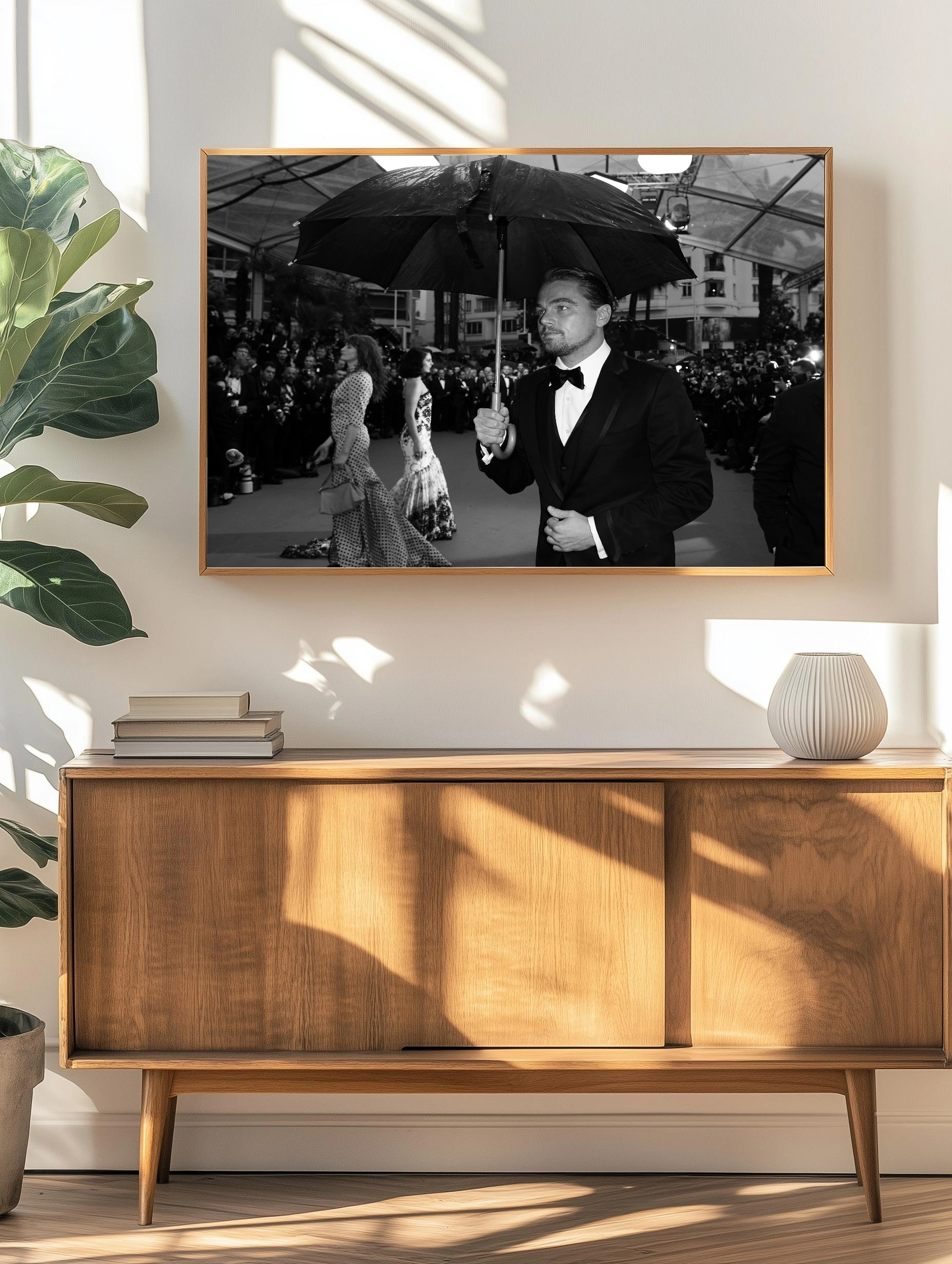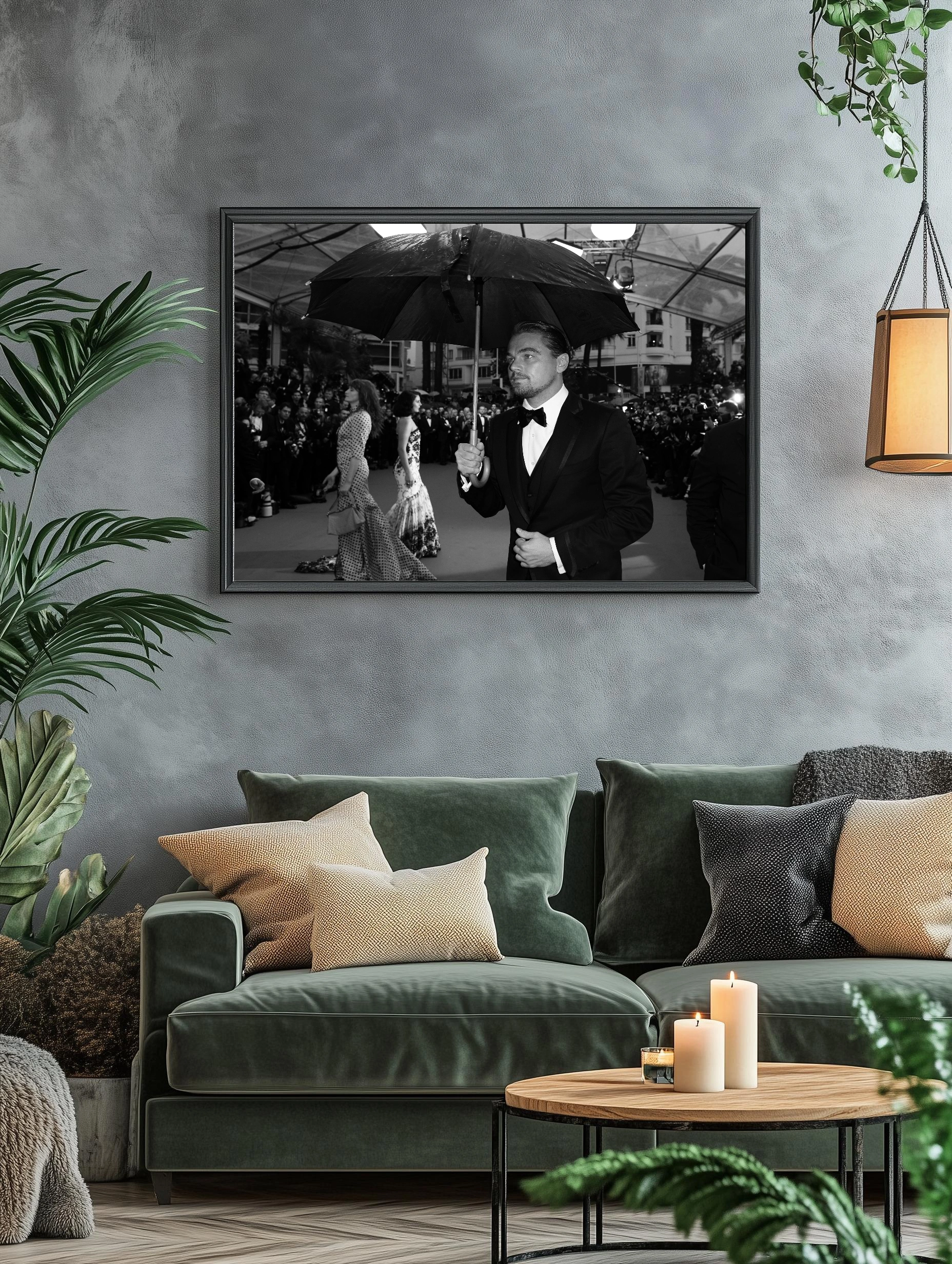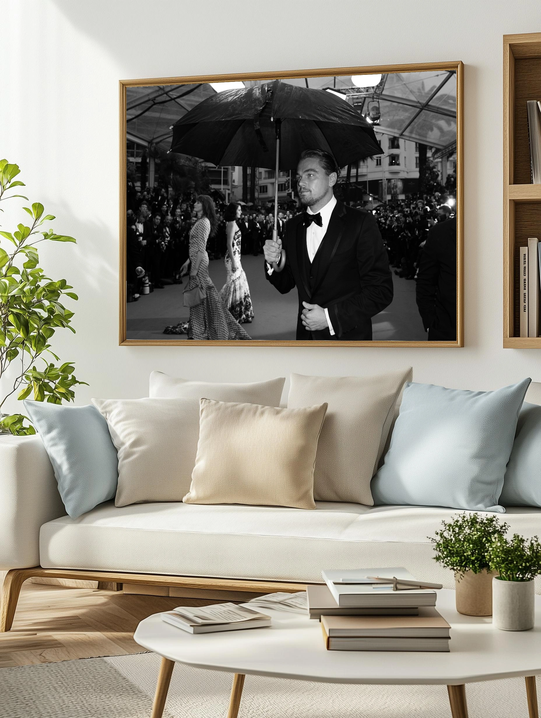 Фотография в черно-белом стиле, отображающая атмосферу гламура и элегантности на красной дорожке. Мужчина в классическом смокинге держит большой зонт, позади него стильные женщины в вечерних платьях и многочисленные фотографы создают атмосферу светского события. Картина для гостиной или офиса подчеркнет утонченность и стиль.