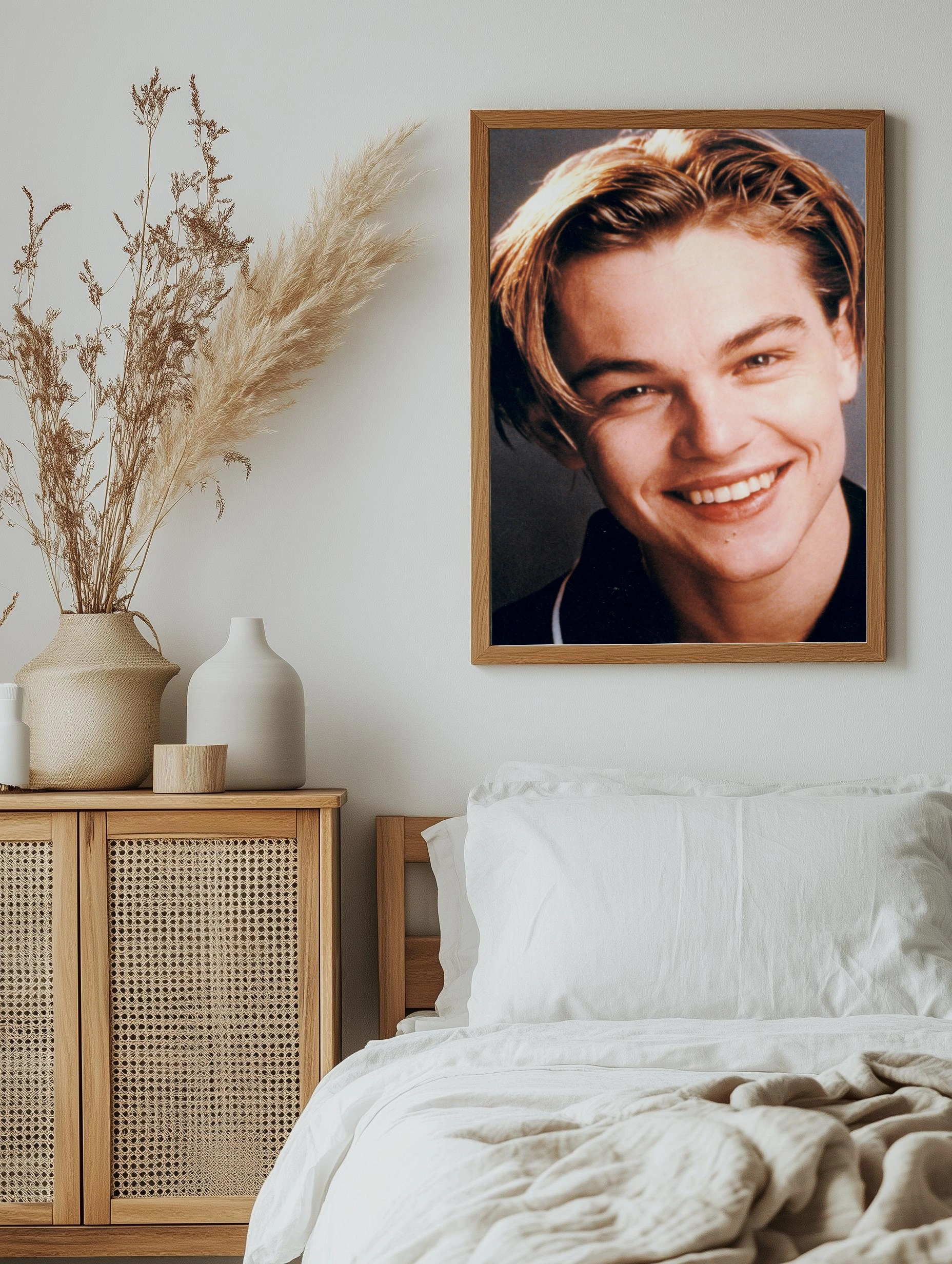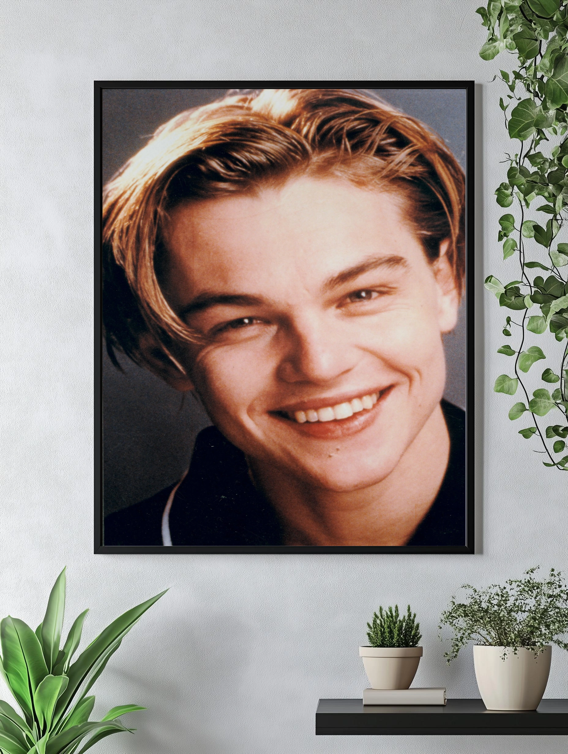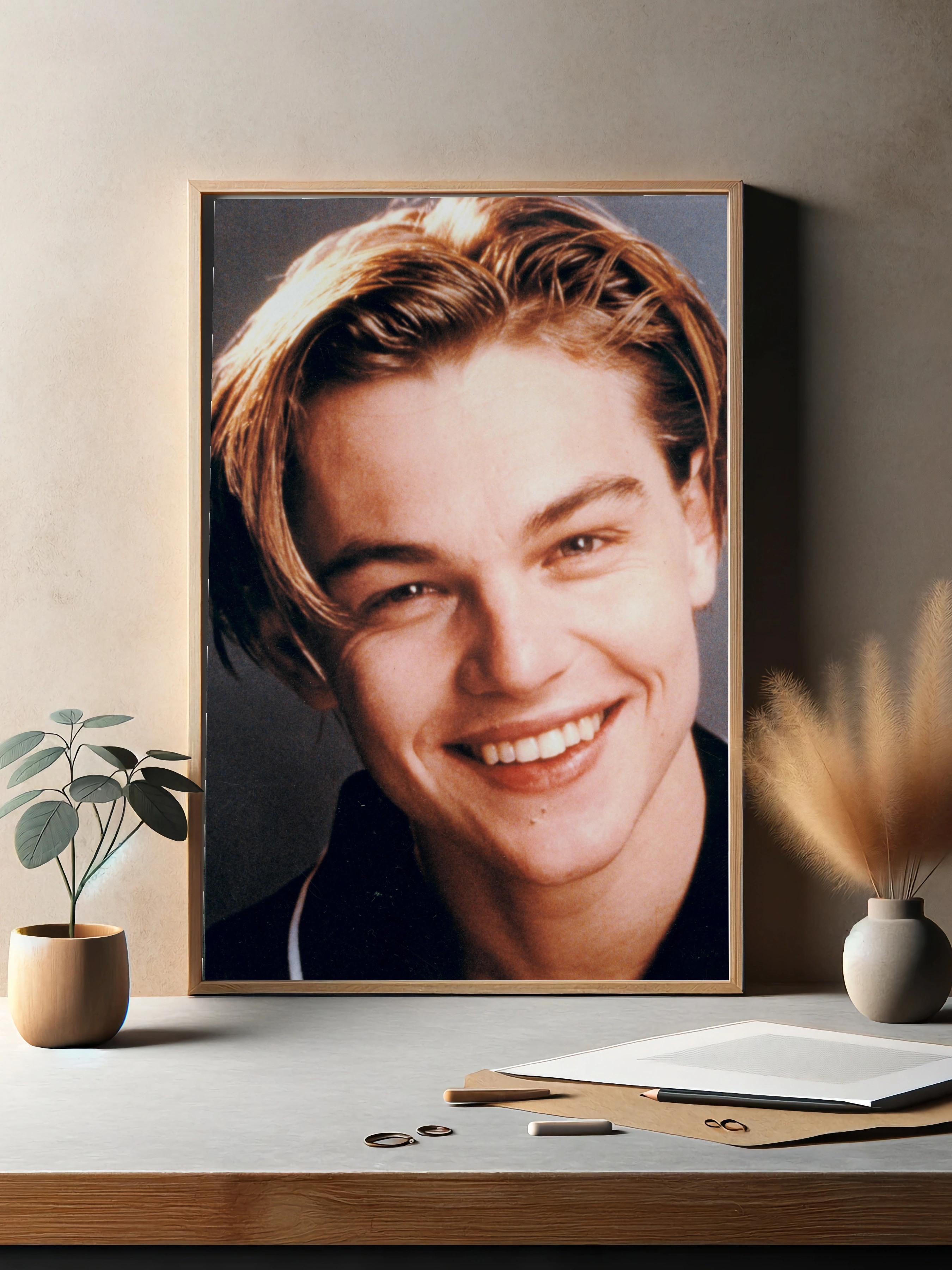 Крупный портрет молодой легенды кино Леонардо Ди Каприо с искренней улыбкой и светлыми волосами подчеркивает его очарование и харизму. Этот интерьерный постер с фотопечатью станет стильным декором стен и декоративной картиной для гостиной или офиса.