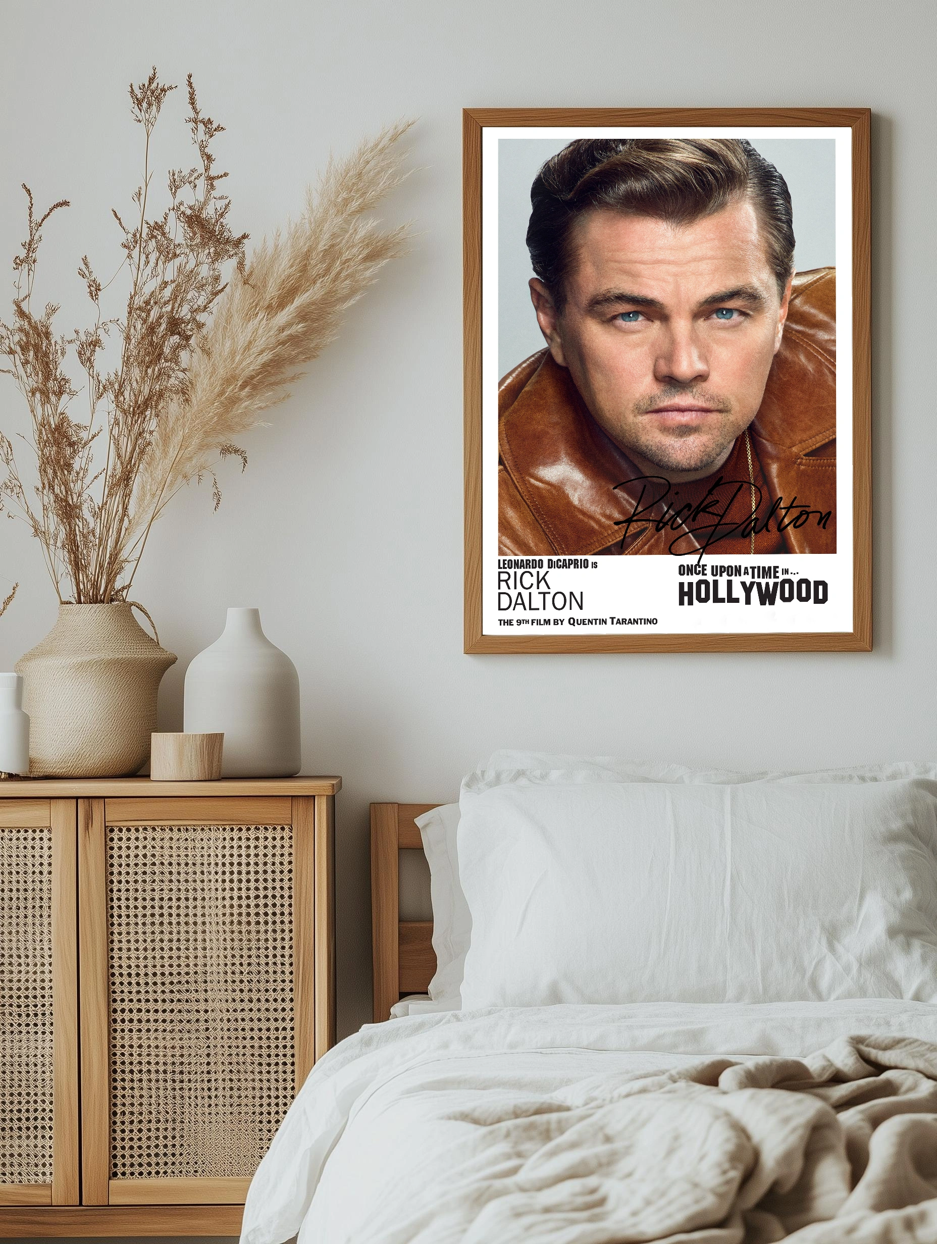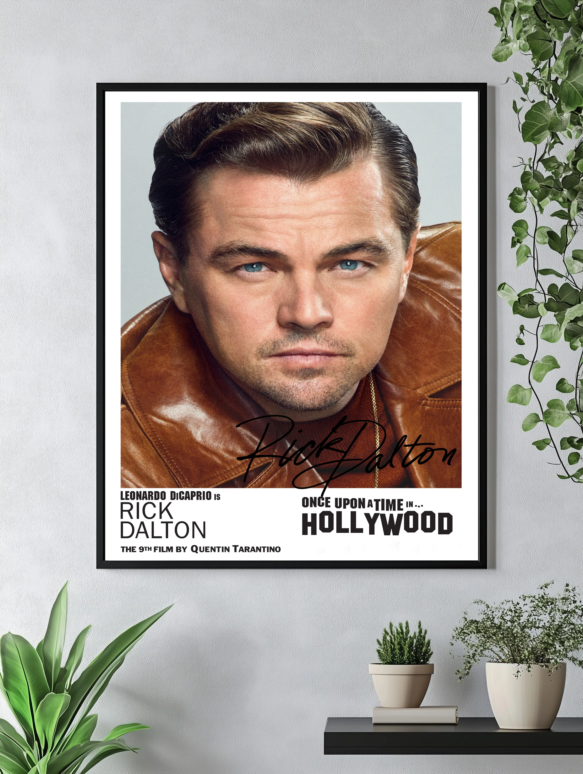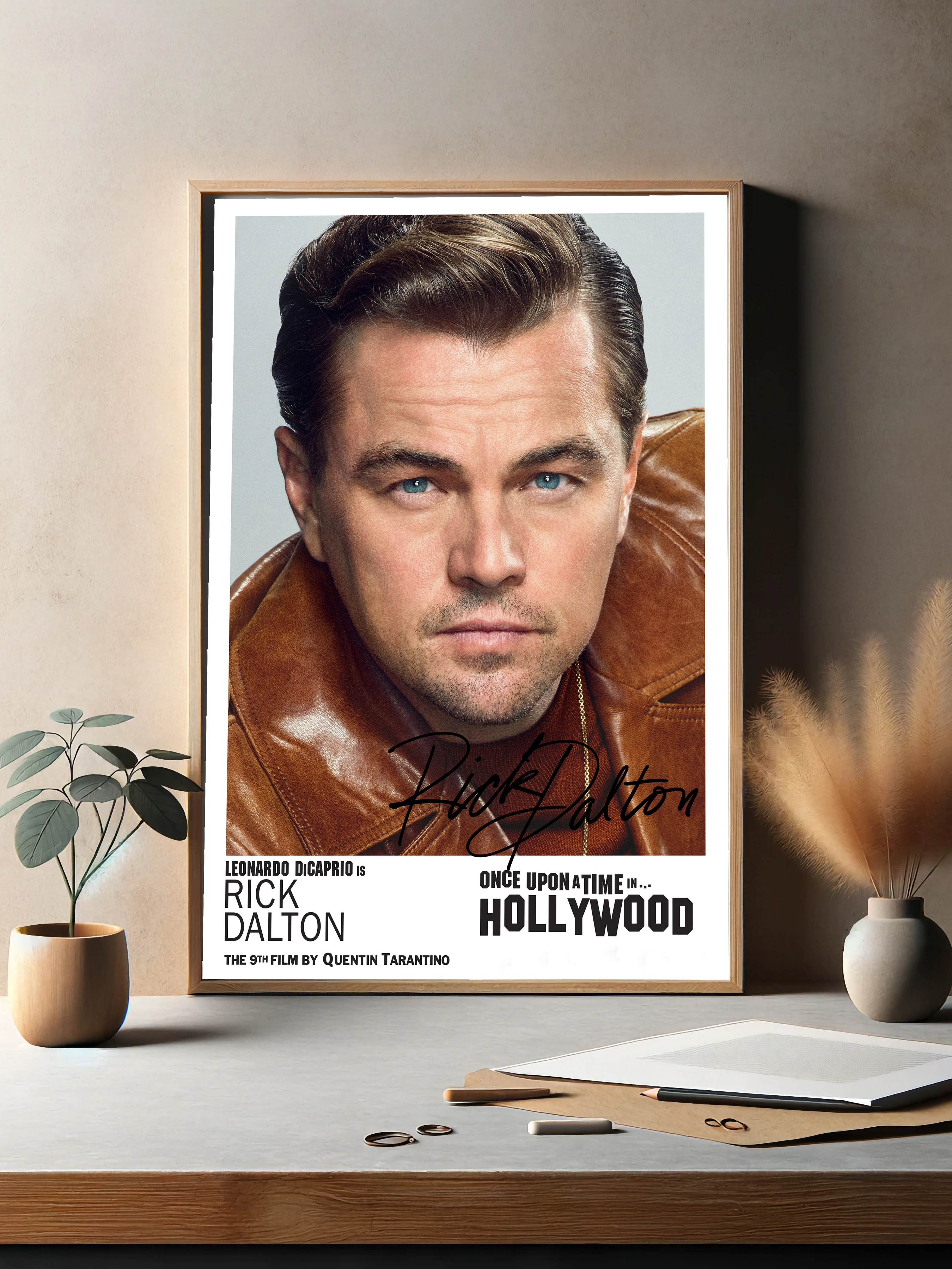 Яркий интерьерный плакат с портретом Леонардо ДиКаприо в образе Рика Далтона из фильма «Однажды в Голливуде» Квентина Тарантино. Картина для гостиной или офиса с акцентом на реалистичный стиль и насыщенную цветовую палитру. Отличный декоративный плакат для поклонников кино и современного искусства для стен.