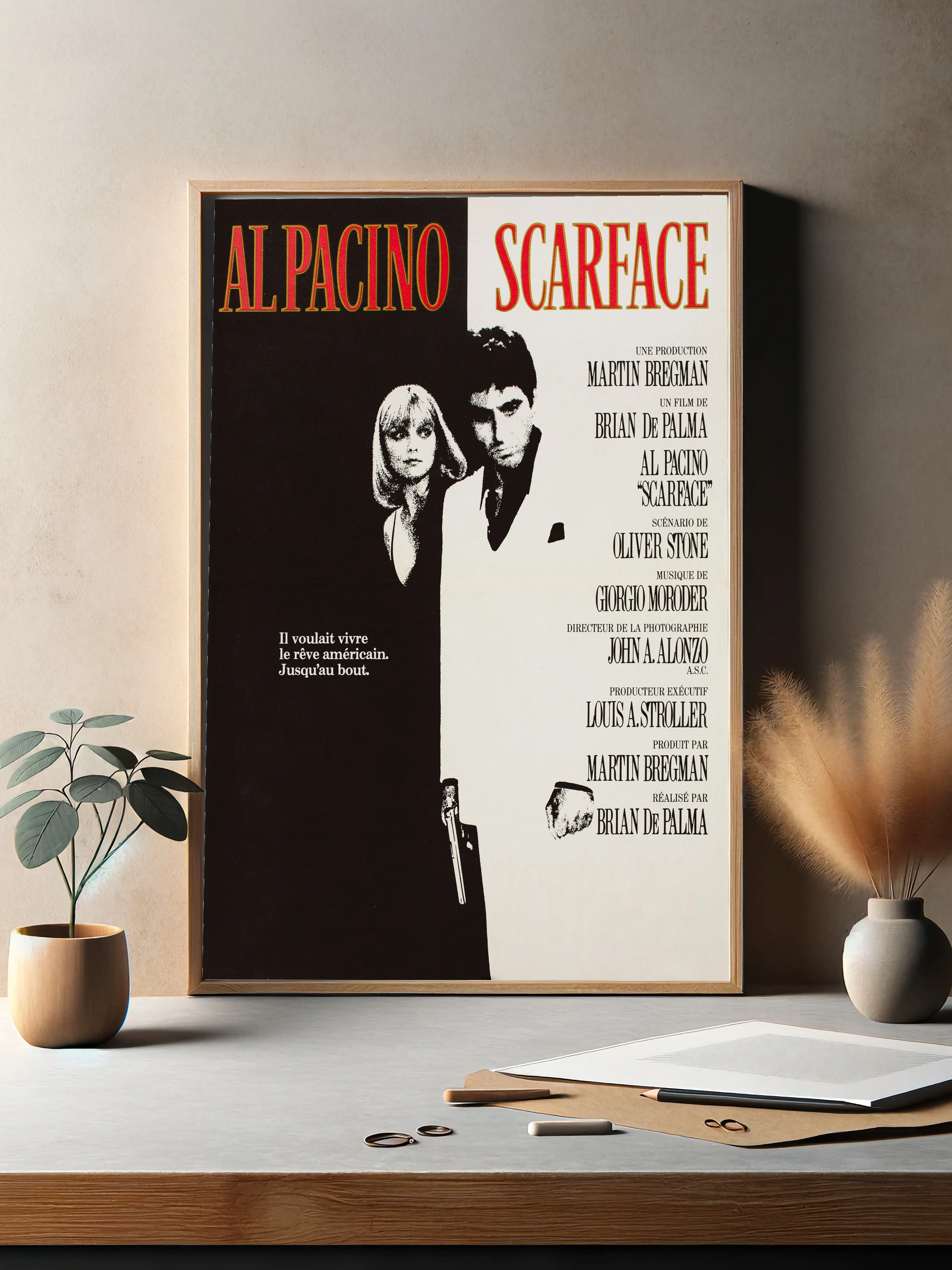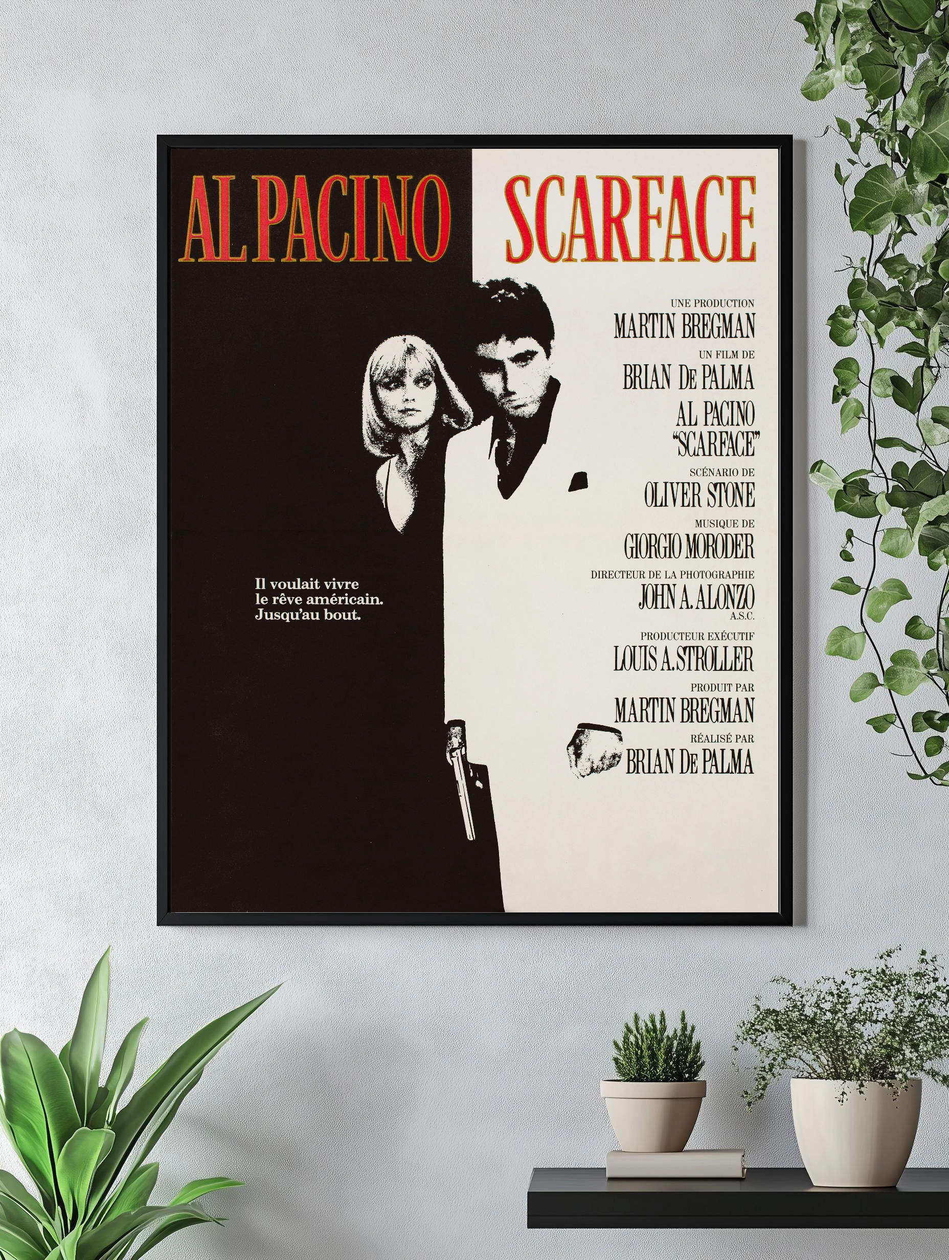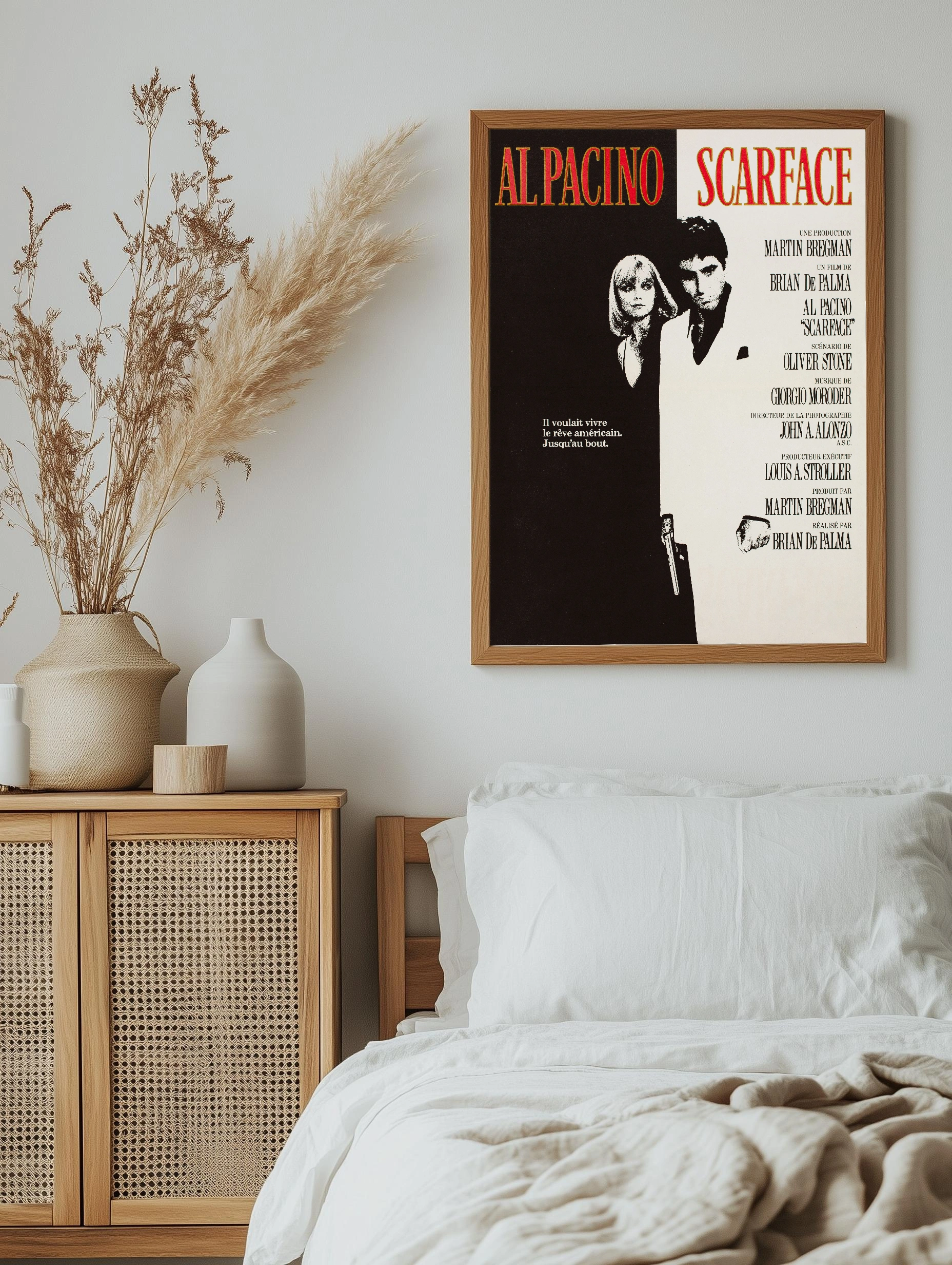 Этот интерьерный арт с изображением Аль Пачино из культового фильма «Scarface» выполнен в стиле минимализм с акцентом на контраст чёрного и белого. Красные надписи добавляют драматизма и подчеркивают атмосферу классического гангстерского кино. Идеальный художественный плакат для офиса или гостиной.