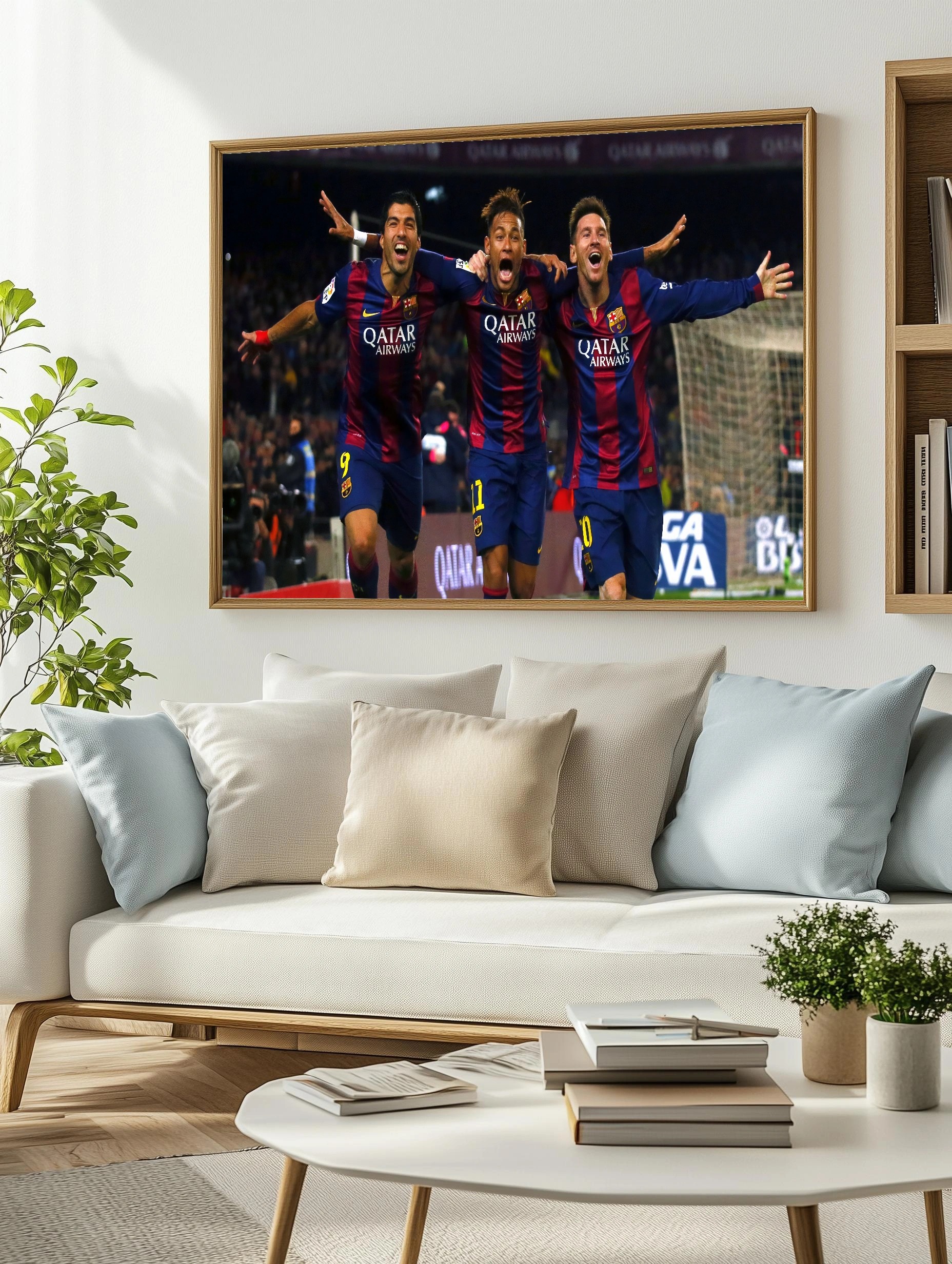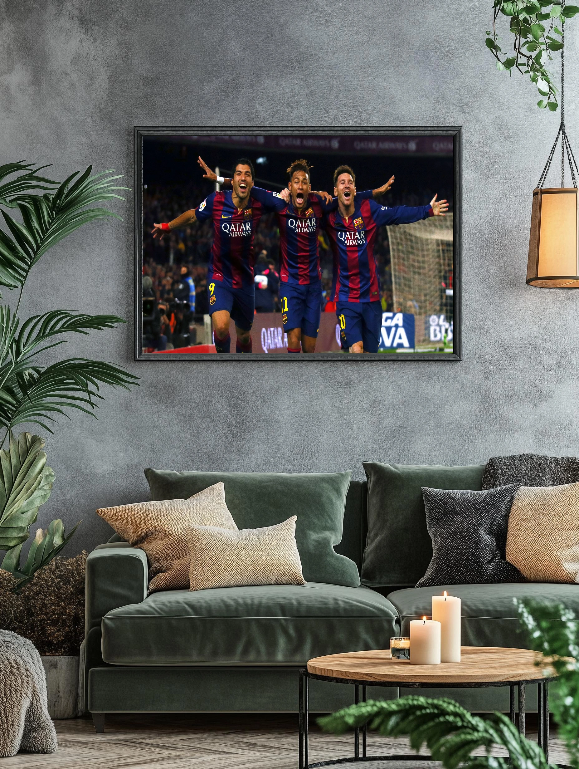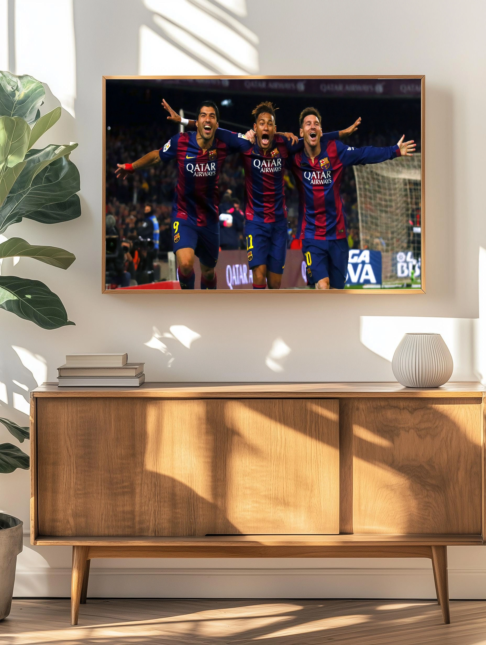 Фотография запечатлевает три знаковых футболиста Барселоны – Луиса Суареса, Неймара и Лионеля Месси, объединённых безграничной радостью после успешного момента матча. Энергия и эмоции моментально передают дух спорта и командного единства. Яркие цвета клубной формы создают динамичное сочетание, которое станет стильным декоративным акцентом в интерьере любого болельщика.