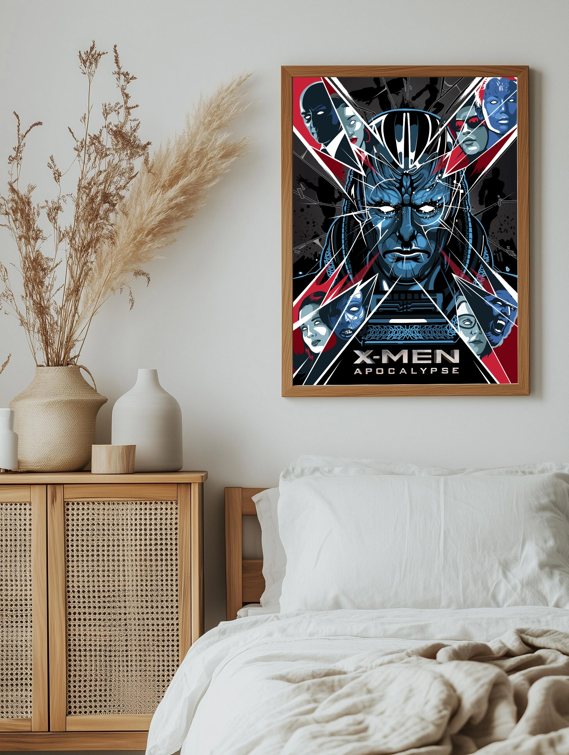 Яркое и динамичное изображение главного антагониста фильма ‘Люди Икс: Апокалипсис’ — Апокалипсиса, окруженного ключевыми персонажами Людей Икс. В центре доминирует его мрачный и мощный образ с белыми светящимися глазами, на фоне жестких геометрических линий в красных, черных и синих тонах. Картина отлично подойдет как интерьерное искусство для фанатов комиксов и кино, добавляя стильный декор стен современного искусства для гостиной или офиса.
