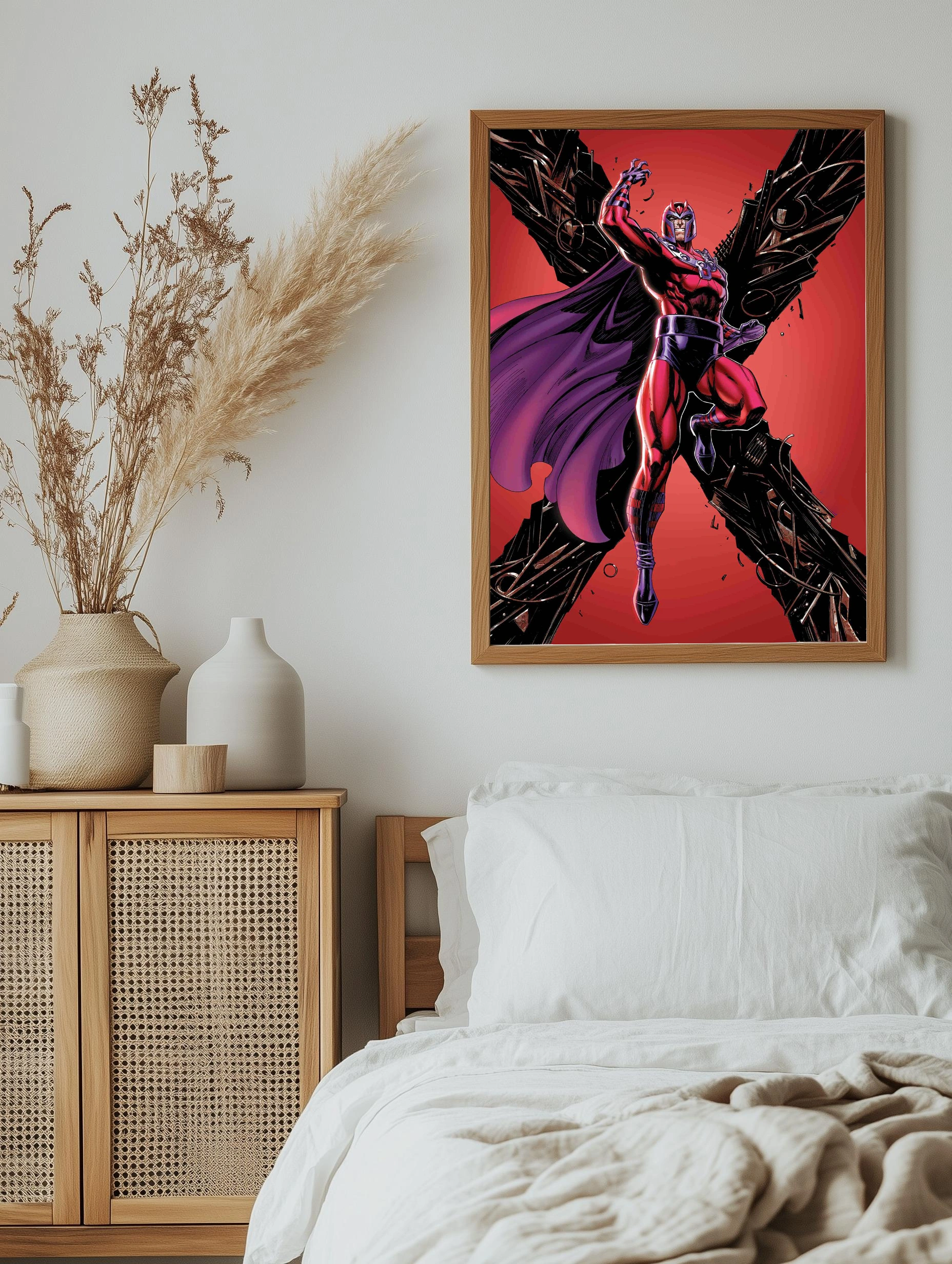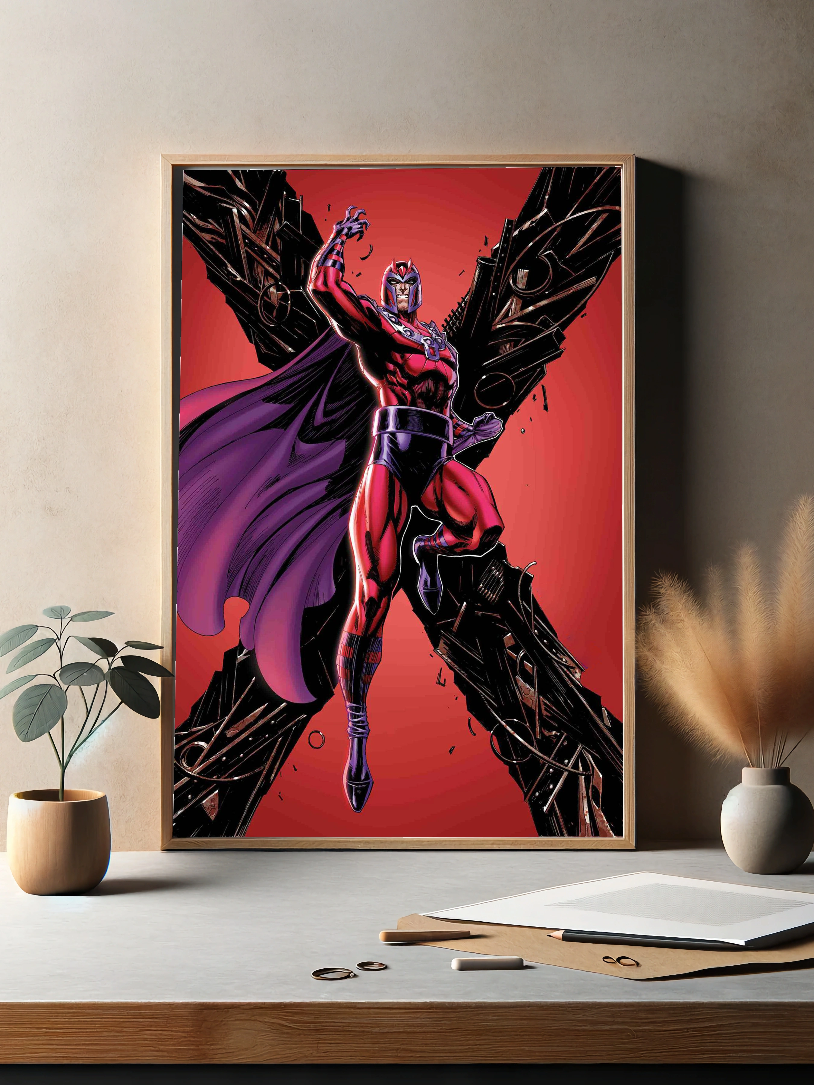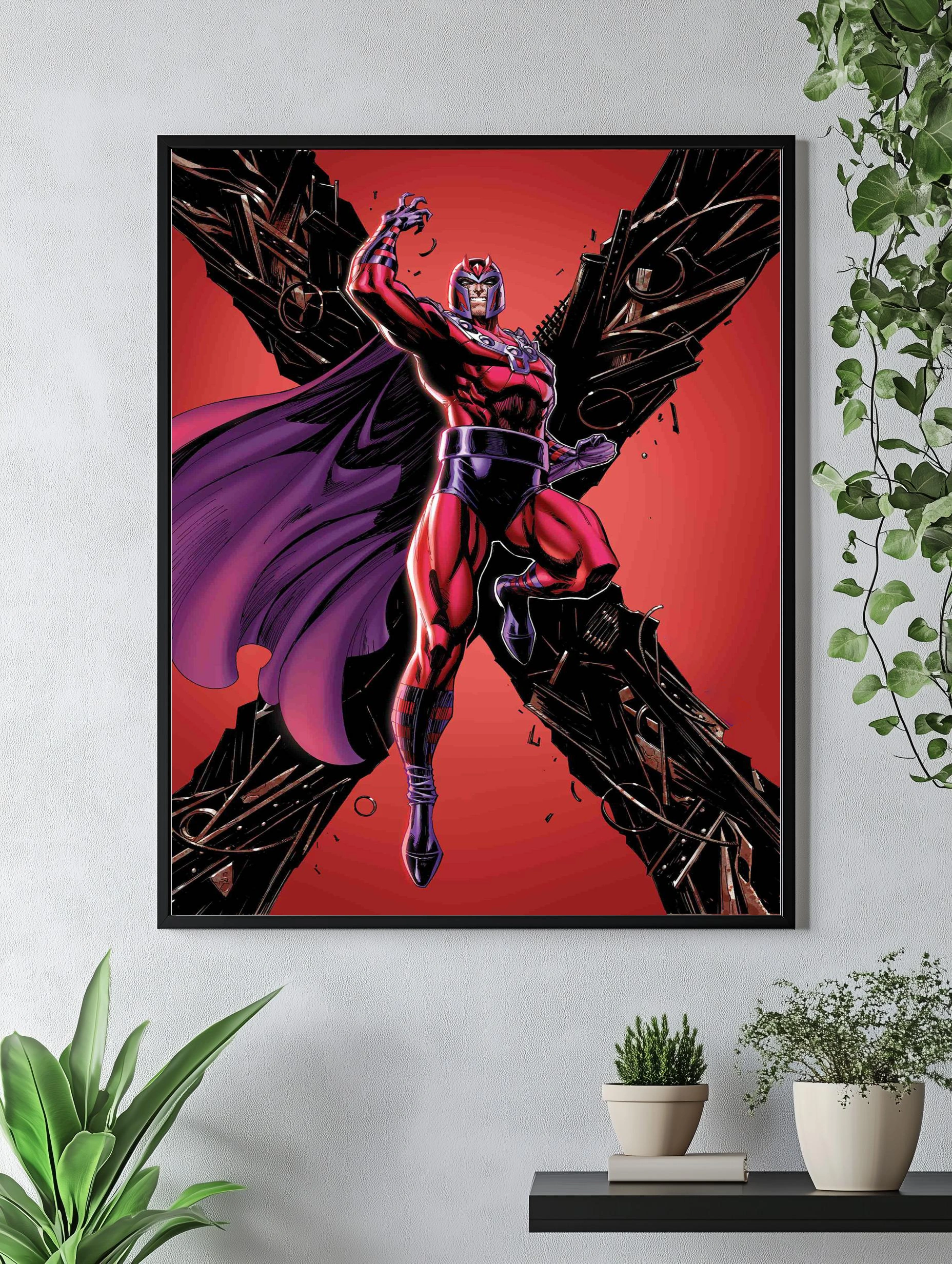 На изображении представлен Магнето — один из самых известных персонажей вселенной Marvel. Он изображён в характерном костюме красного и пурпурного цвета на фоне красного градиента с разлетающимися металлическими обломками, подчёркивающими его магнетические способности. Этот интерьерный постер в стиле комиксов станет стильным декором для офиса или гостиной, идеально подходит любителям современного искусства для стен.