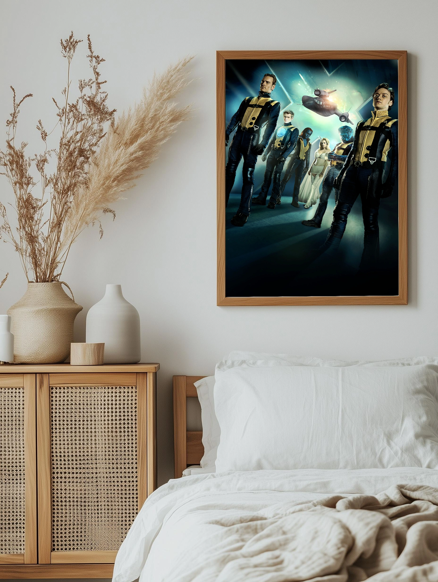 На изображении показана группа известных персонажей из серии Люди Икс в их характерных желто-синих костюмах. Они стоят мощной командой в драматичном освещении на фоне светящегося логотипа X-Men. Это интерьерное искусство с атмосферой силы и единства, идеально подходит для декора любой комнаты.