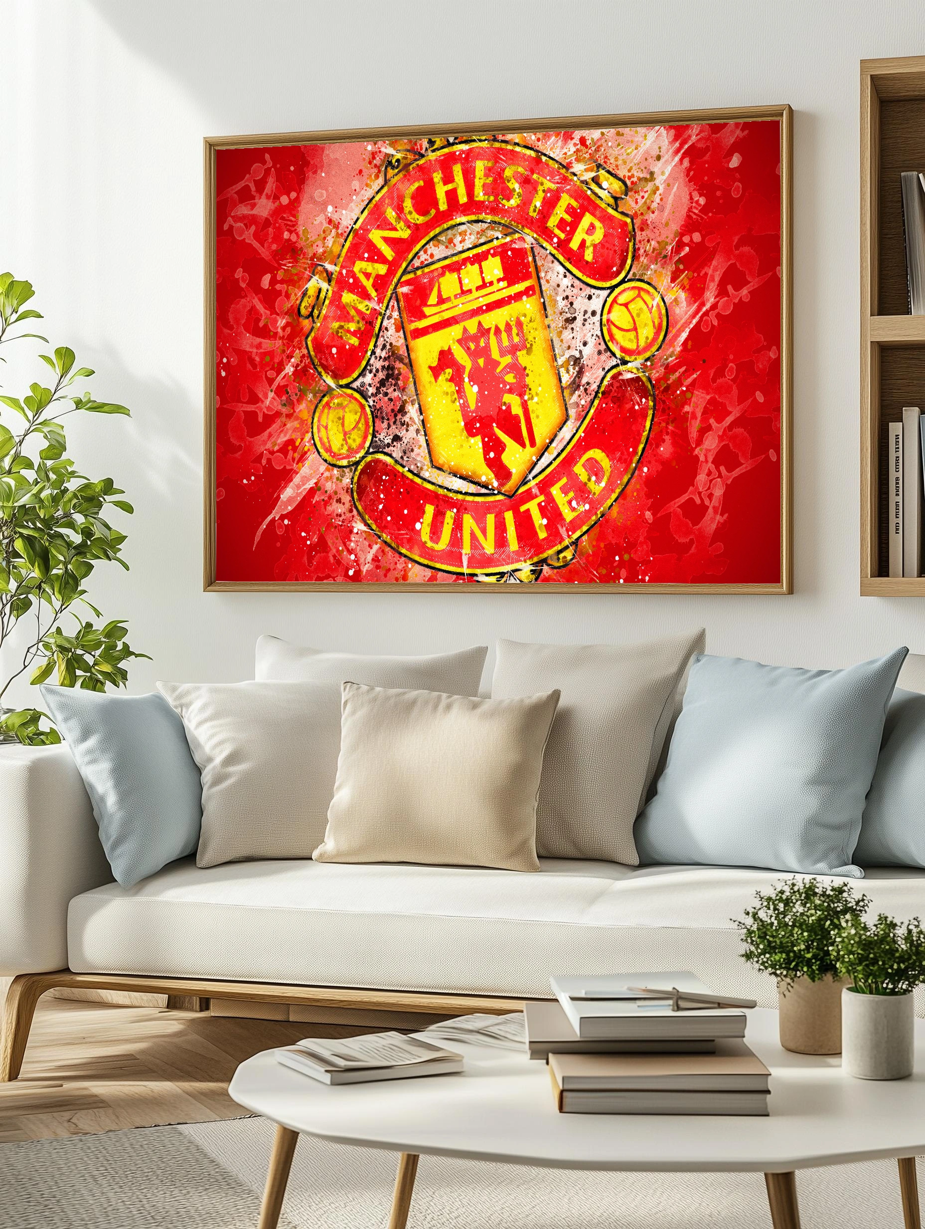 Яркая картина с эмблемой клуба Manchester United, выполненная в стиле акварели с эффектом разбрызгивания красок. Красный и жёлтый выделяют главные элементы логотипа, создавая динамичное настроение. Идеально подходит как интерьерный арт для гостиной или офиса футбольного фаната.