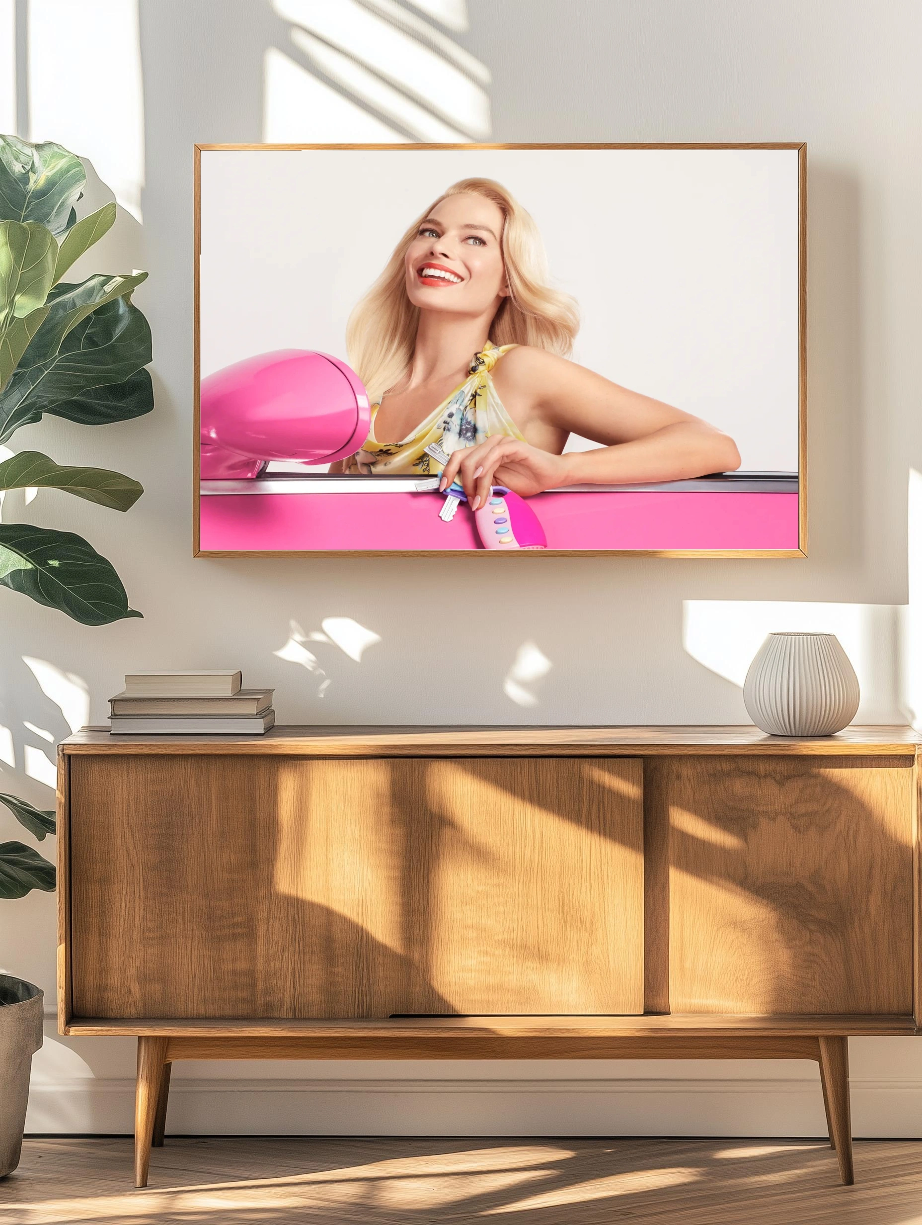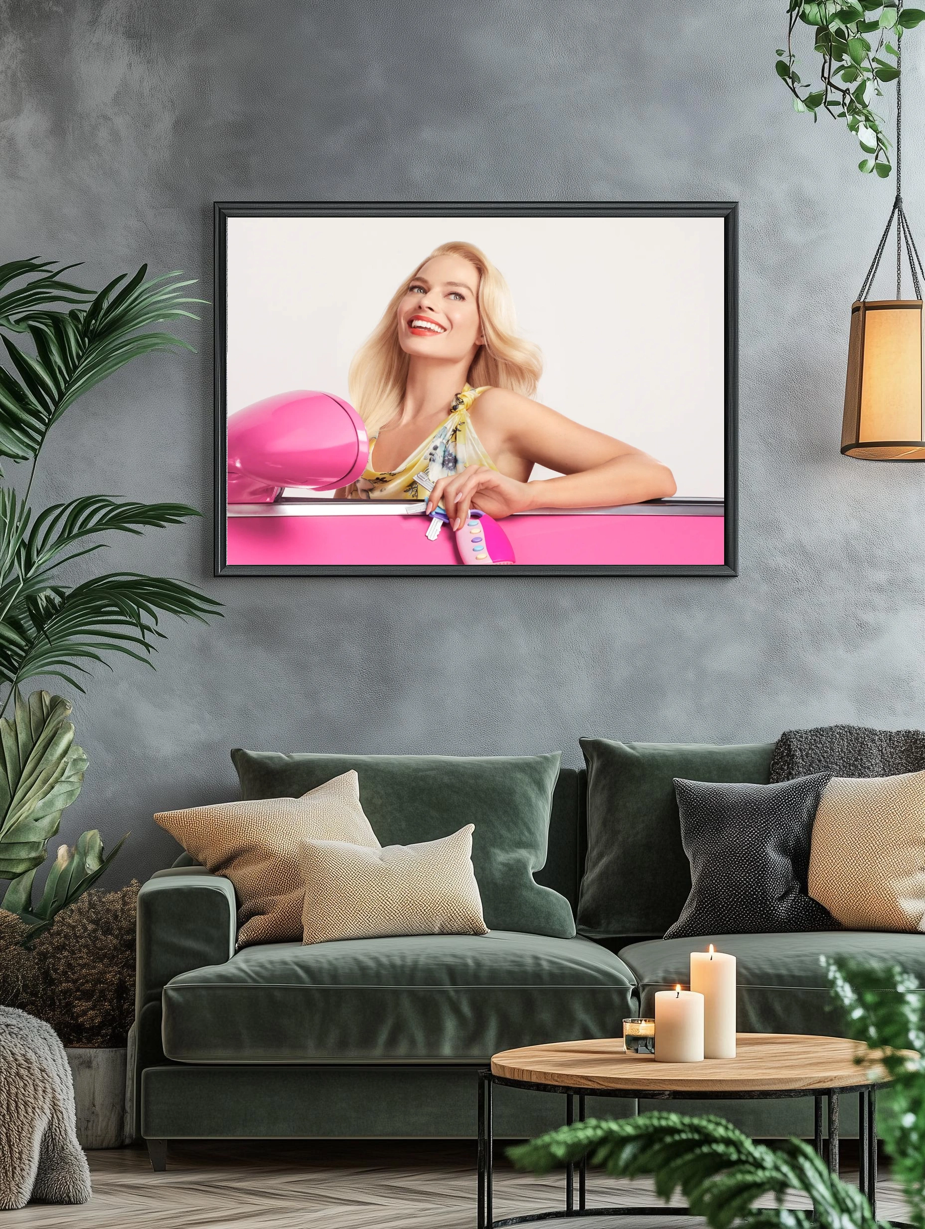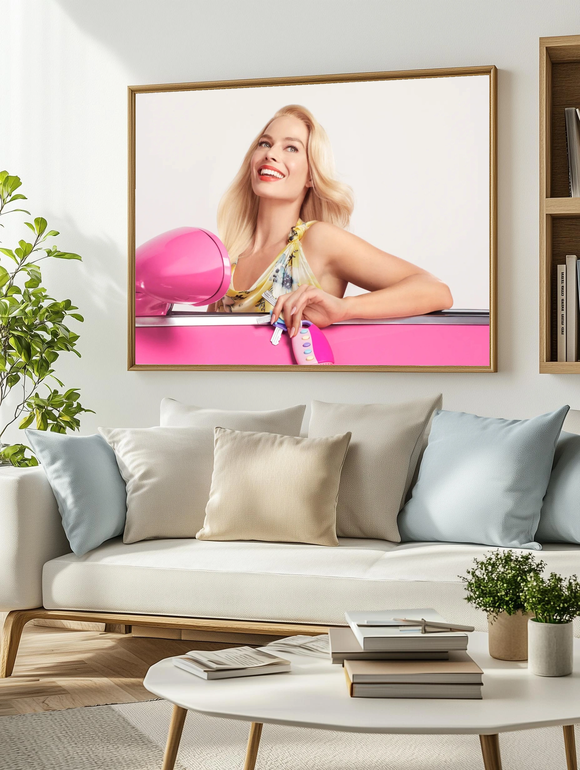 На изображении молодая женщина с длинными светлыми волосами и яркой улыбкой позирует на фоне ярко-розового автомобиля. Она одета в лёгкое платье с цветочным принтом, создающее свежий и летний образ. Этот интерьерный фотоартикул идеально подходит для современного искусства стен, добавляя яркости и позитива в любую гостиную или спальню.