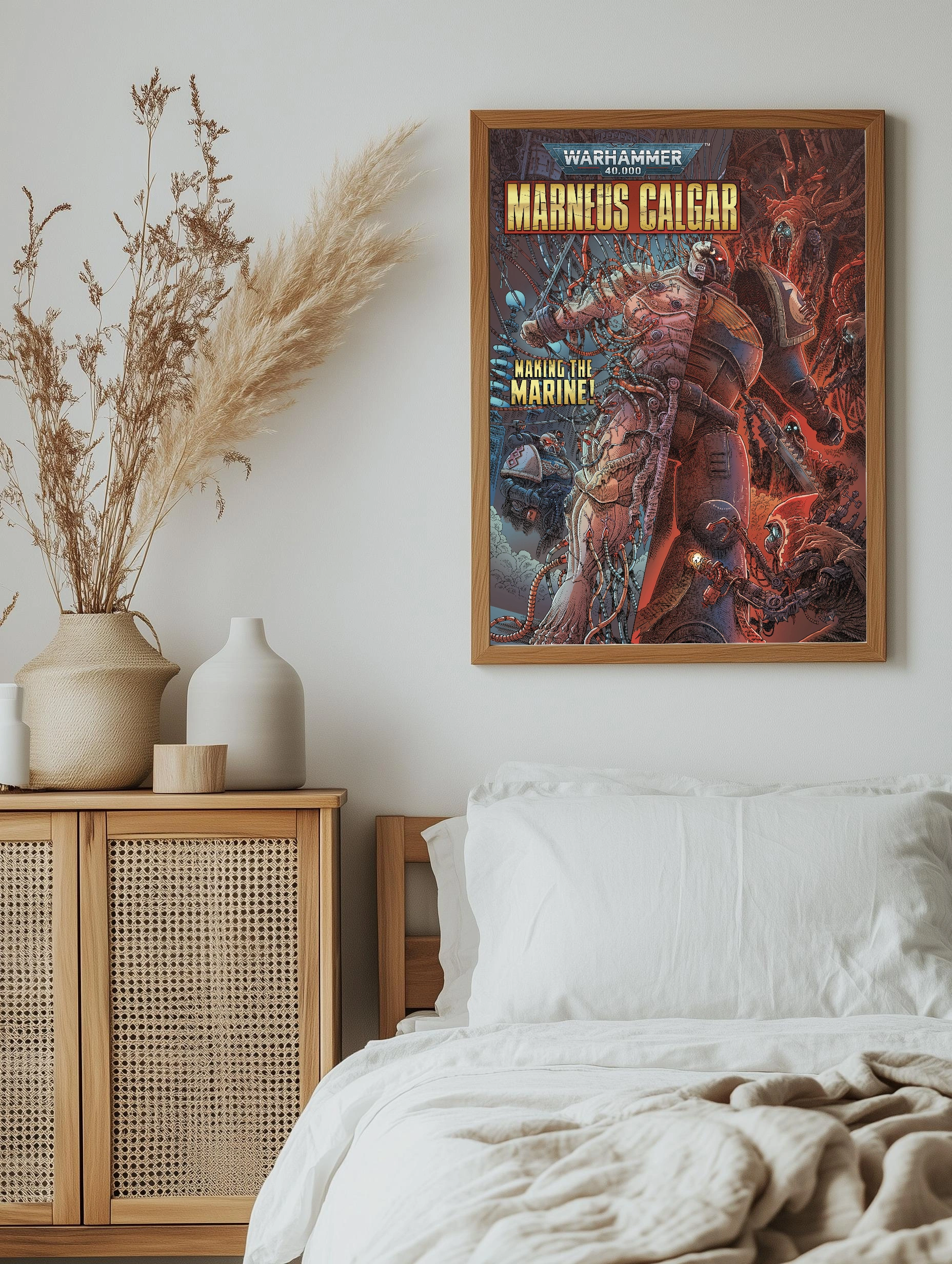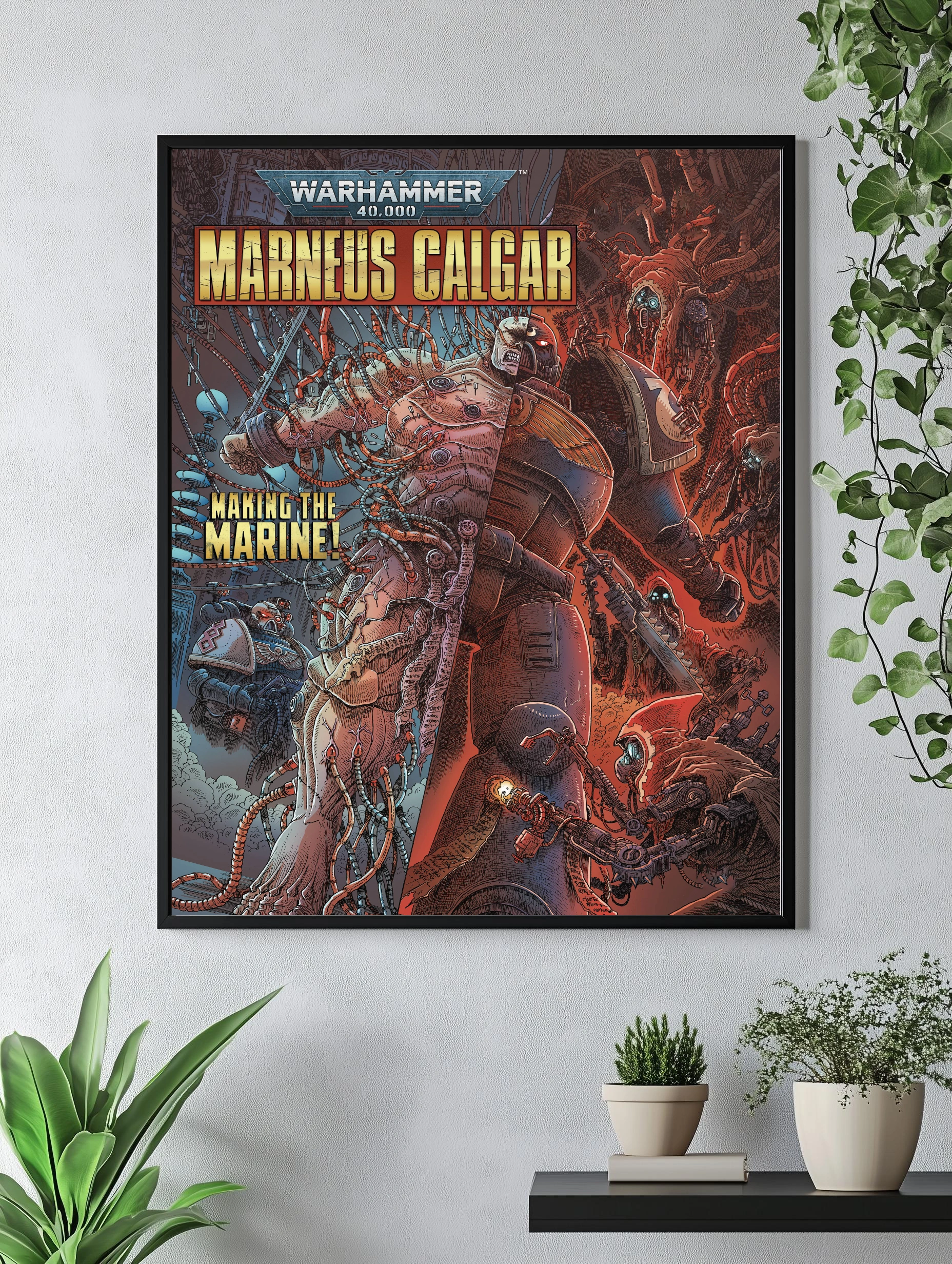 Изображение представляет собой динамичную сцену из вселенной Warhammer 40,000, с героем Marneus Calgar, изображённым в мощных доспехах. Стилистически это детализированная иллюстрация с элементами киберпанка и мрачной фантастики, где баланс между техникой и человечностью подчёркнут проводами и кибернетическими имплантами. Идеально подходит как интерьерное искусство и декоративный плакат для поклонников жанра.