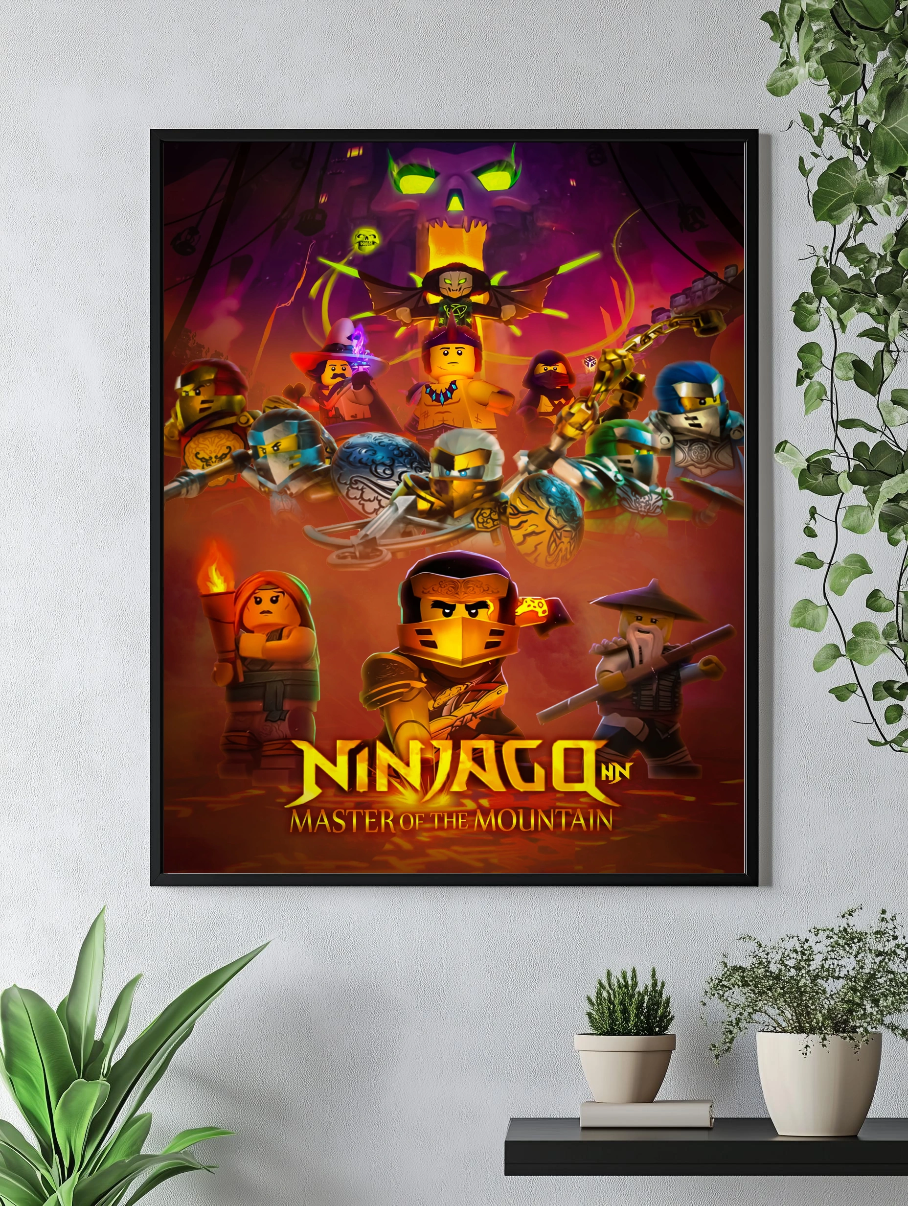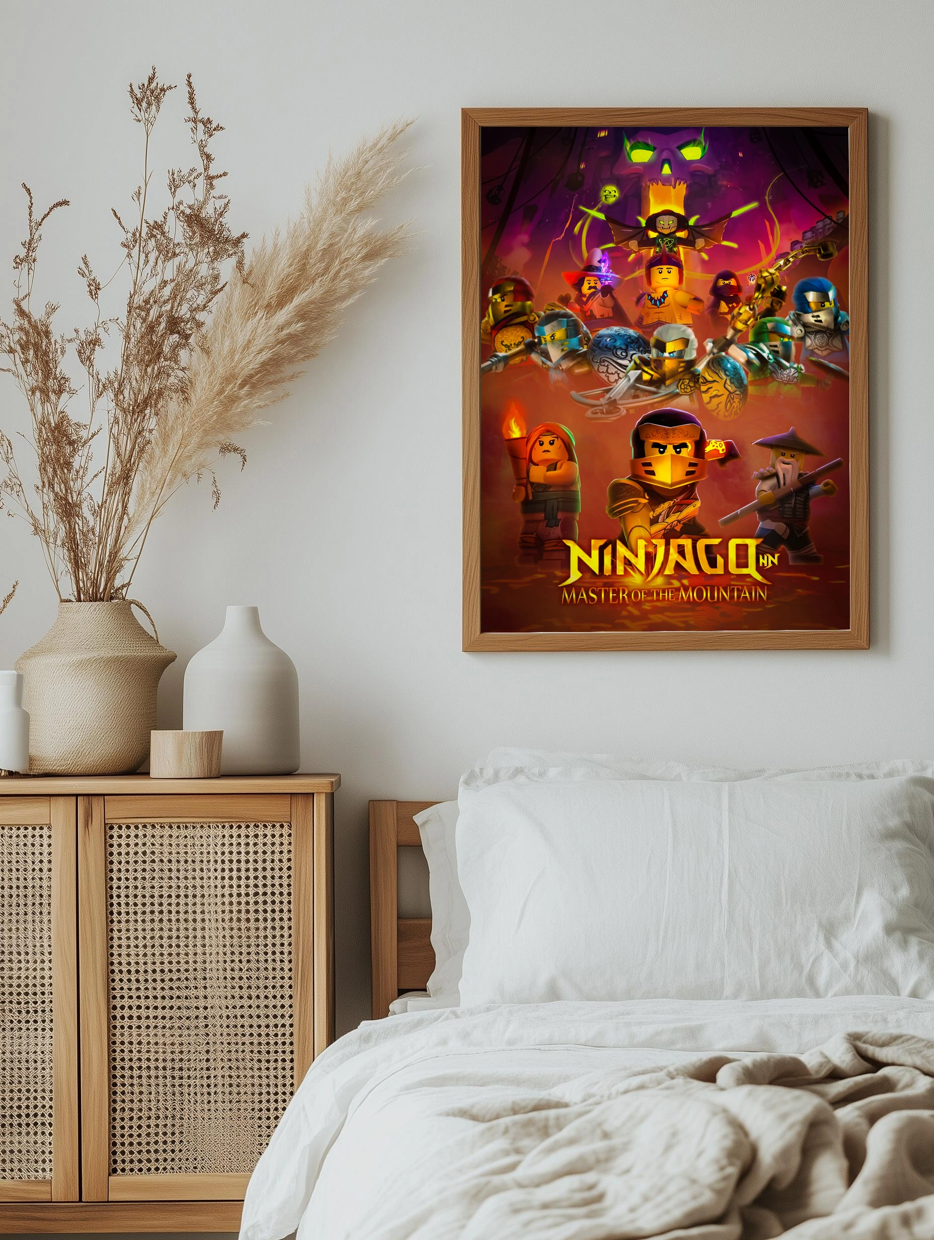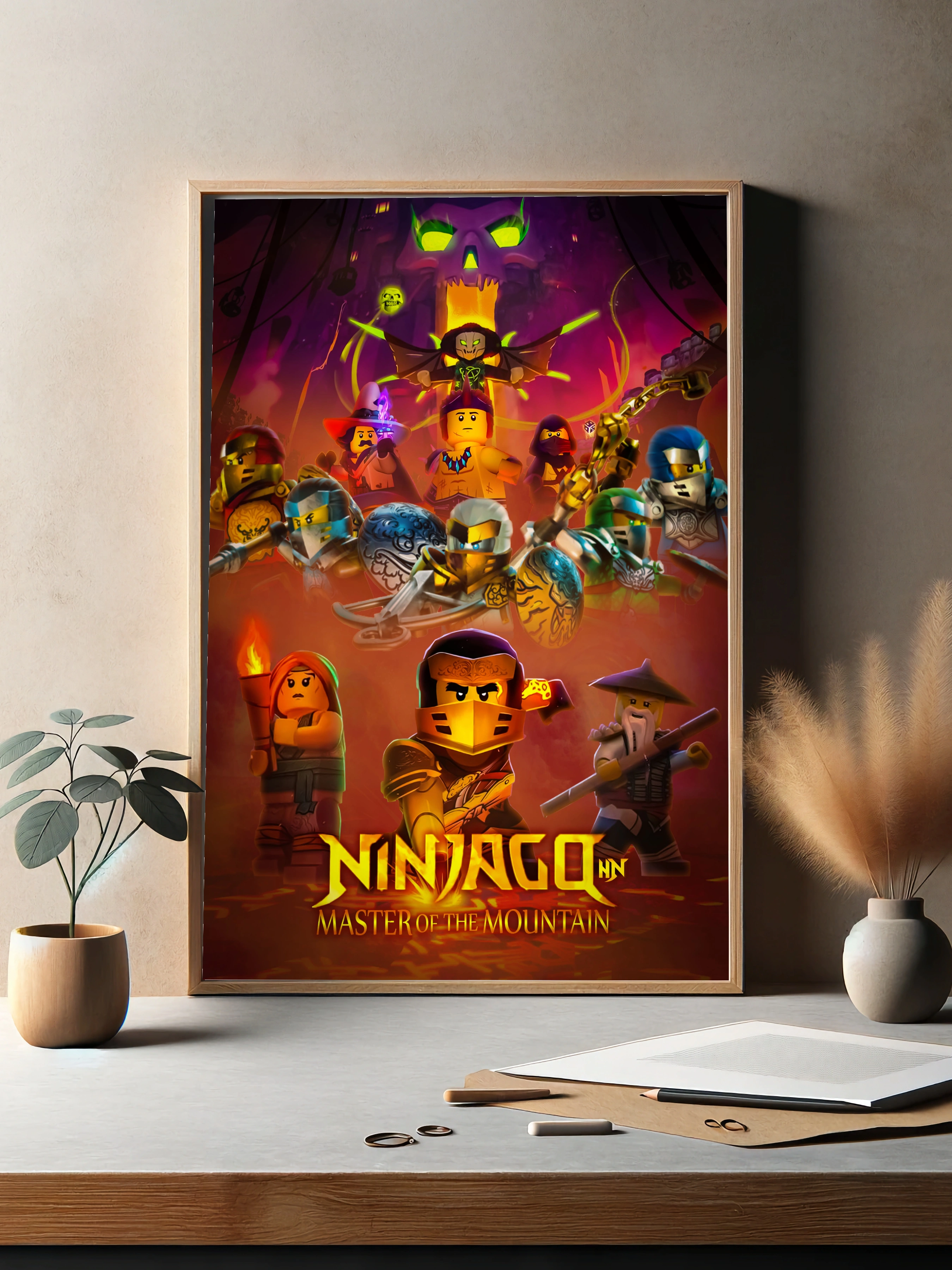 Яркий интерьерный арт с персонажами Лего Ниндзяго, изображающими воинов-ниндзя в динамичном эпическом сюжете. Светящиеся зелёные глаза черепа и тёплые оттенки огня создают современное искусство для стен с элементами загадочности и героизма. Идеально для декора комнаты, офиса или гостиной.