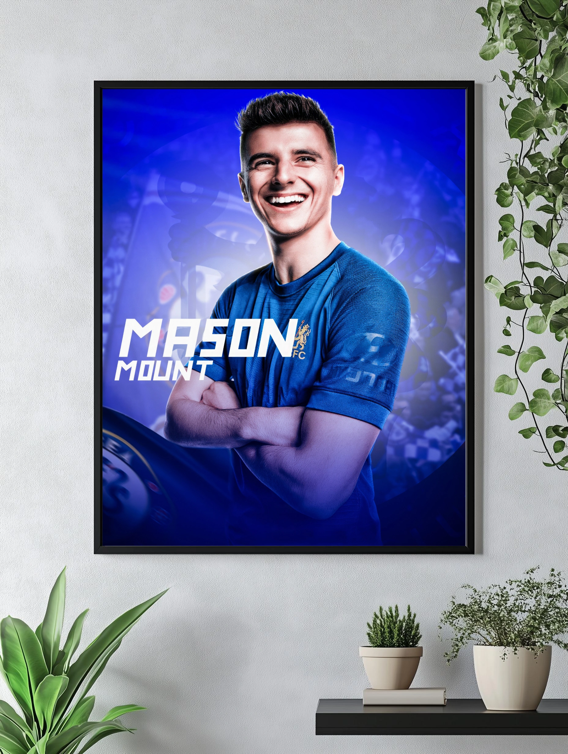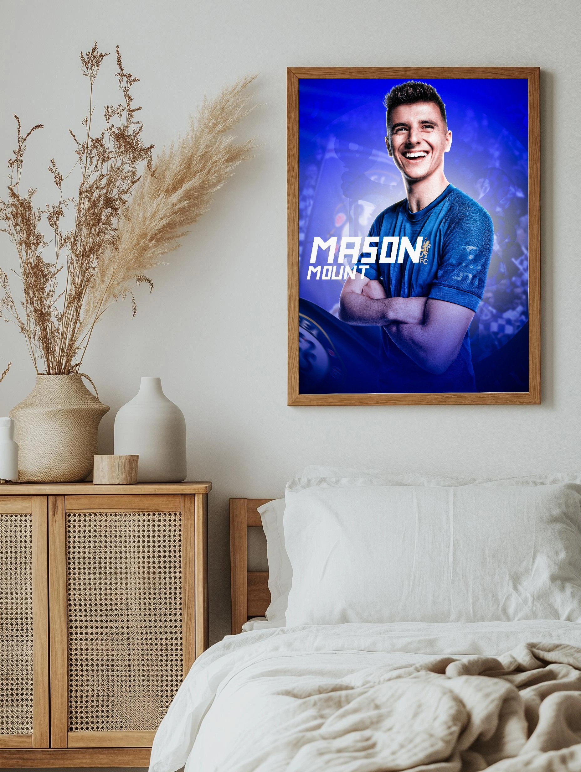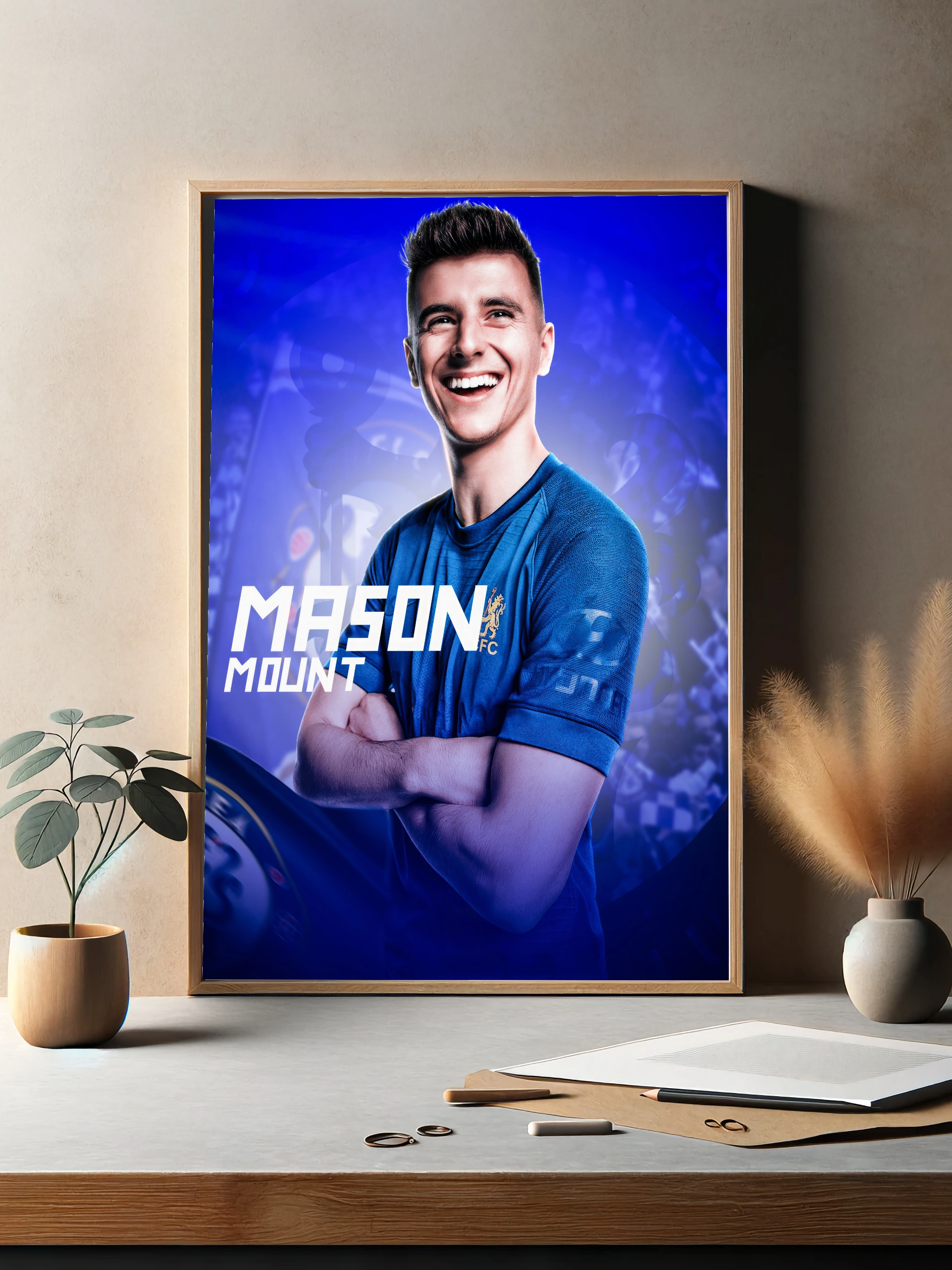 Изображён Мейсон Маунт – известный английский футболист в форме клуба Челси, на фоне синих и фиолетовых оттенков, передающий настроение позитива и уверенности. Картина для гостиной или офиса, интерьерное искусство с выразительным художественным стилем и фотопостер с ярким, современным дизайном.
