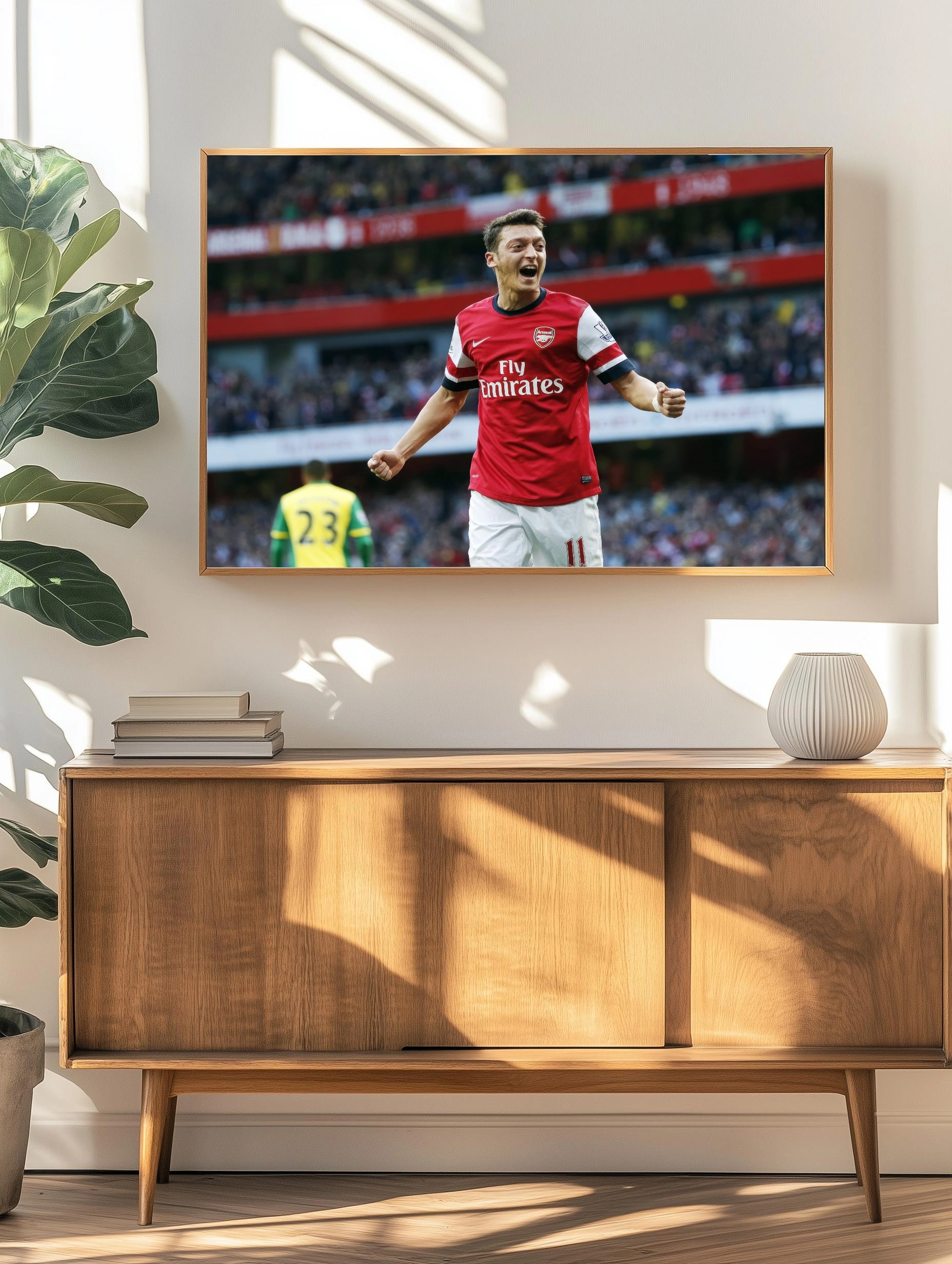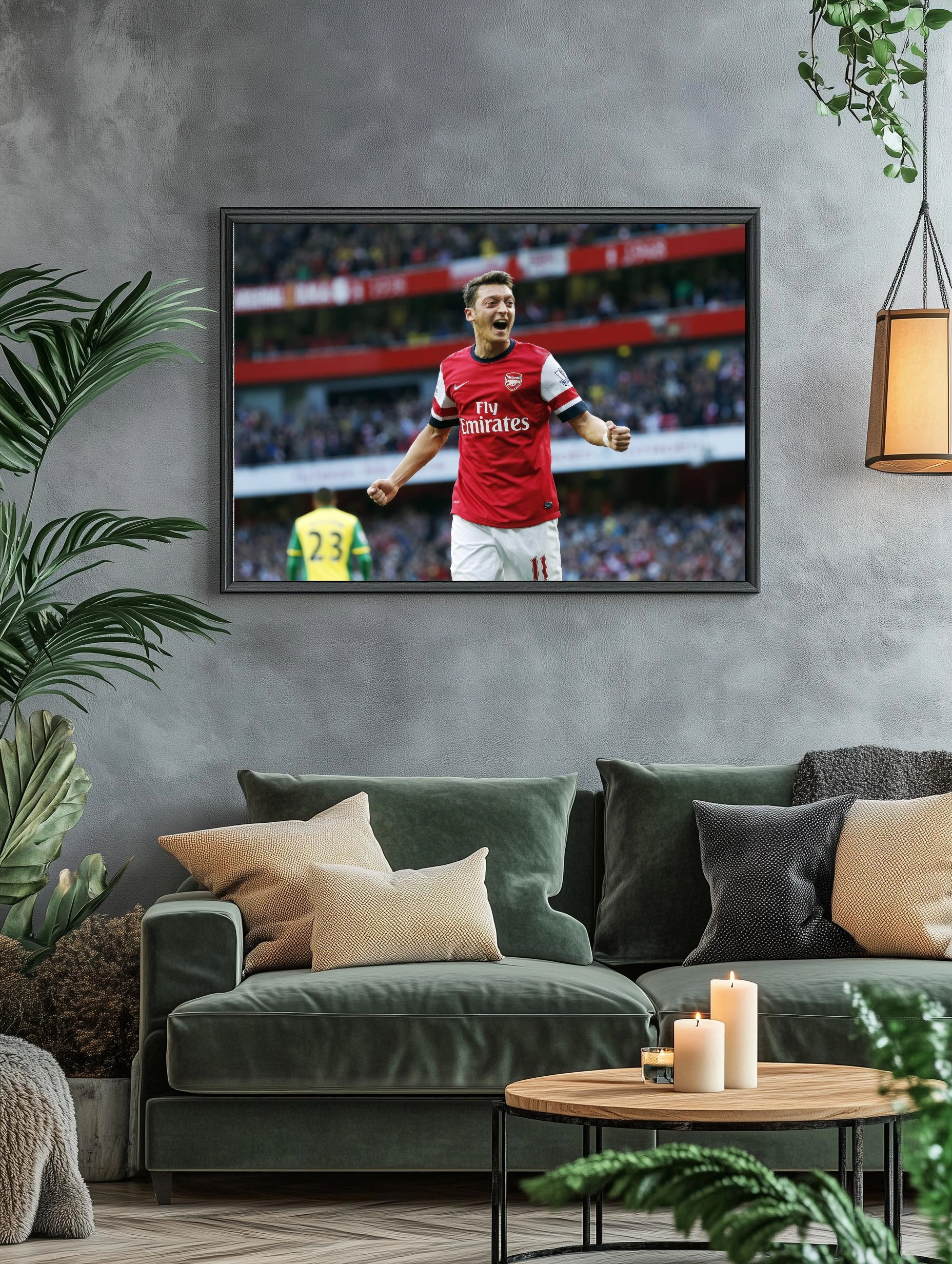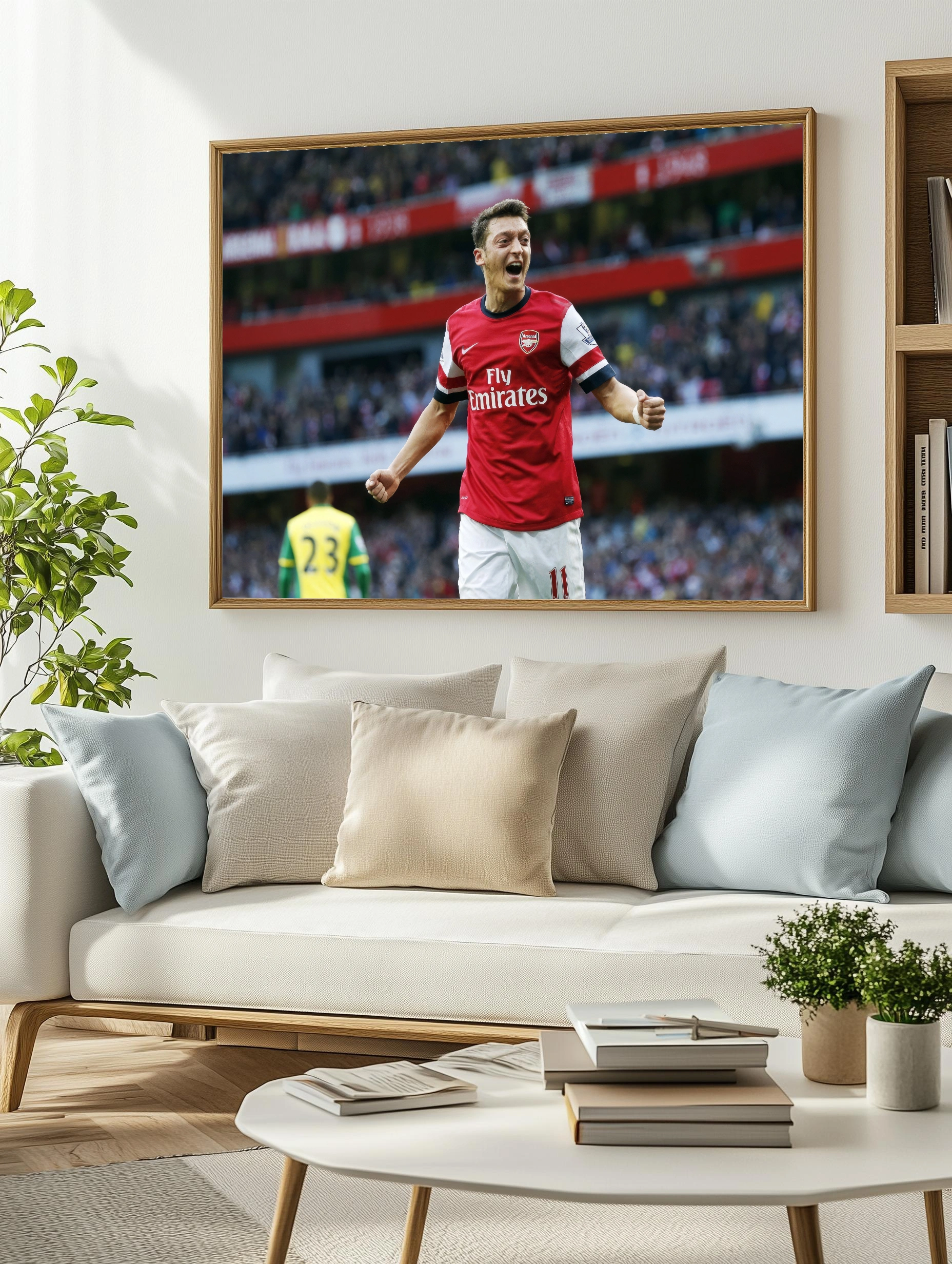 Декоративный плакат с изображением известного футболиста Месута Озила в красной форме клуба Арсенал. На фоне стадиона с размытыми трибунами, герой празднует момент игры, передавая энергетику и азарт футбола. Яркий интерьерный арт для фанатов спорта и футбольных команд.