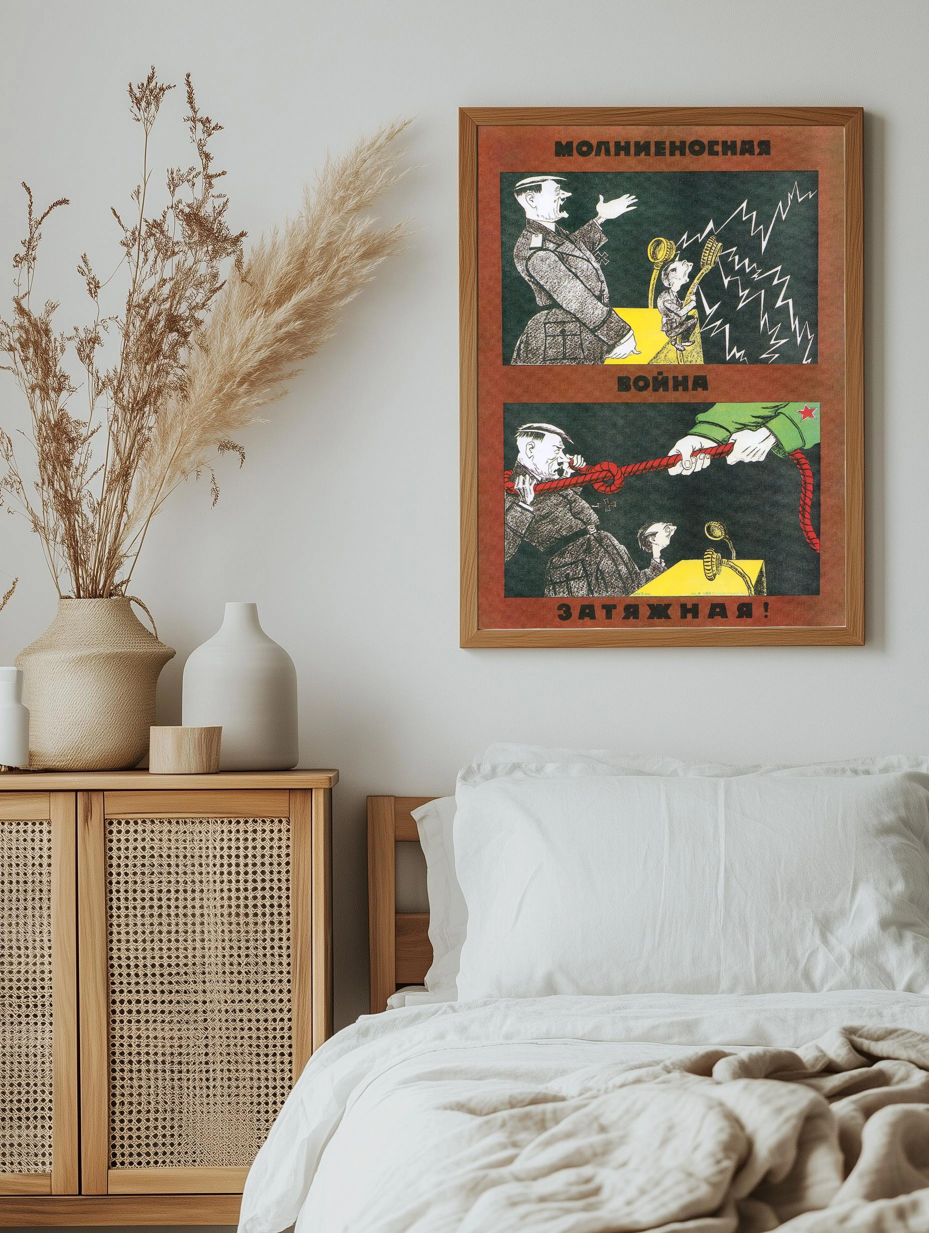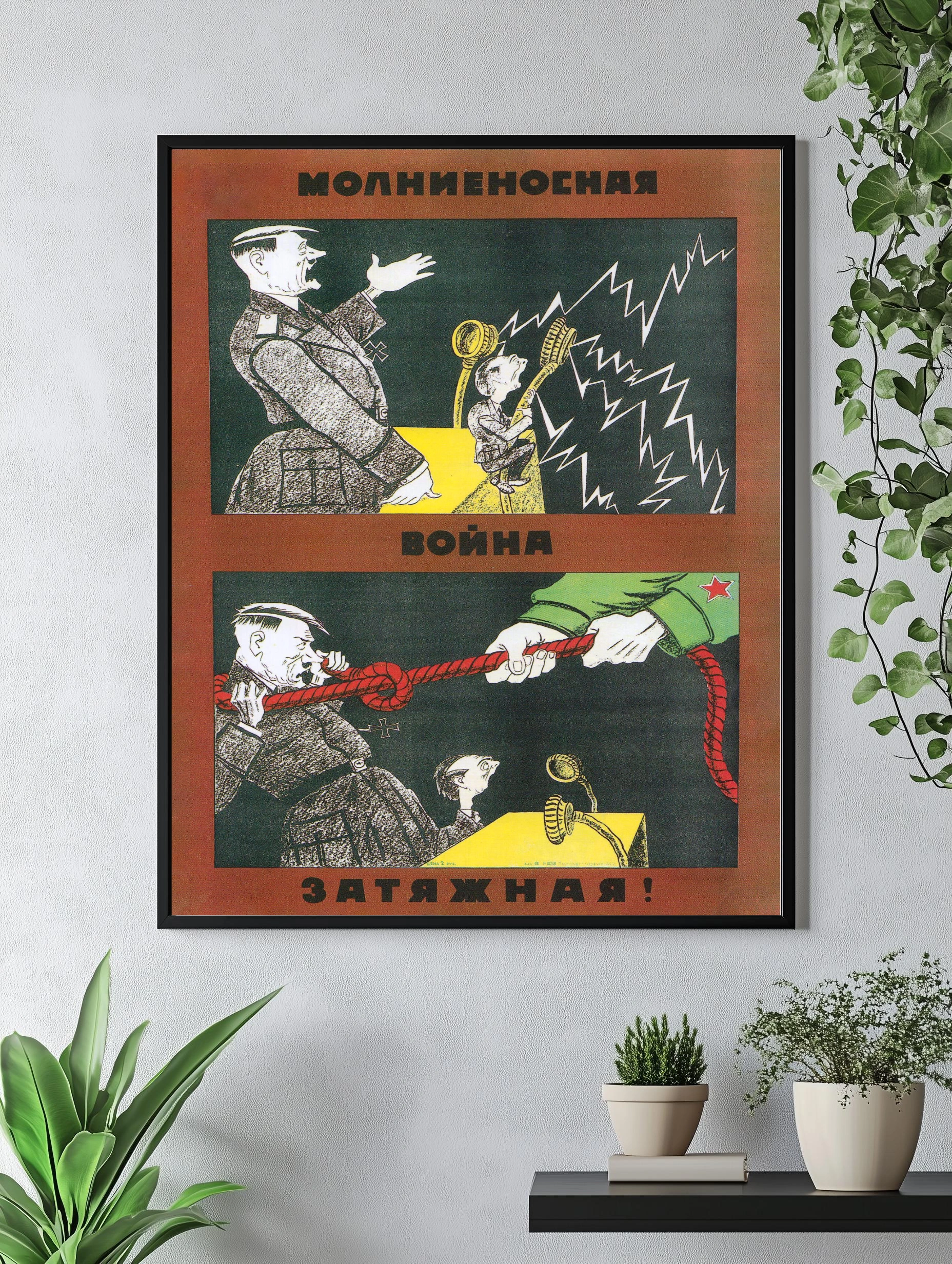 Это советский агитационный художественный плакат с надписями «Молниеносная война» и «Затяжная война». На изображении в стиле ретро показаны две сцены: офицер нацистской Германии с штыком, разрывающийся на молнии и канате, и советский солдат, который удерживает другой конец каната. Цвета постера выдержаны в красных, черных и желтых тонах, создавая контраст и драматизм. Такой интерьерный постер отлично подойдет для тех, кто интересуется историей и декоративным искусством для стен.
