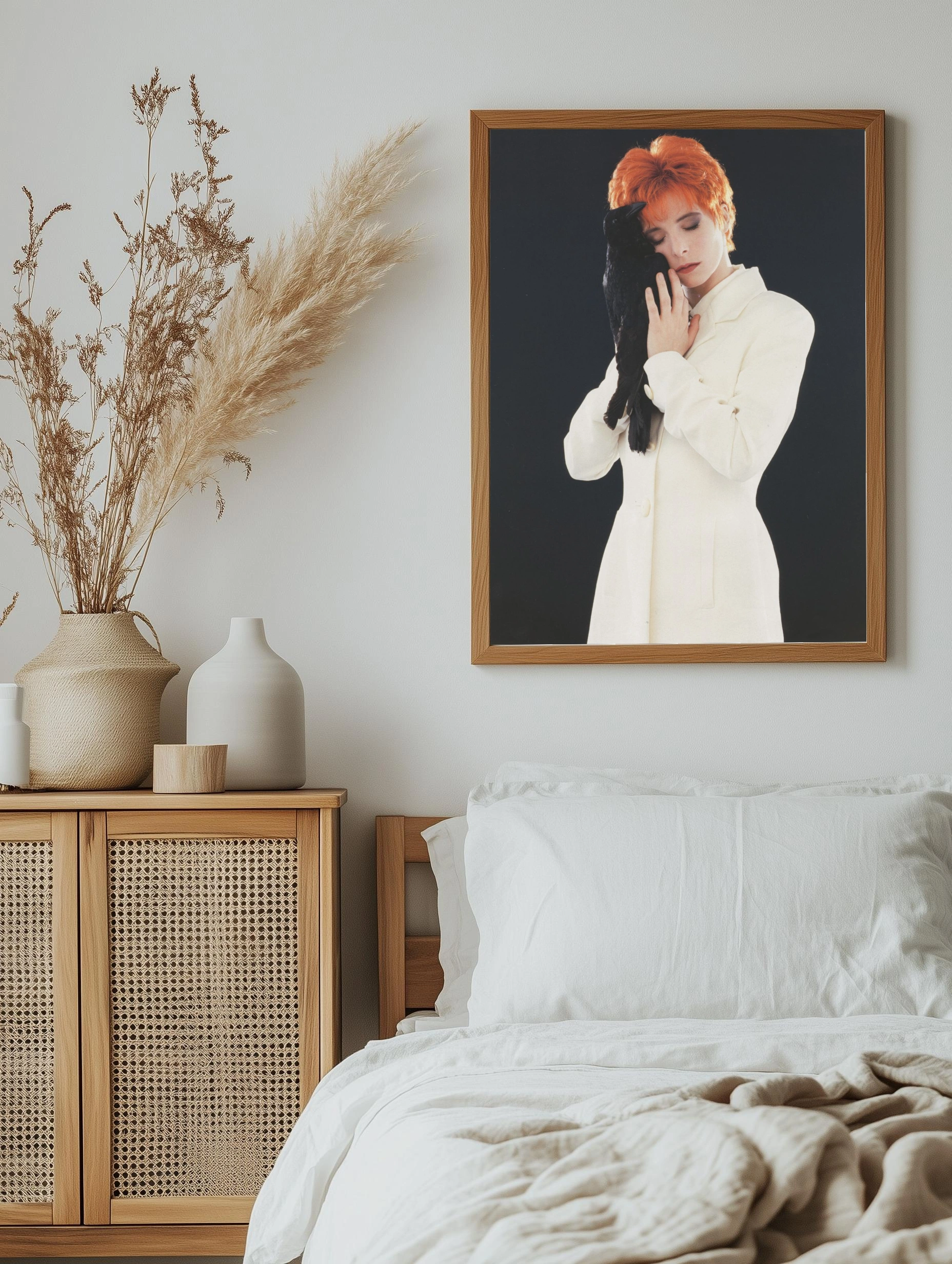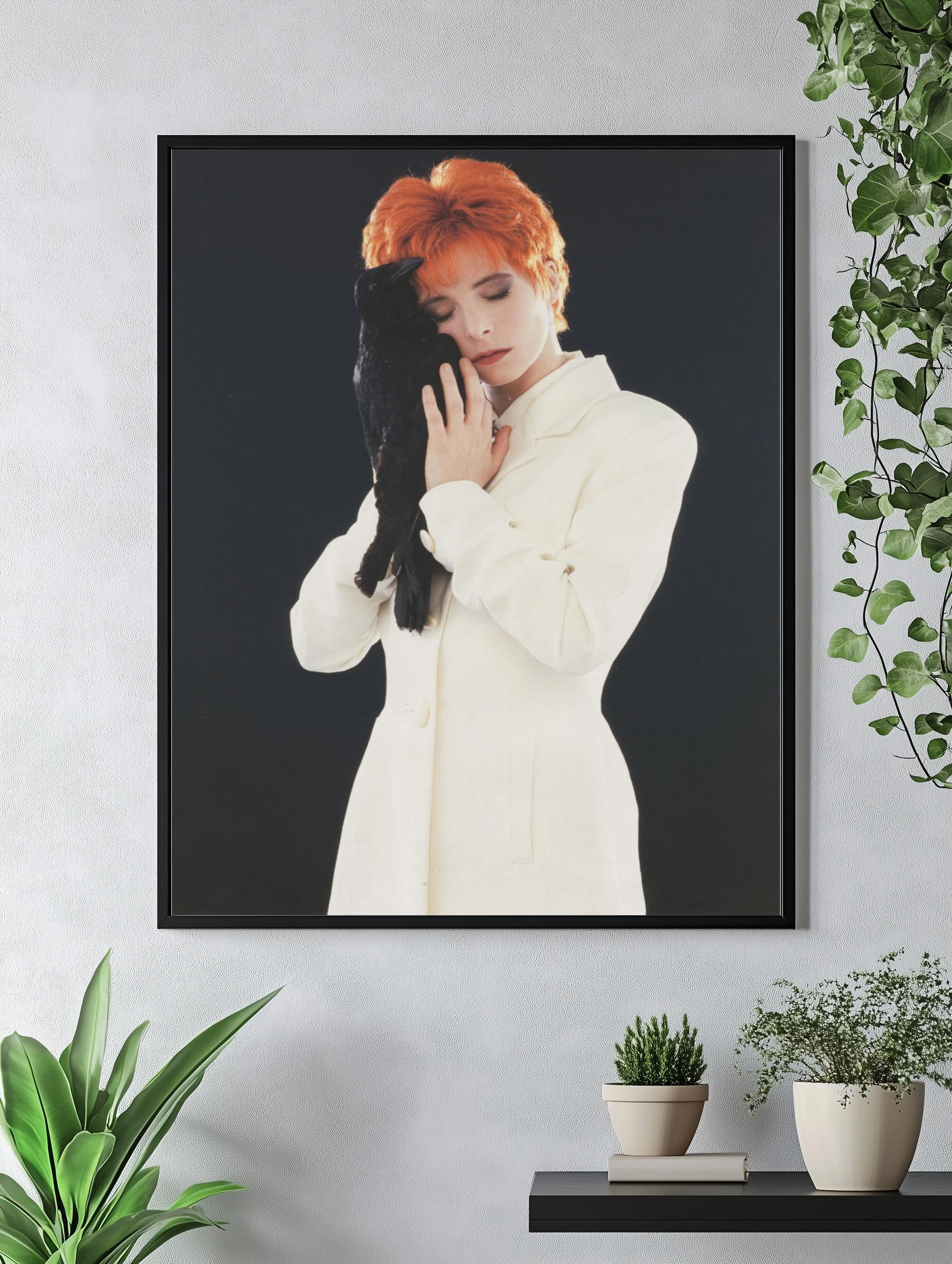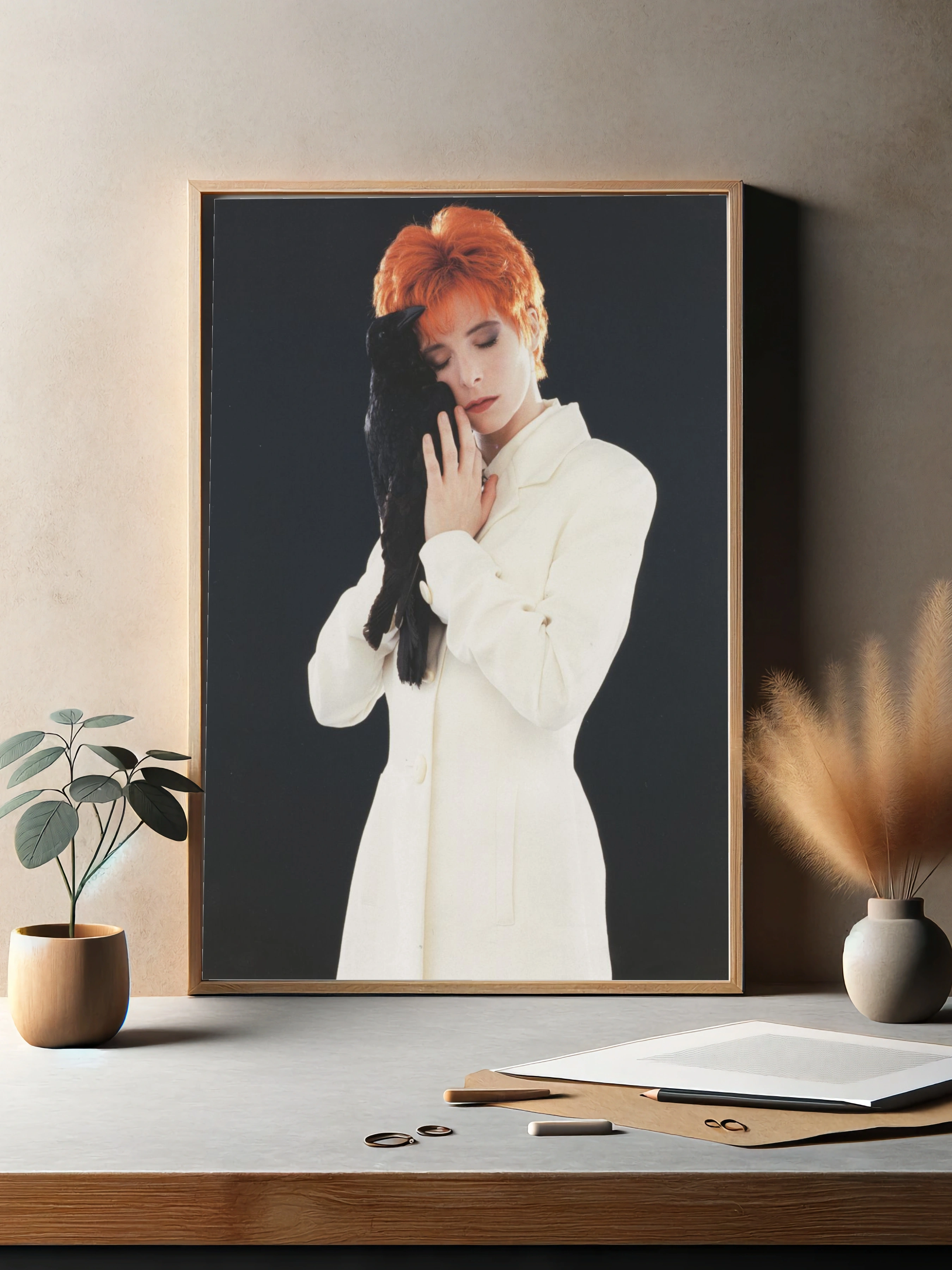 Фотопортрет человека с ярко-оранжевыми волосами в белом элегантном пальто, который нежно обнимает черную птицу на фоне однотонного темного цвета. Постер на холсте привлекает внимание необычным контрастом между светом и тенью, создавая стильный настенный декор для интерьера офиса или гостиной. Идеальный вариант для тех, кто ценит уникальные картины и современное искусство для стен.