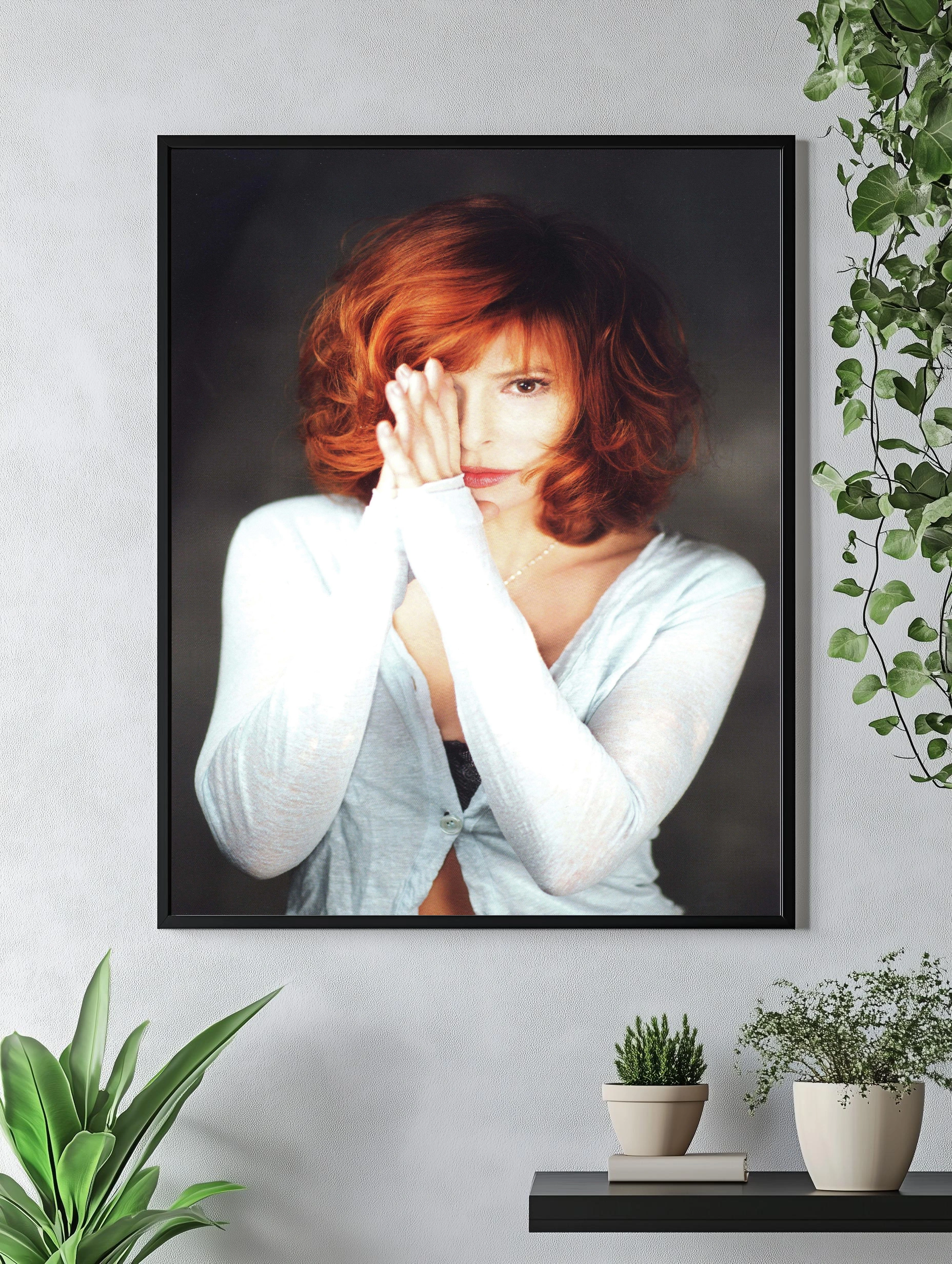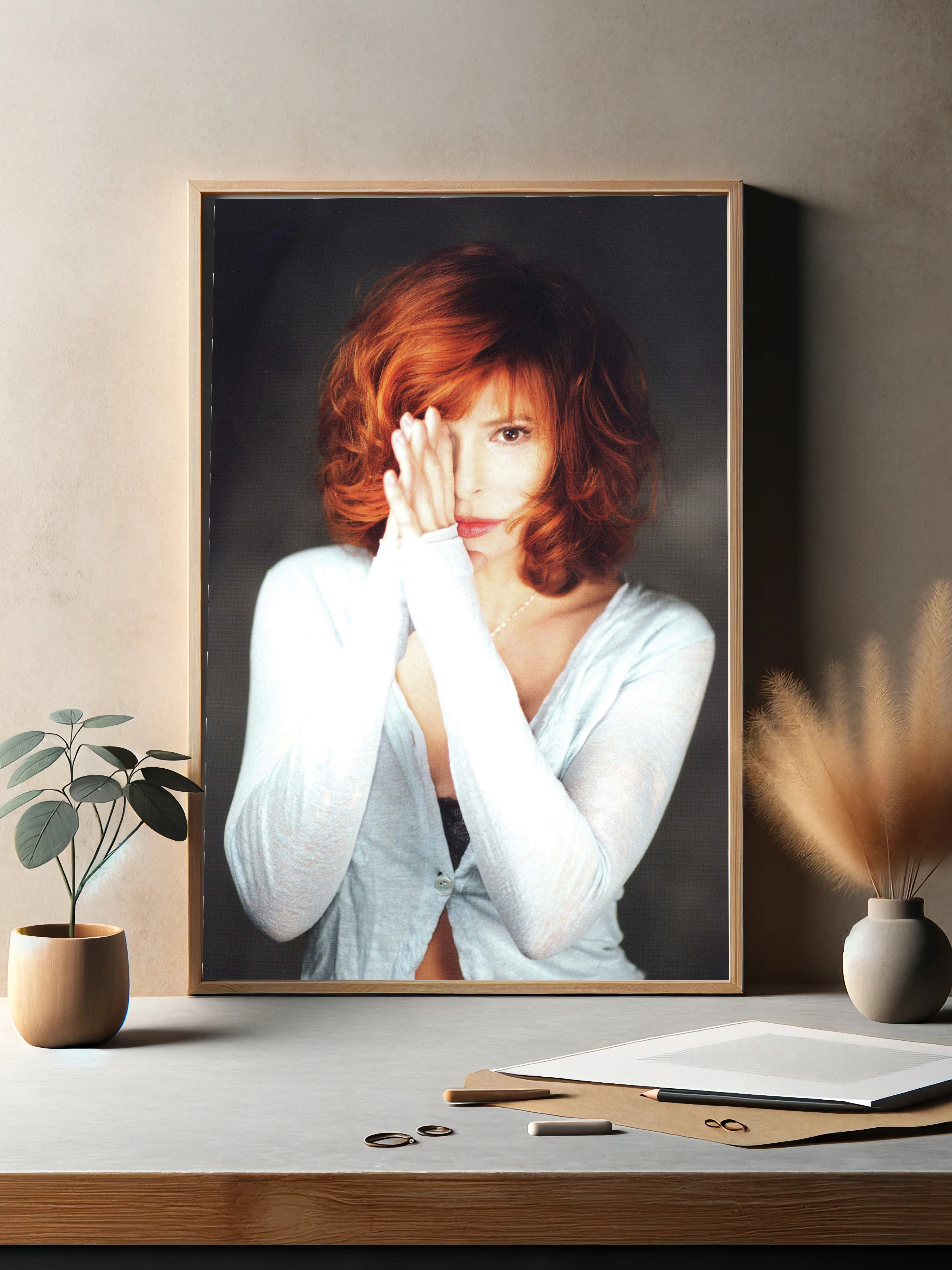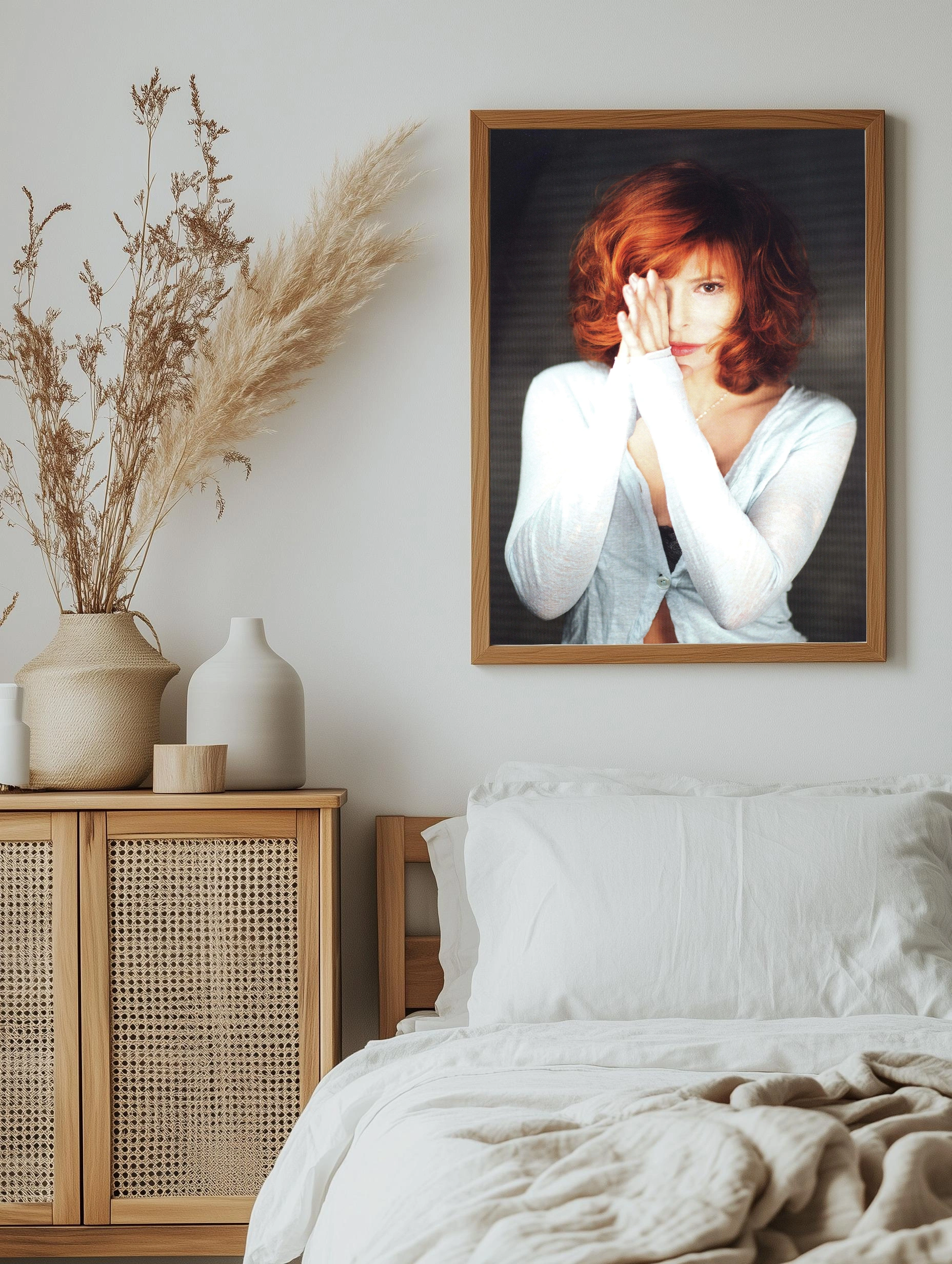 Изображение представляет собой стильный и выразительный портрет женщины с яркими рыжими волосами и светлой кожей, одетой в белую кофту с длинными рукавами. Ее взгляд и частично закрытое лицо создают атмосферу загадочности и интимности, что делает картину идеальным интерьерным искусством для гостиной или спальни. Преобладают самые насыщенные оттенки красного и белого, дополняемые мягким светло-серым фоном, который подчеркивает образ и придает фотографии деликатность и элегантность. Этот декоративный плакат подойдет для современного, уютного интерьера, где важна атмосфера теплоты и глубины.