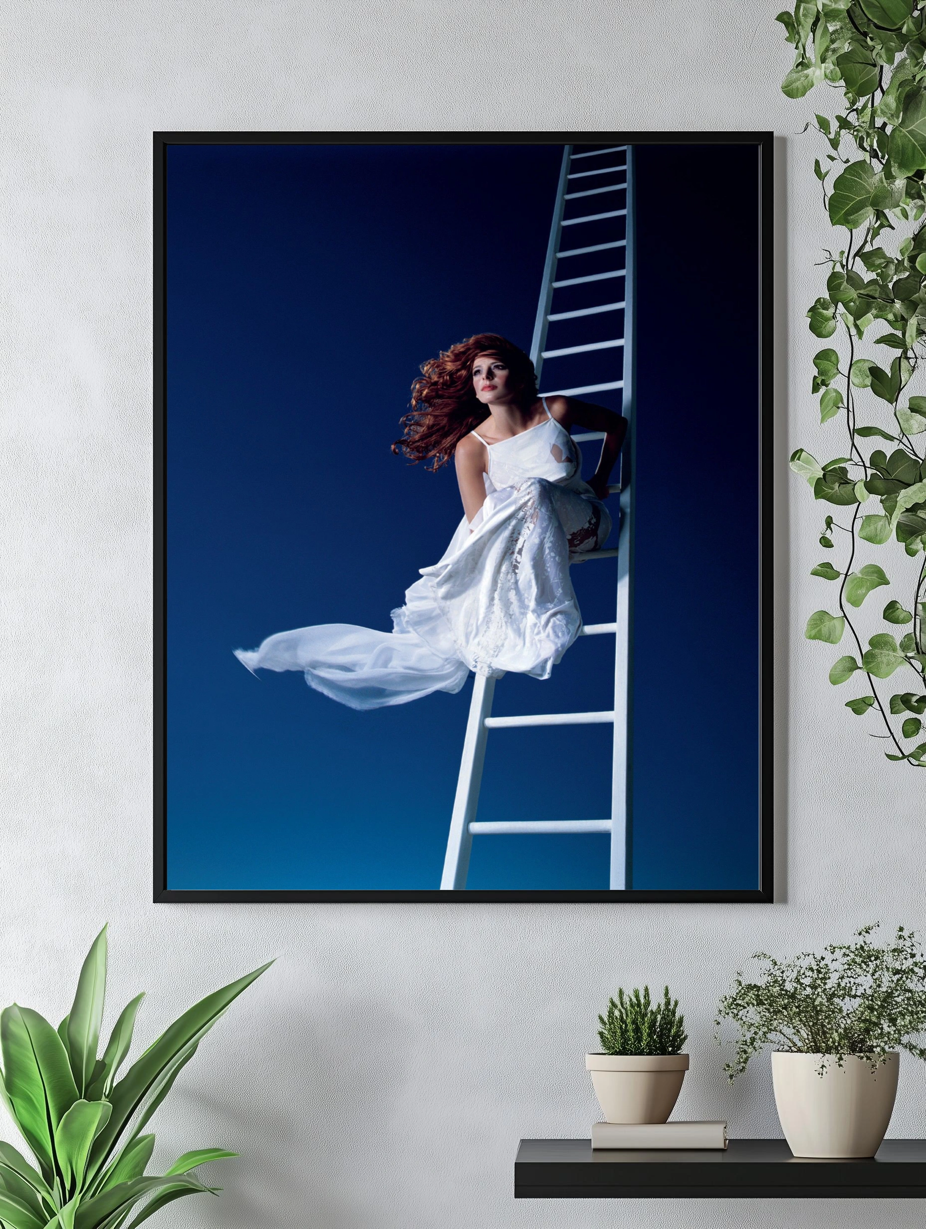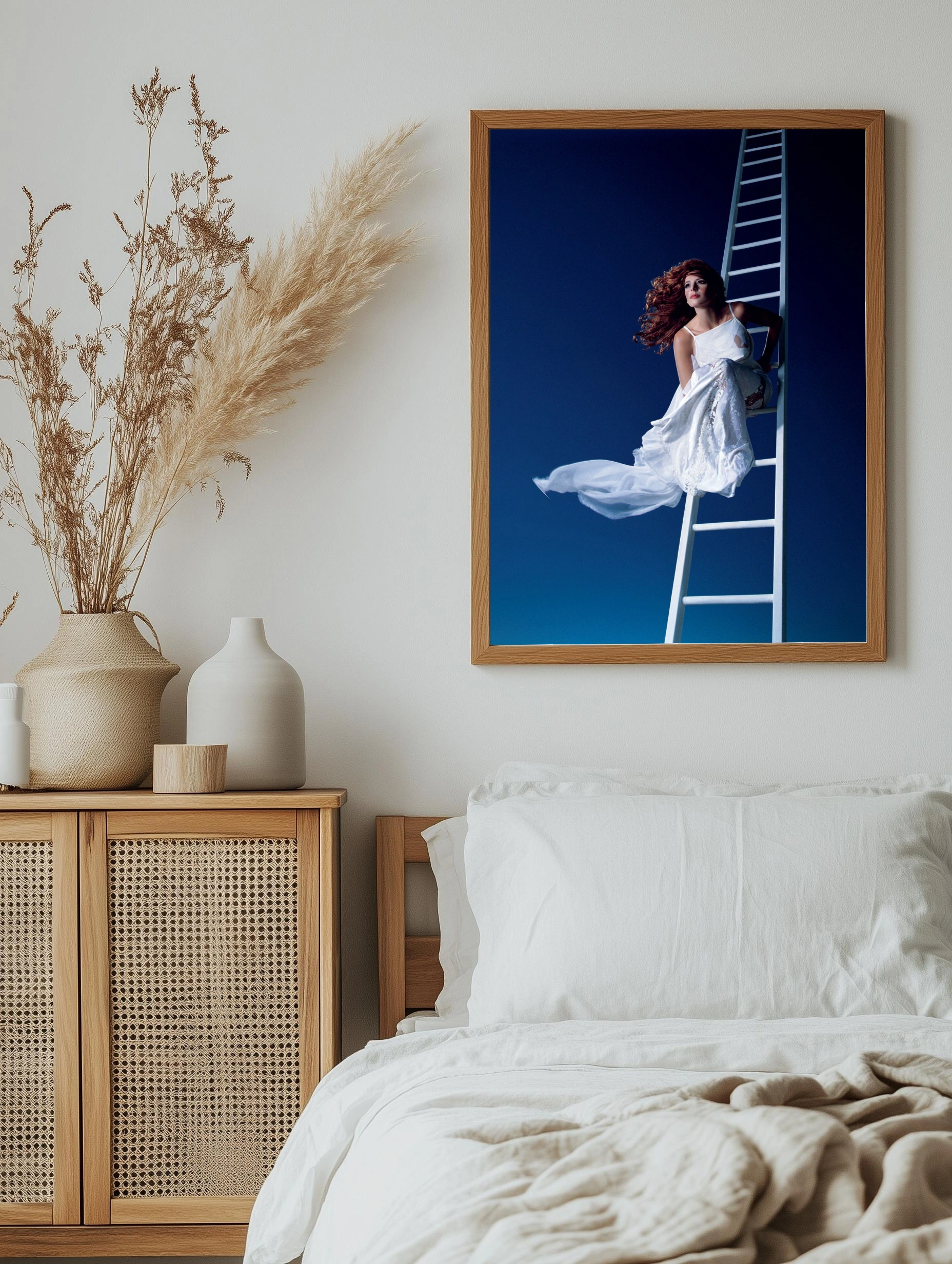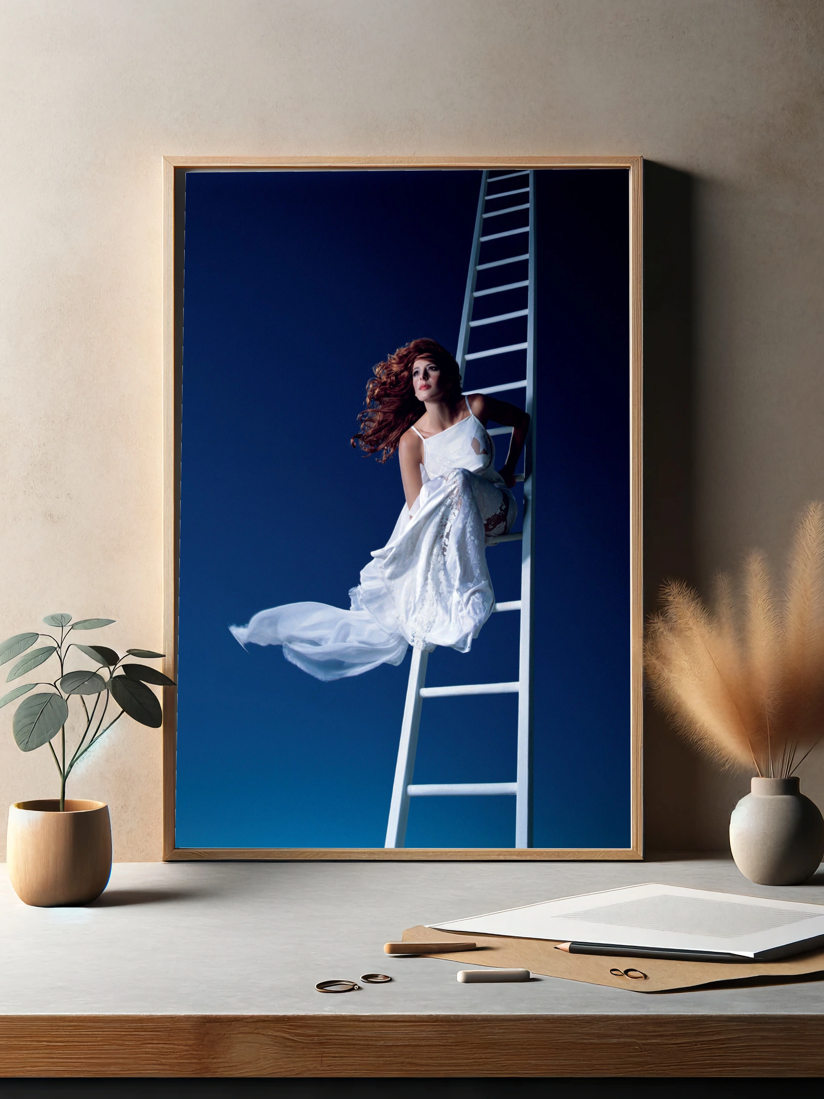 На этом художественном изображении изображена женщина в белом платье, сидящая на высокой белой лестнице, уходящей в глубокий синий ночной или вечерний небосклон. Её развевающиеся волосы и платье добавляют динамики и элегантности, создавая атмосферу стремления, мечтаний и воздушной лёгкости. Современное интерьерное искусство для стен, подчеркивающее грацию и свободу.