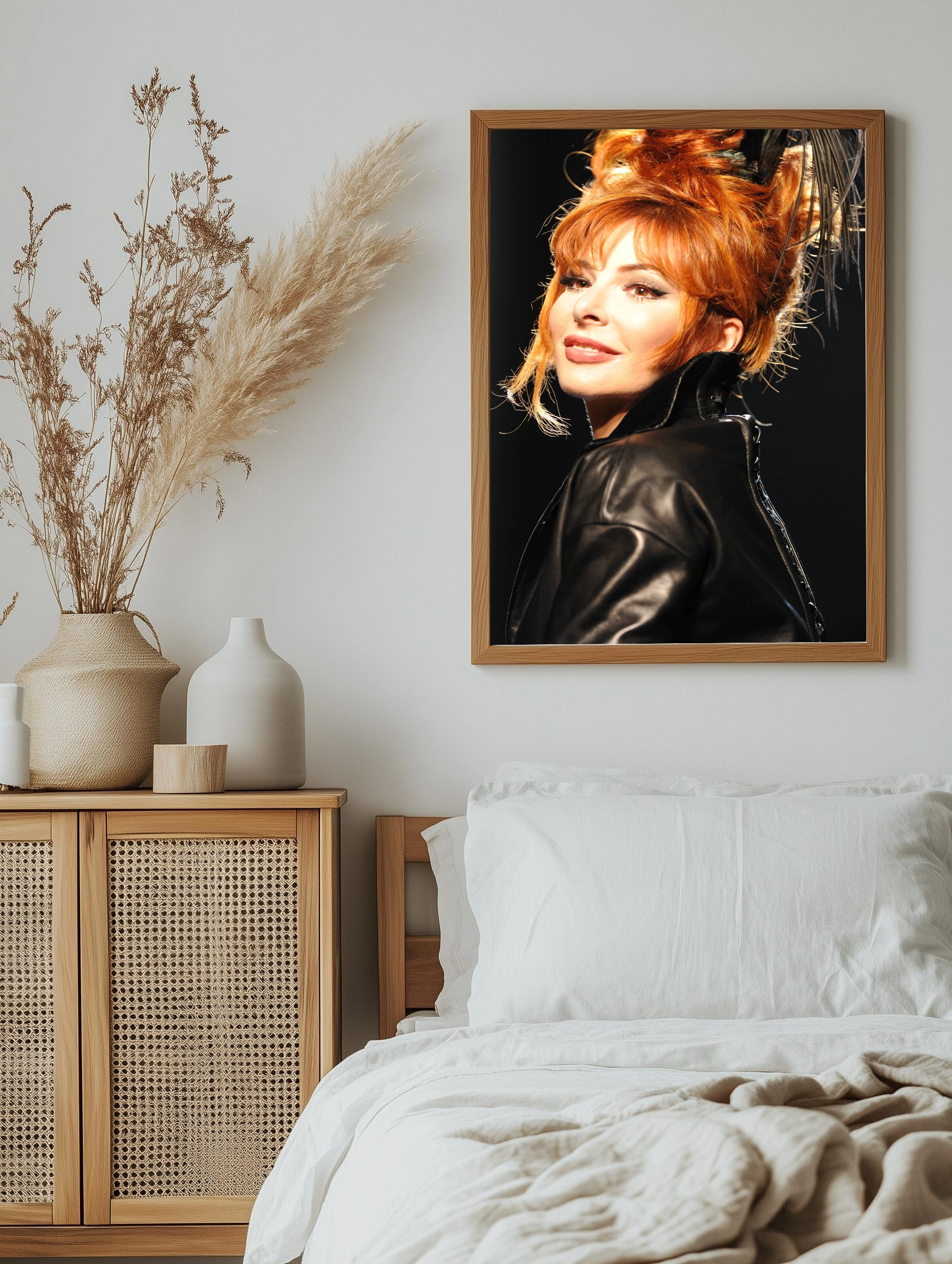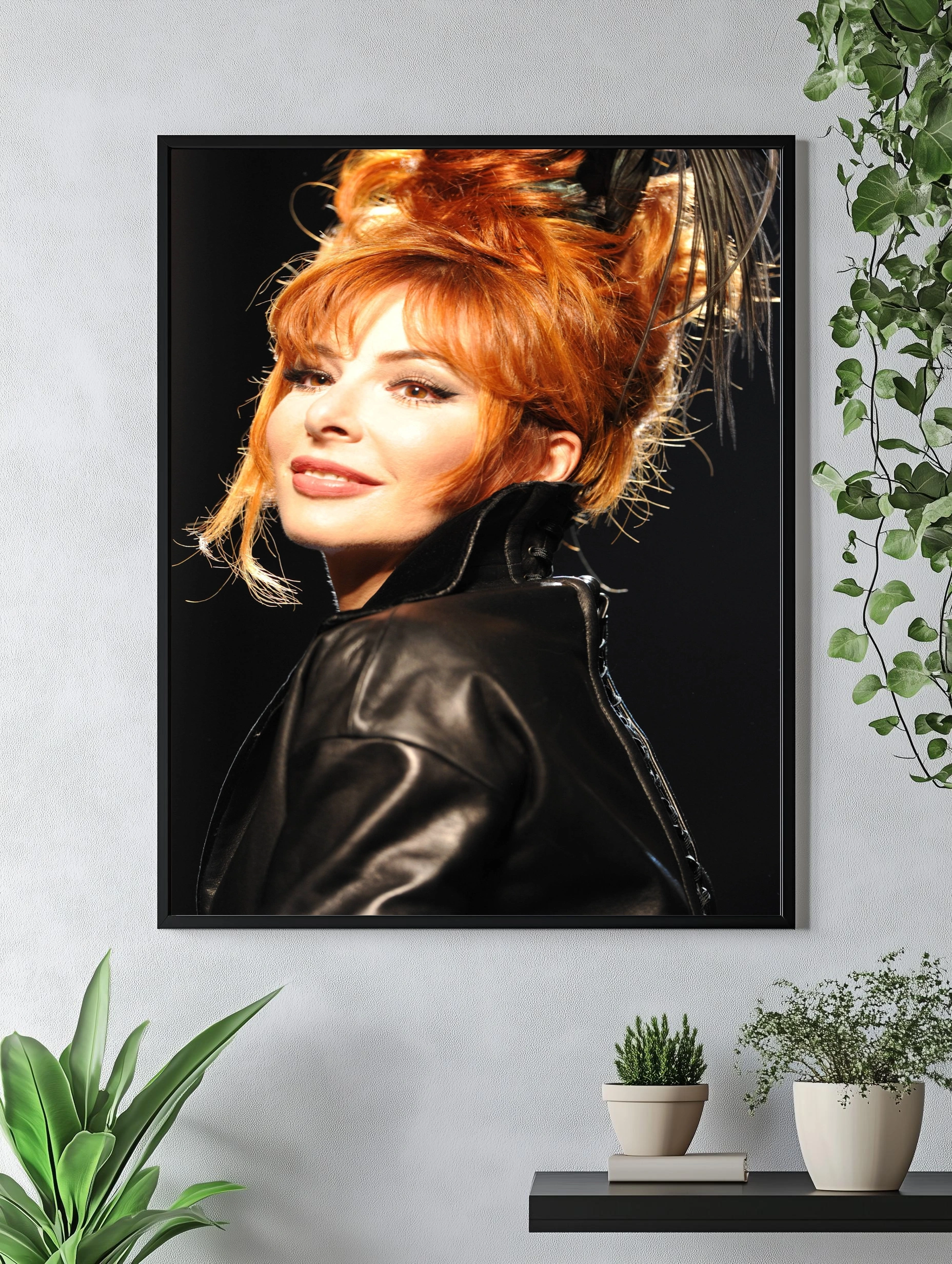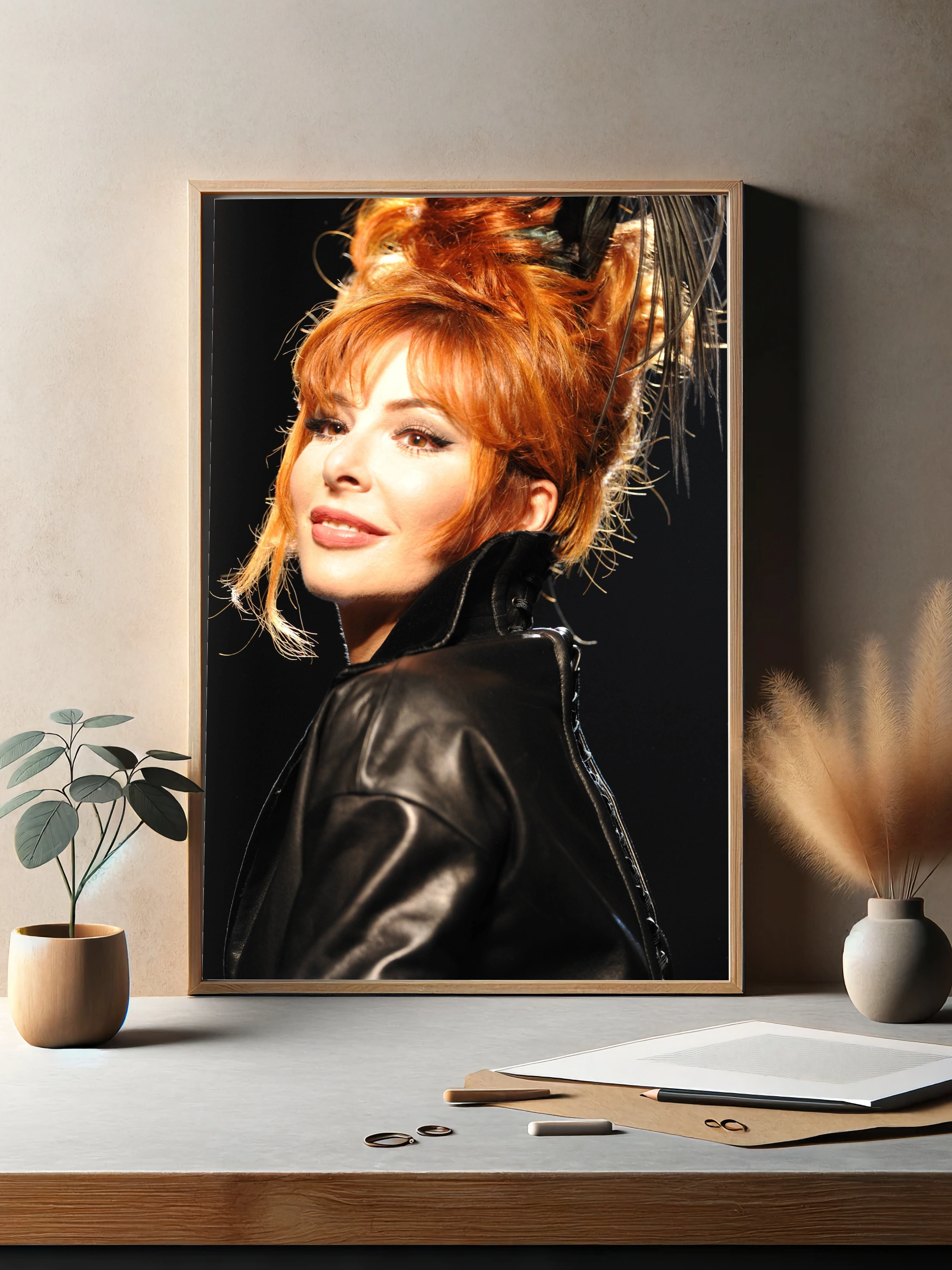На изображении изображена женщина с рыжими волосами в яркой укладке и эффектным макияжем. Она одета в черную кожаную куртку, что создаёт стильный контраст с тёплыми оттенками рыжего и кожи. Снимок выполнен в фотостиле с акцентом на лицо и волосы, что делает его подходящим для интерьерного постера, декоративного плаката или художественного постера для гостиной или спальни.