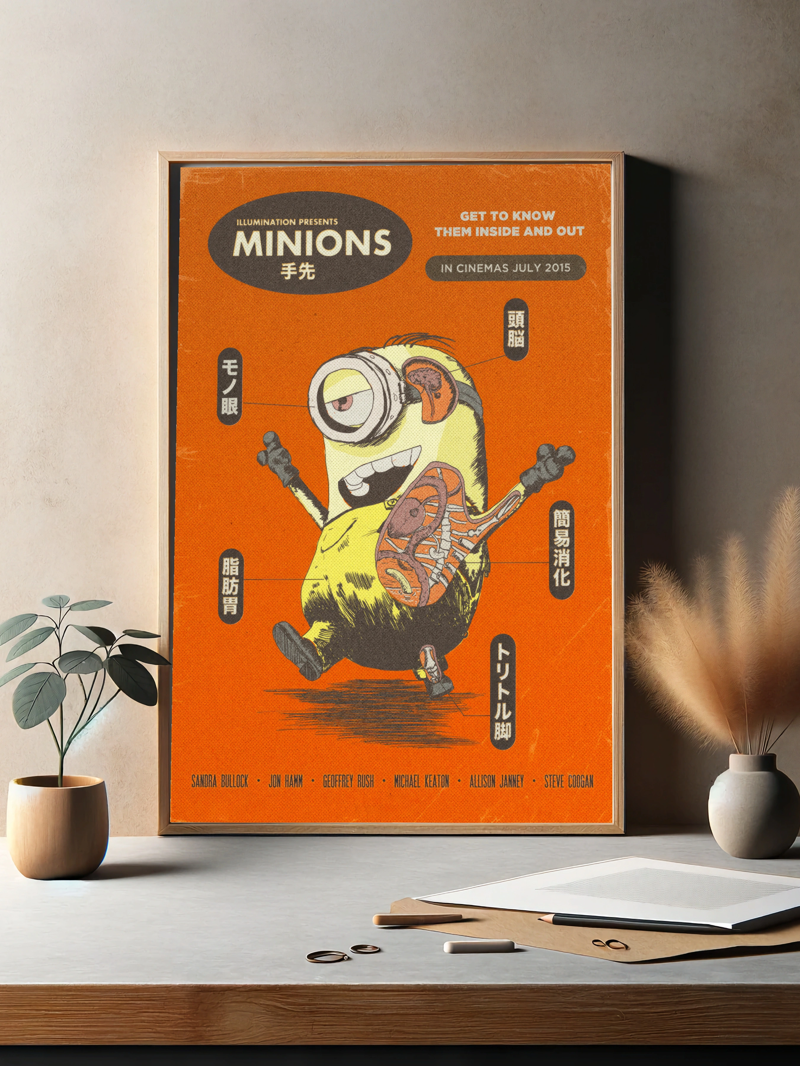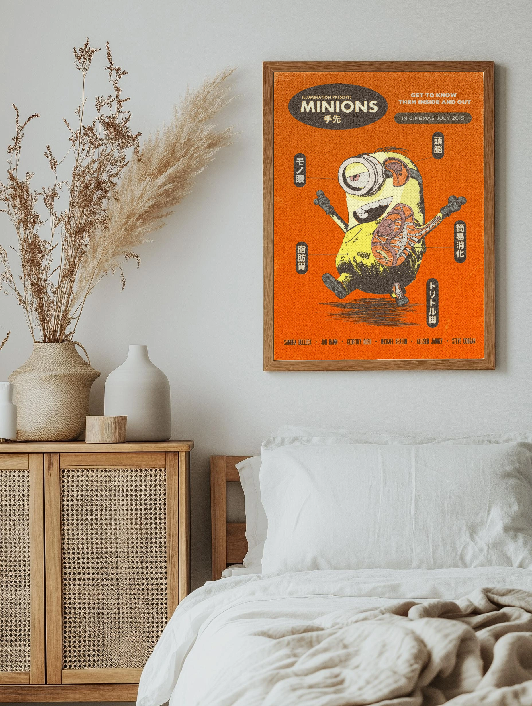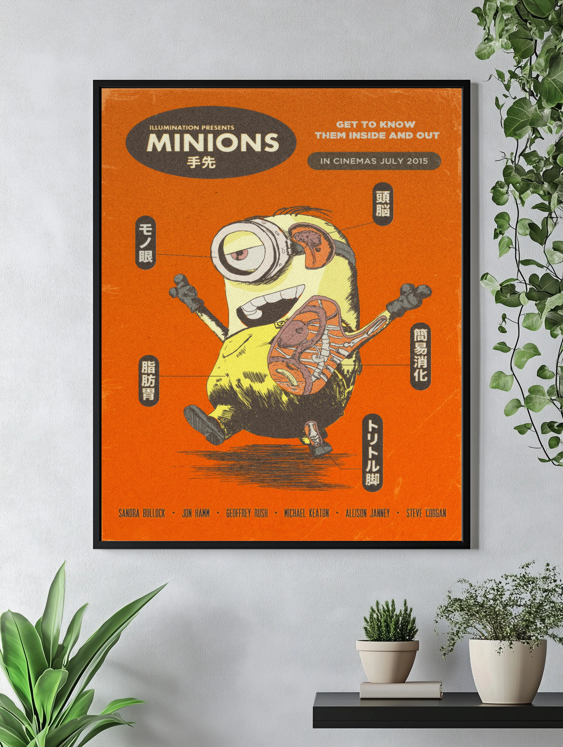 Декоративный плакат с изображением известного персонажа Миньона из мультфильма «Гадкий я». Картина выполнена в ярком оранжевом цвете с акцентами жёлтого и чёрного. Интересный анатомический стиль с открытыми внутренностями персонажа создаёт современное искусство для стен и уникальный интерьерный декор. Отличный выбор для спальни, гостиной или офиса.