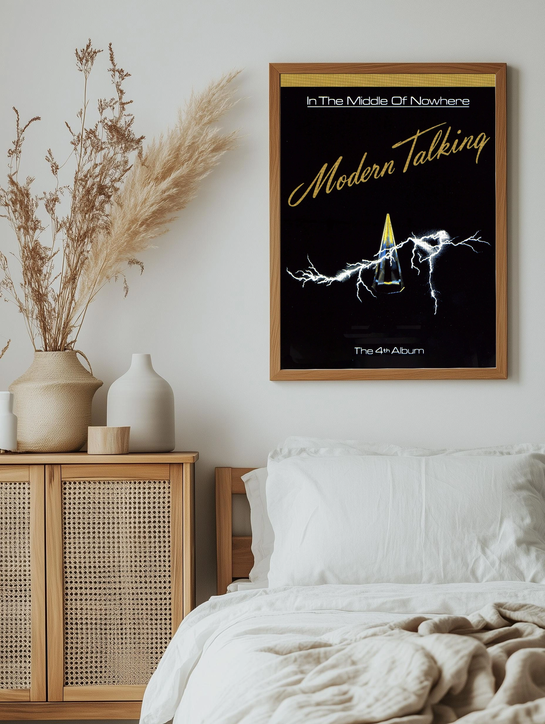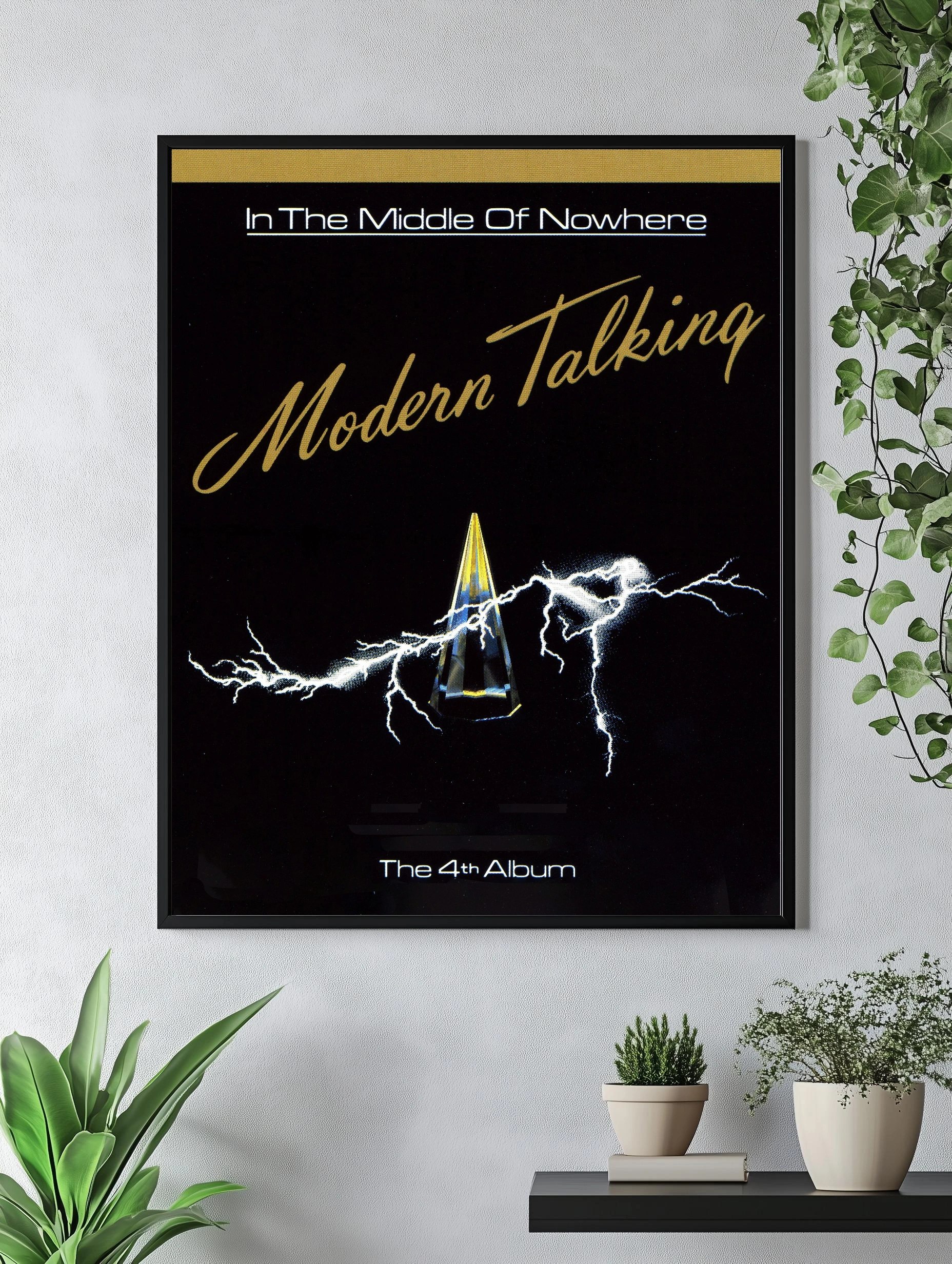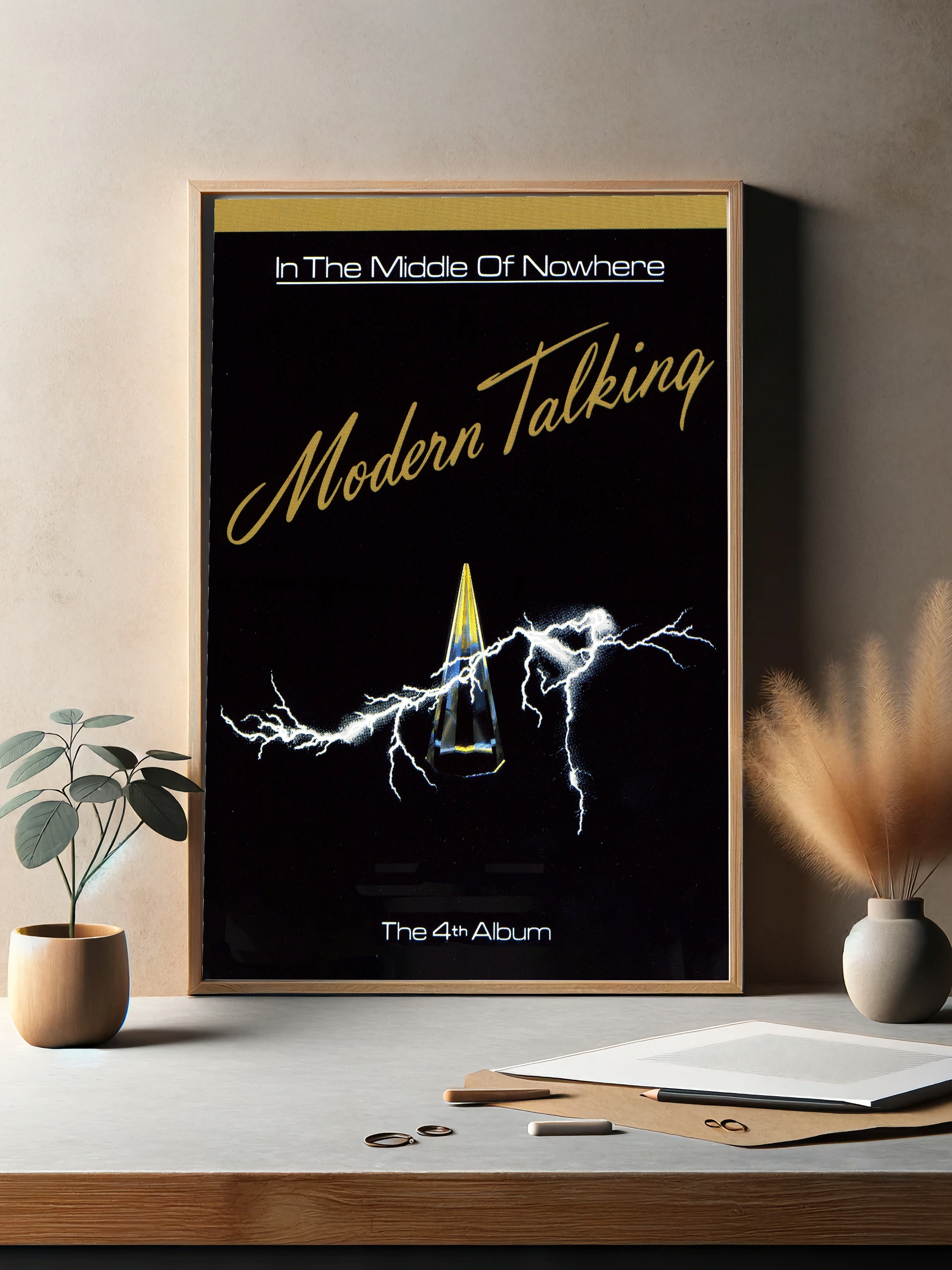 Декоративный плакат с обложкой четвёртого альбома группы Modern Talking под названием ‘In The Middle Of Nowhere’. На тёмном фоне ярко выделяется стилизованный кристалл, излучающий свет и электрические разряды. Чёрно-жёлтая цветовая гамма создаёт атмосферу энергии и динамики, идеально подходящую для современного интерьера и музыкальных фанатов.