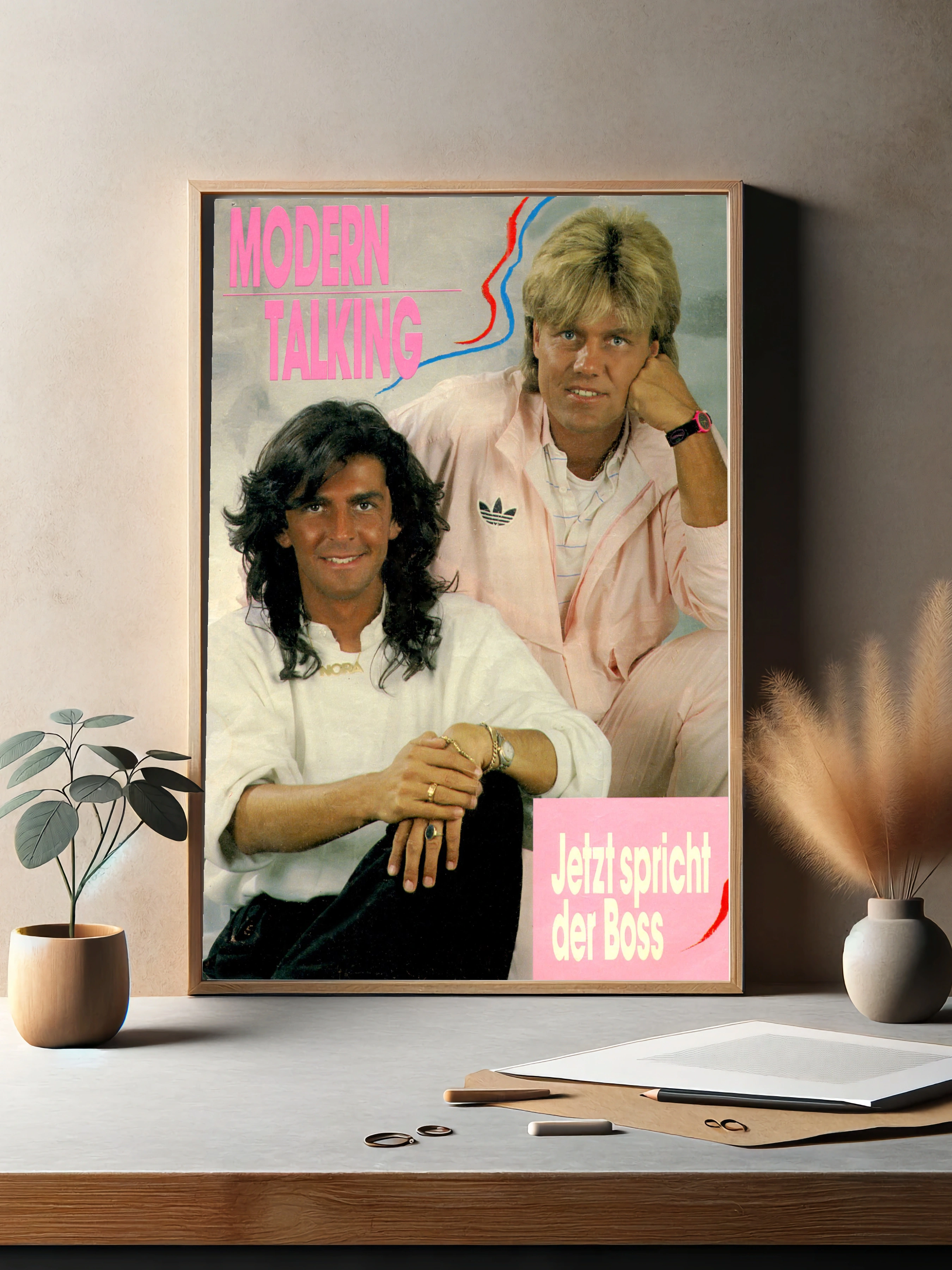 Изображение представляет собой яркую картину с участием известного музыкального дуэта Modern Talking, популярных в 1980-х. Два вокалиста запечатлены в стиле того времени: светлые и тёмные волосы, яркий контраст одежды, акцент на деталях. Настенный декоративный плакат передаёт атмосферу ретро и ностальгии, идеально подходит для интерьера гостиной или офиса с музыкальной тематикой.