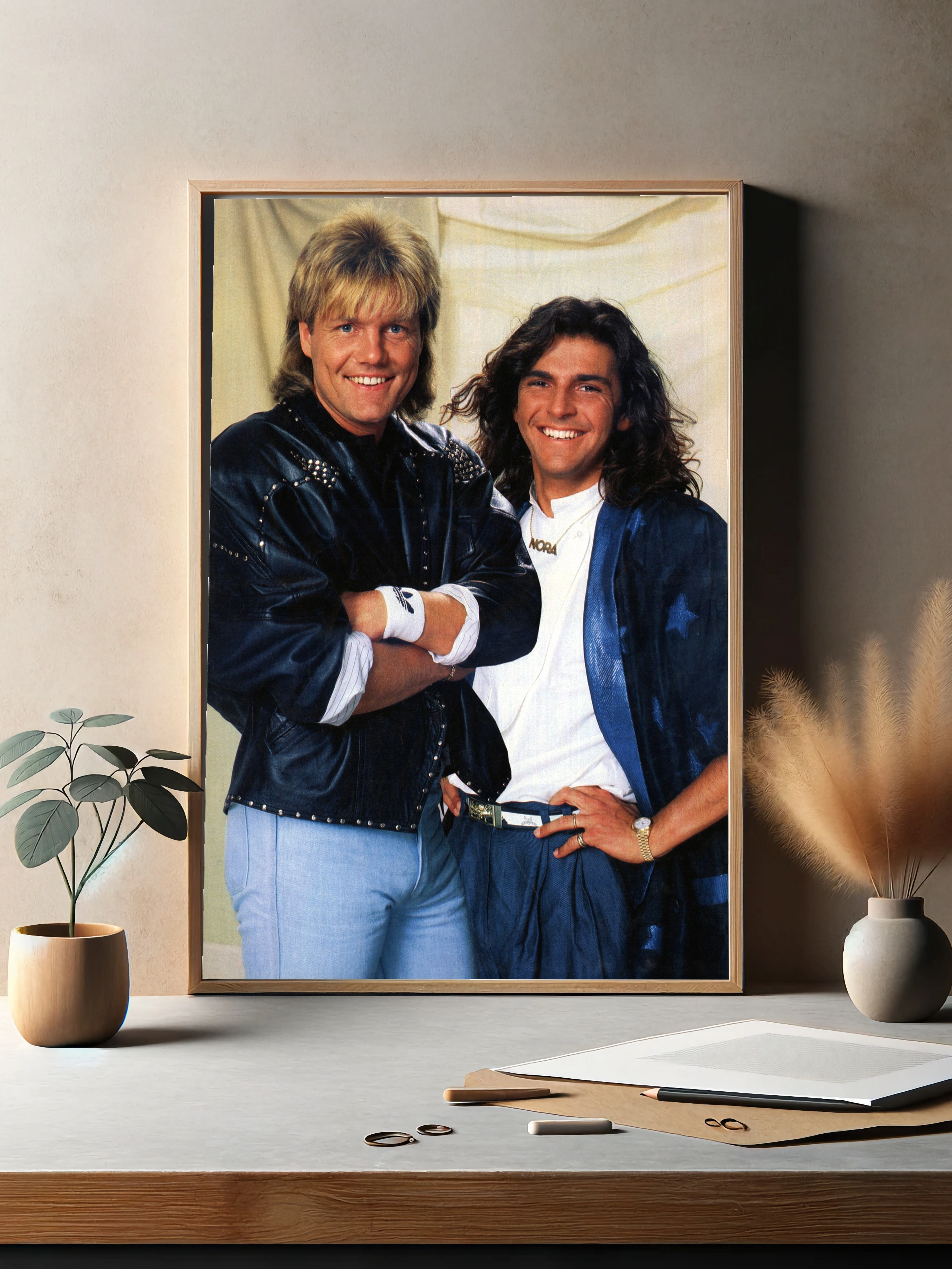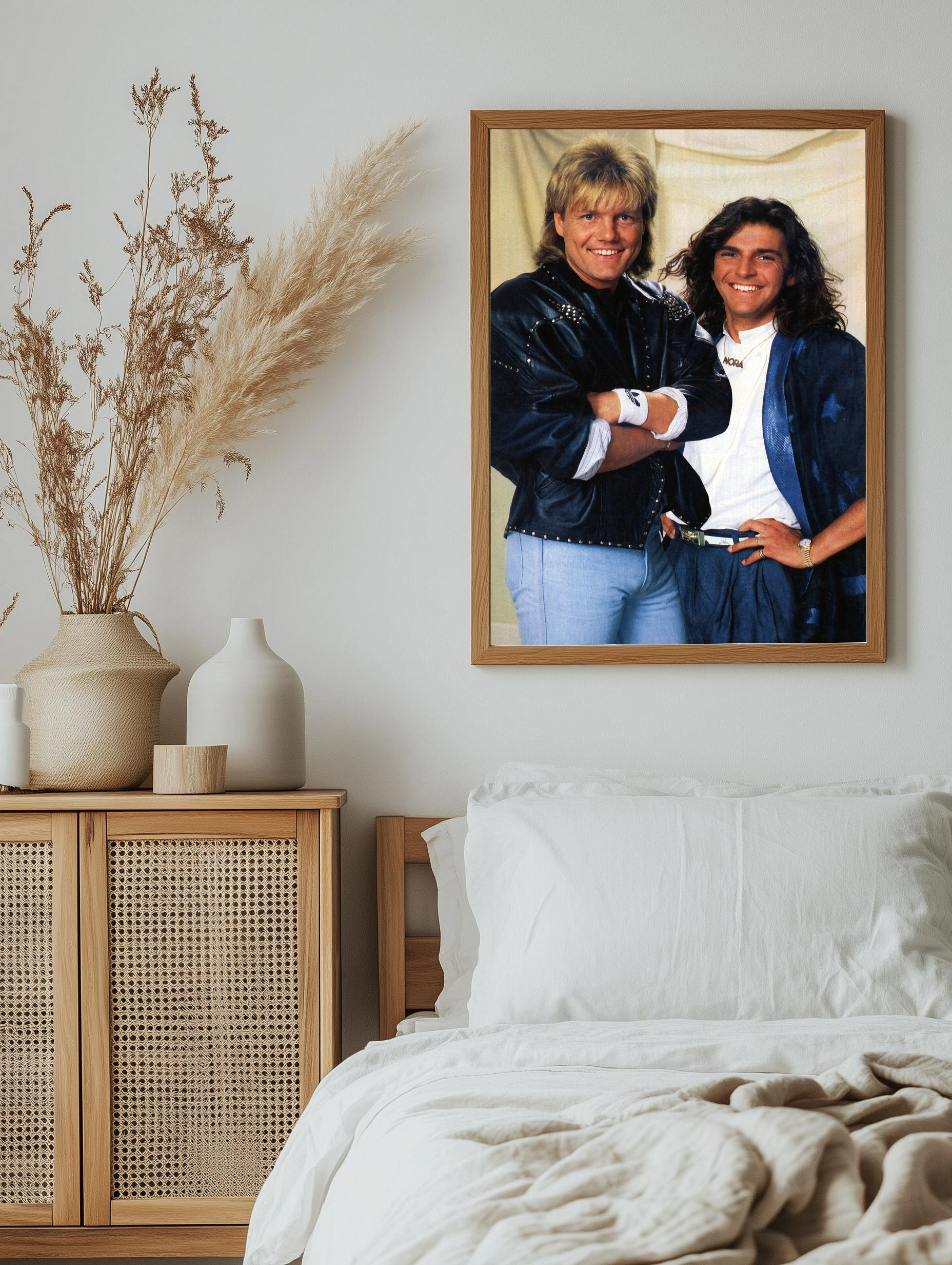 На изображении представлены двое мужчин с яркой улыбкой, одетые в стильные кожаные куртки и одежду в духе 80-90-х годов. Образ передает атмосферу ретро и молодежного бунтарства, создавая эффект настенного декора или интерьерного искусства для спальни и гостиной. Основное настроение позитивное и энергичное, сочетание черного и синего цветов подчеркивает стильную и модную композицию.