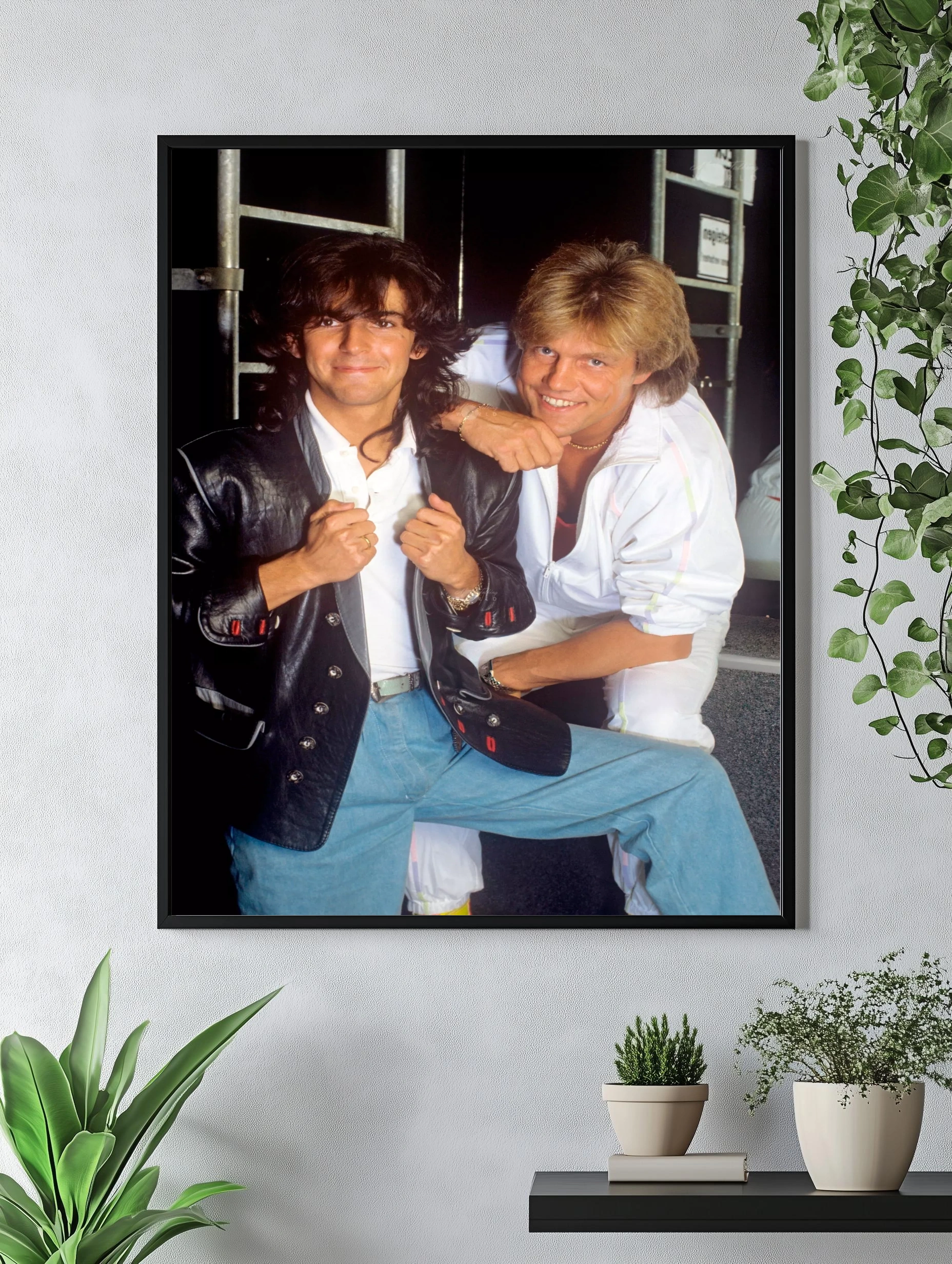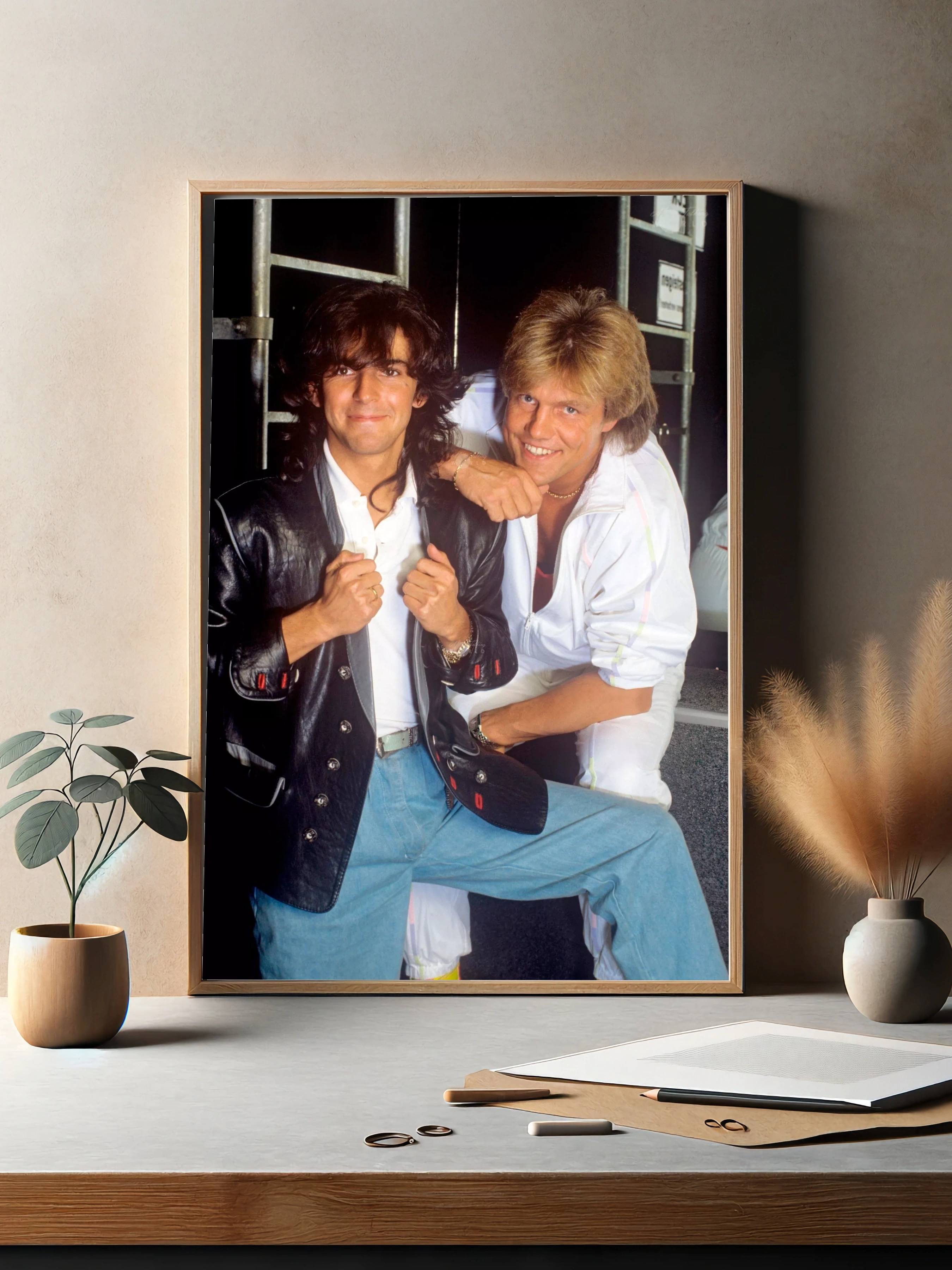 Яркое фото с 80-х годов показывает двоих мужчин с модными прической и одеждой того времени: кожаная куртка, джинсы, спортивный костюм белого цвета. Фото наполнено настроением дружбы и оптимизма, подходит для интерьера, добавляя стильный декор стен. Художественный плакат для спальни и гостиной в стиле ретро.