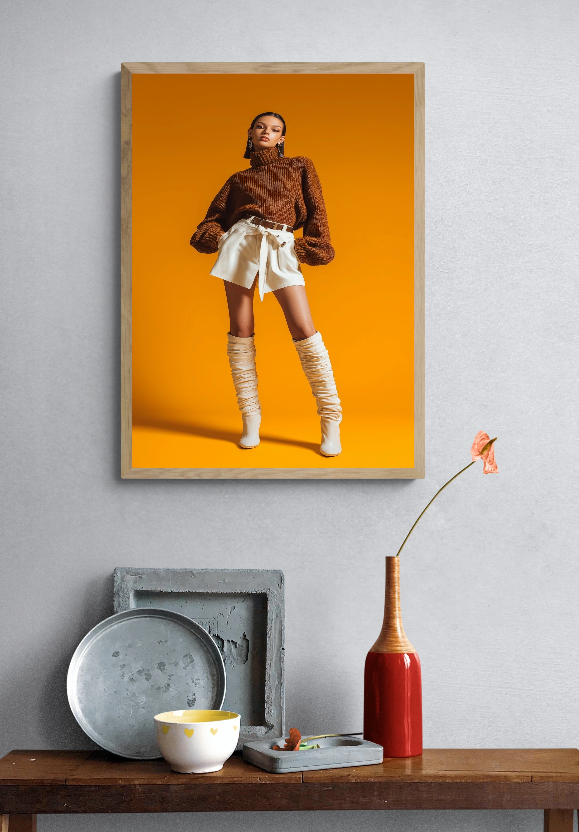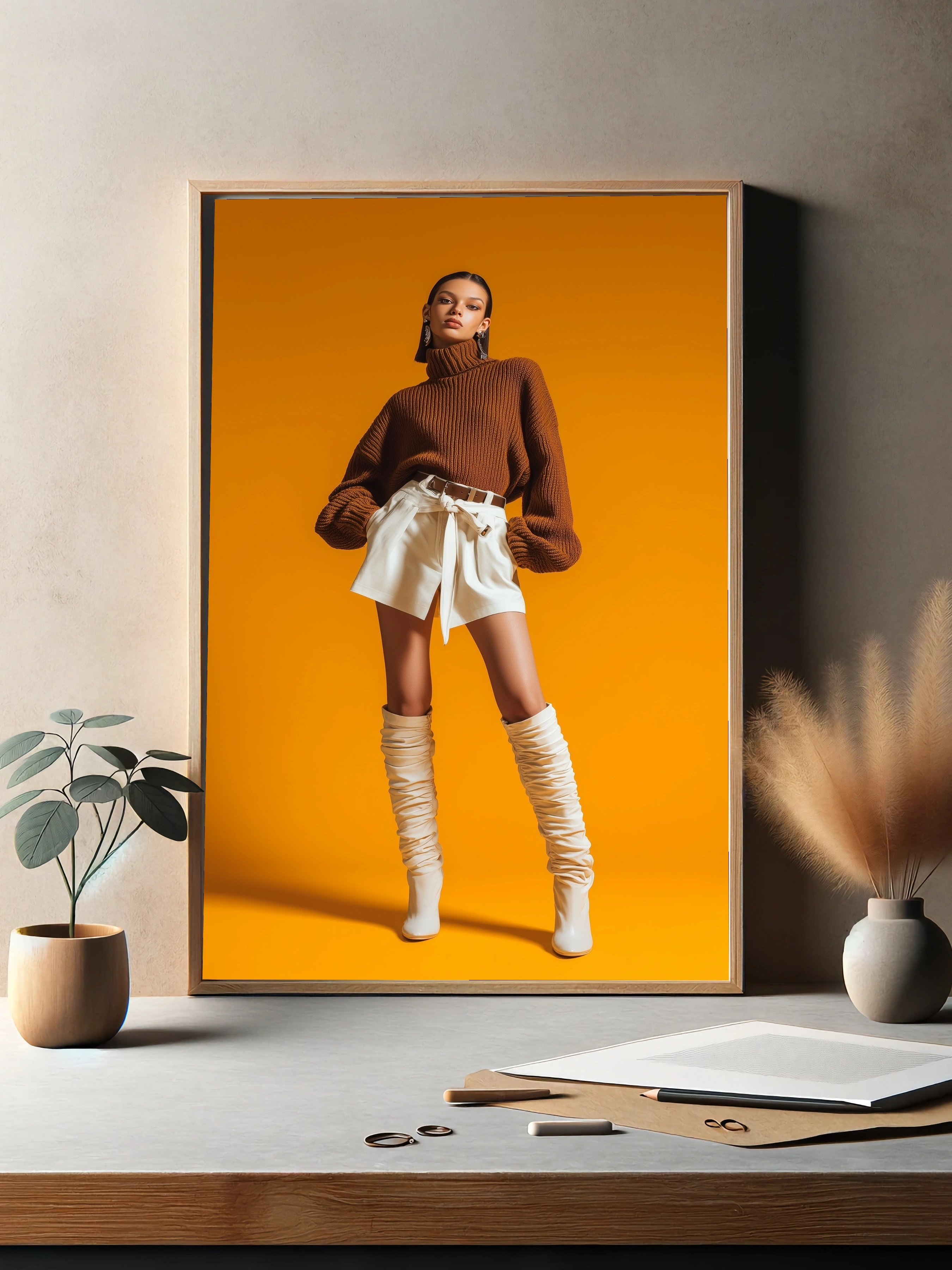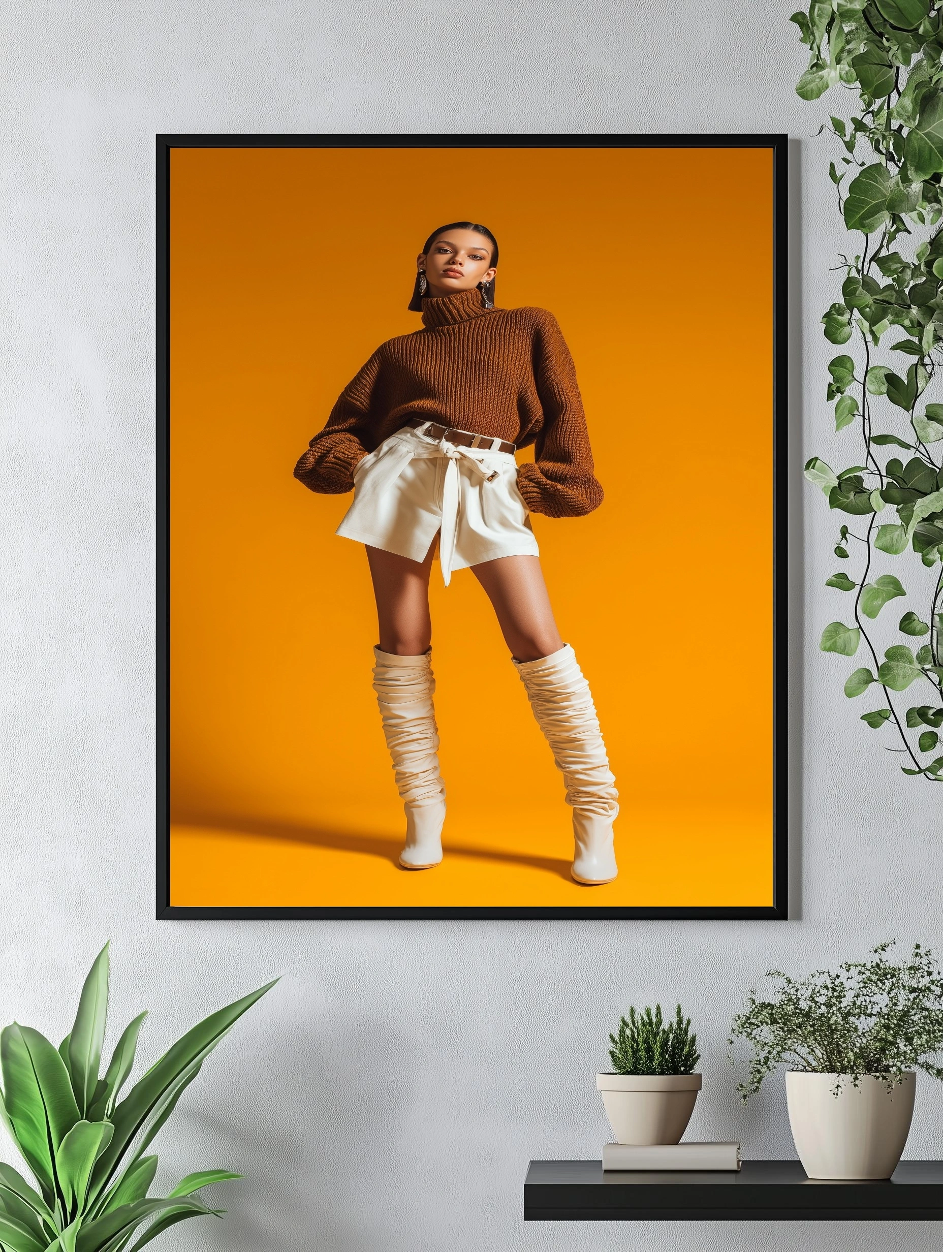 Погрузитесь в мир стиля с этим потрясающим постером, на котором изображена уверенная модель в уютном коричневом свитере с высоким воротником. Свитер с объемными рукавами создает эффектный силуэт, подчеркивающий индивидуальность. Модель носит белые шорты с завязкой на талии, которые добавляют легкости и свежести образу. На ногах — эффектные белые сапоги с рюшами, которые привлекают внимание и создают стильный контраст с верхом. Яркий оранжевый фон подчеркивает динамику и энергетику композиции, создавая атмосферу тепла и уюта. Этот постер идеально впишется в интерьер гостиной или спальни, добавляя нотку современности и креативности. Он привлечет внимание молодежи и креативщиков, стремящихся выделиться и подчеркнуть свой стиль.