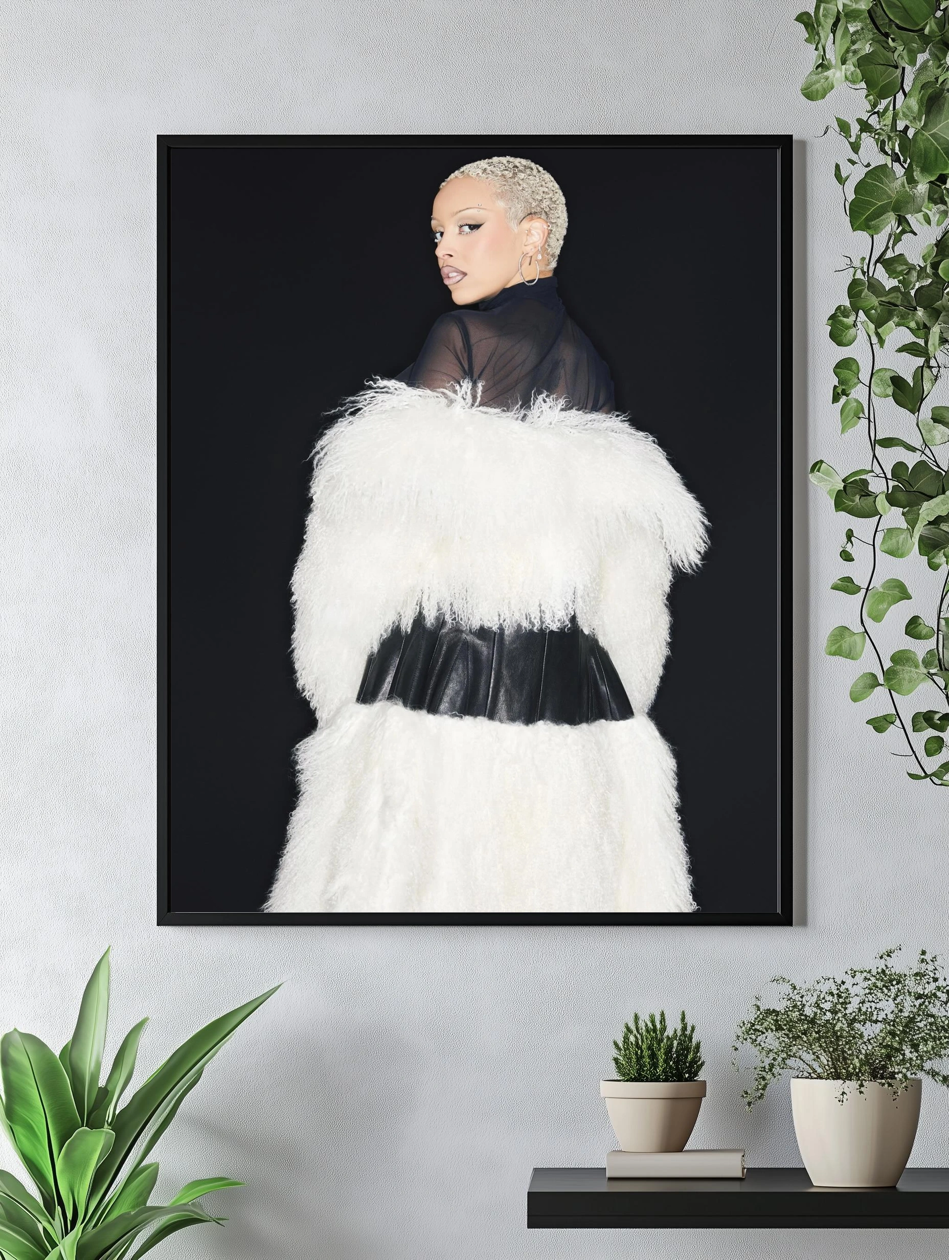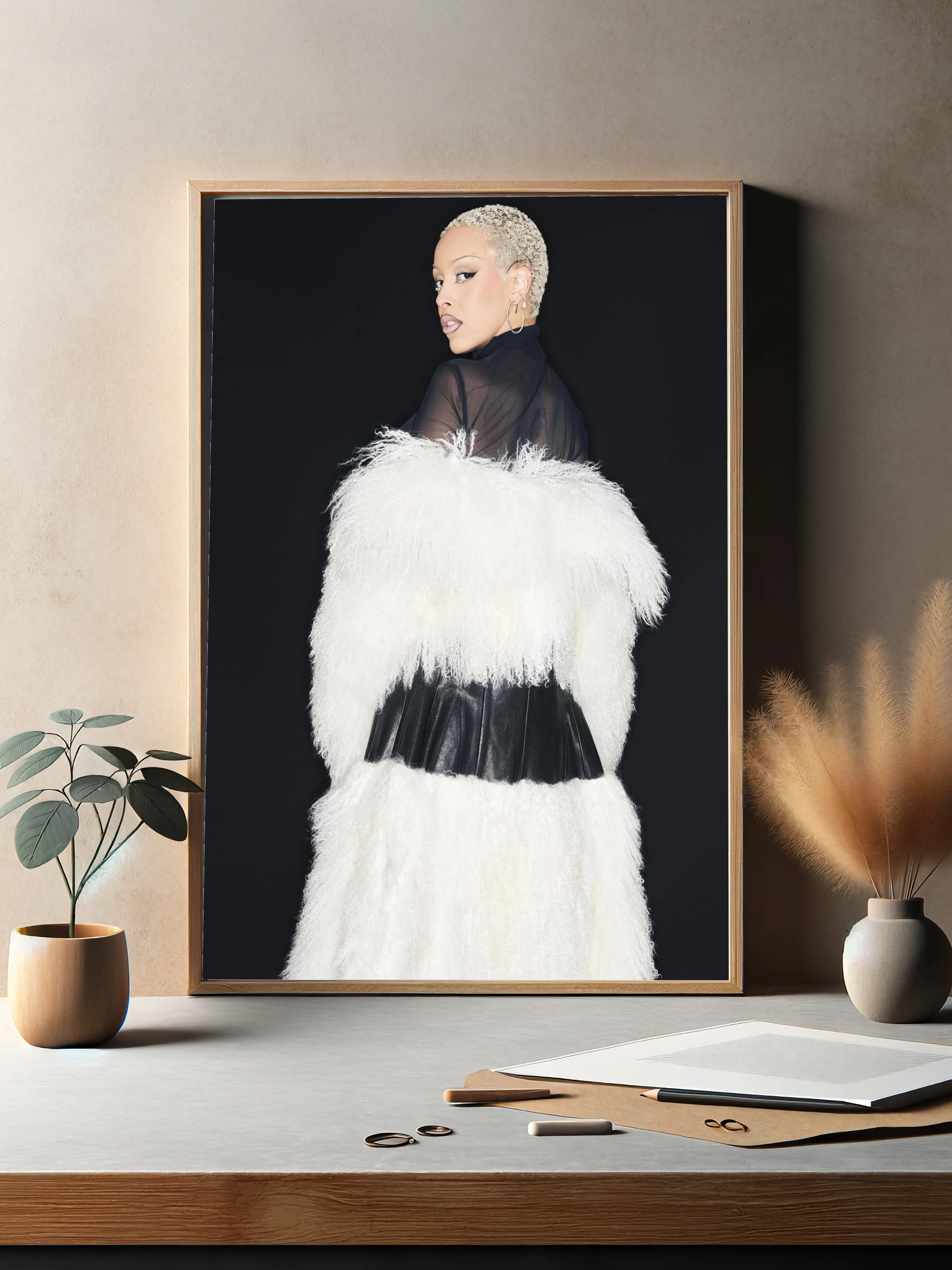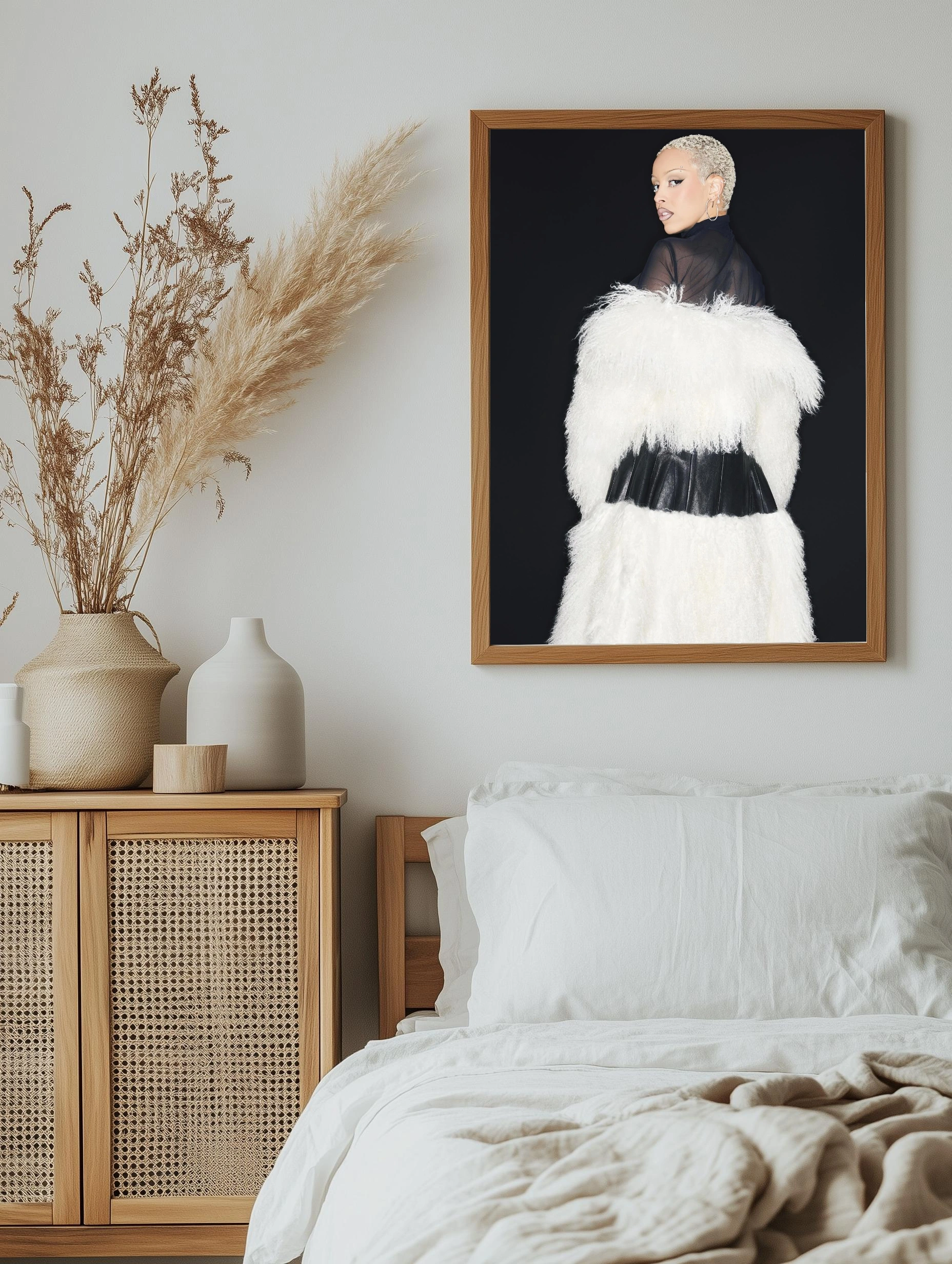 На изображении — стильный портрет женщины с короткими светлыми волосами, одетой в объемное белое меховое пальто с широким черным поясом. Ее взгляд направлен через плечо, что добавляет картине загадочности и элегантности. Четкий контраст черного фона и одежды создаёт модный и современный фотопостер, подходящий для интерьера гостиной или офиса, добавляя уникальности и утончённого стиля.