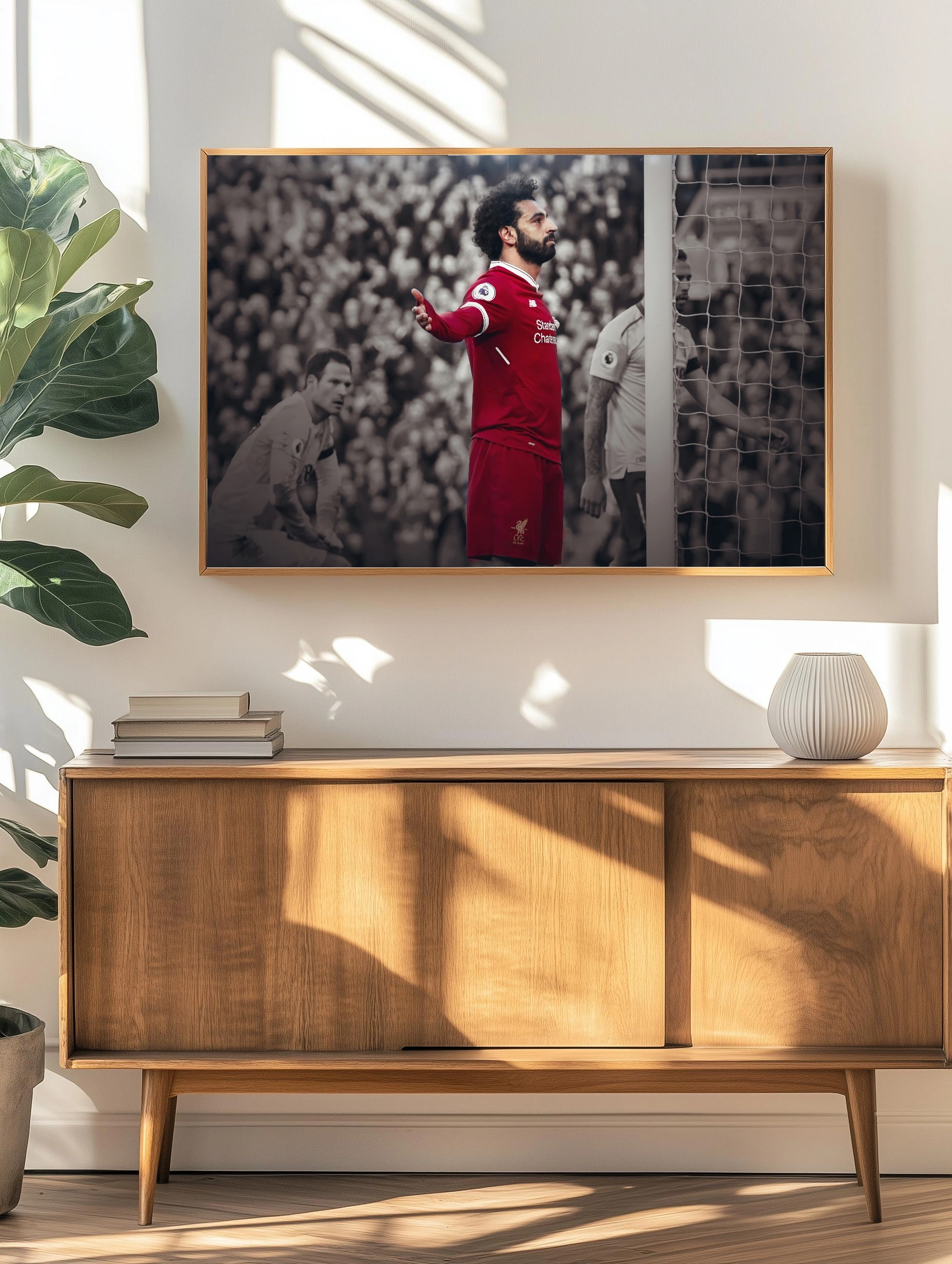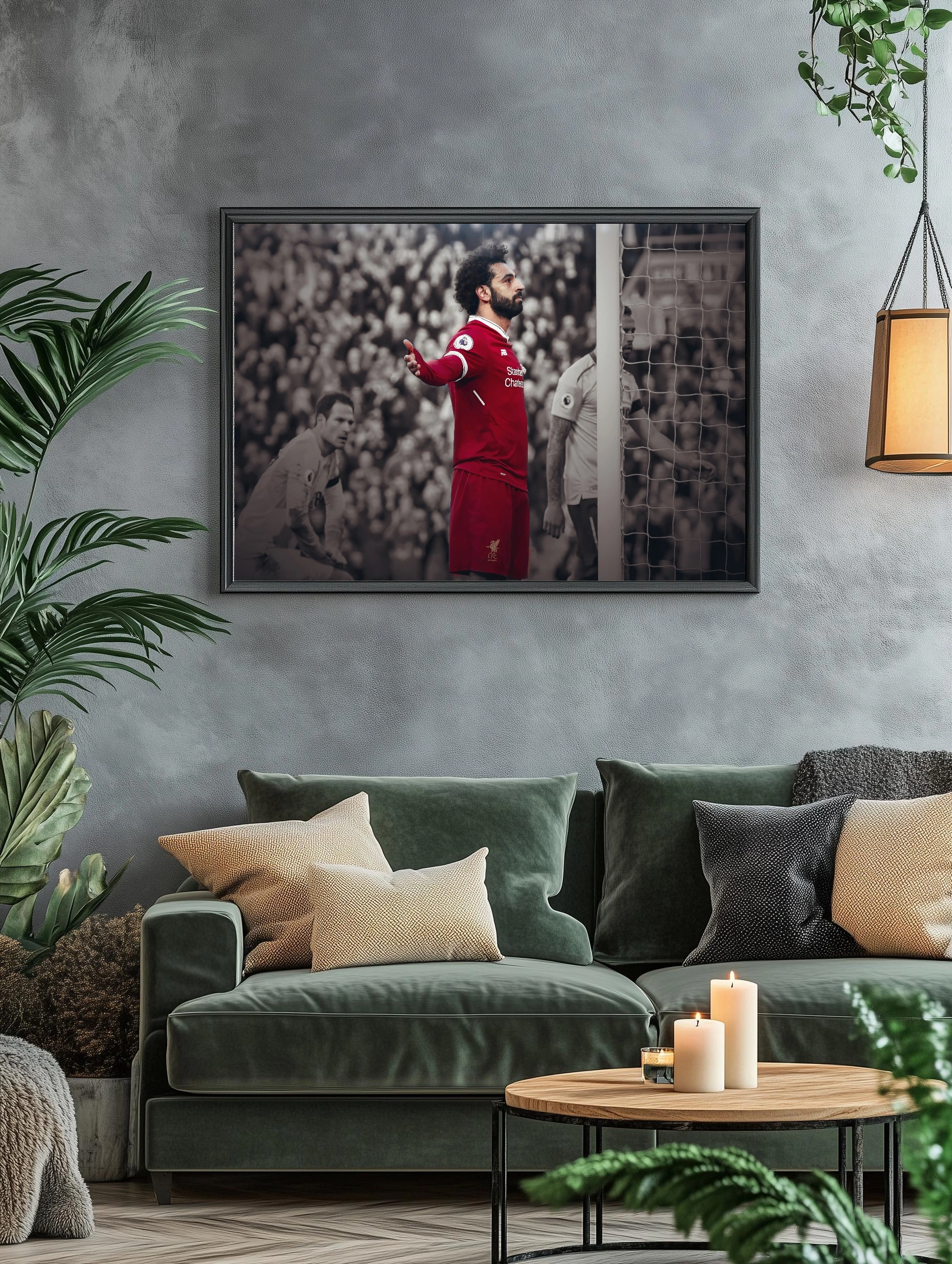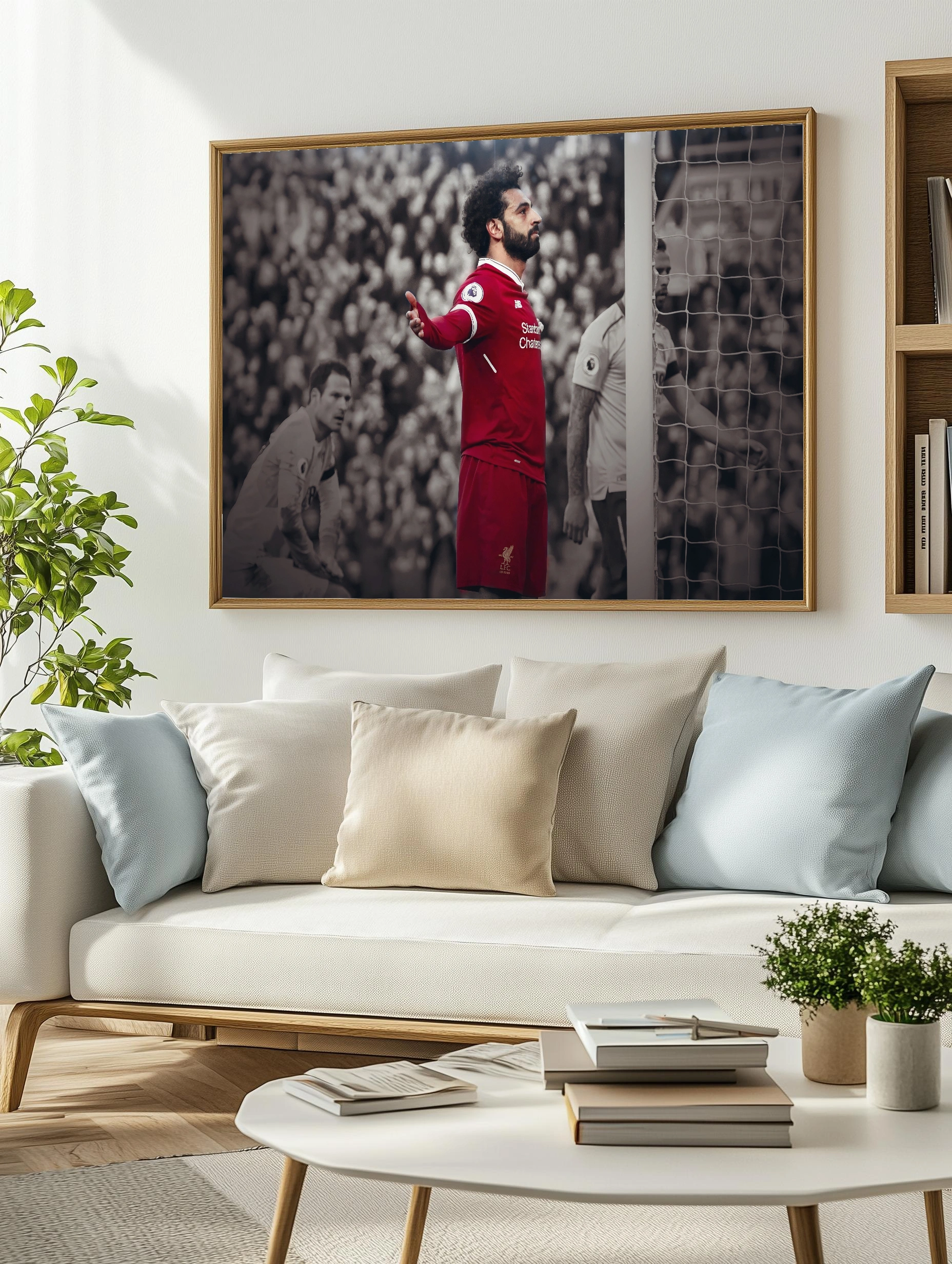 На изображении показан известный футболист Мохамед Салах в яркой красной форме Ливерпуля, стоящий рядом с футбольными воротами на фоне затемненного стадиона. Фотография подчеркивает эмоции игрока в драматичный спортивный момент. Идеально подходит для интерьерного декора футбольных фанатов, стильный и выразительный художественный плакат.