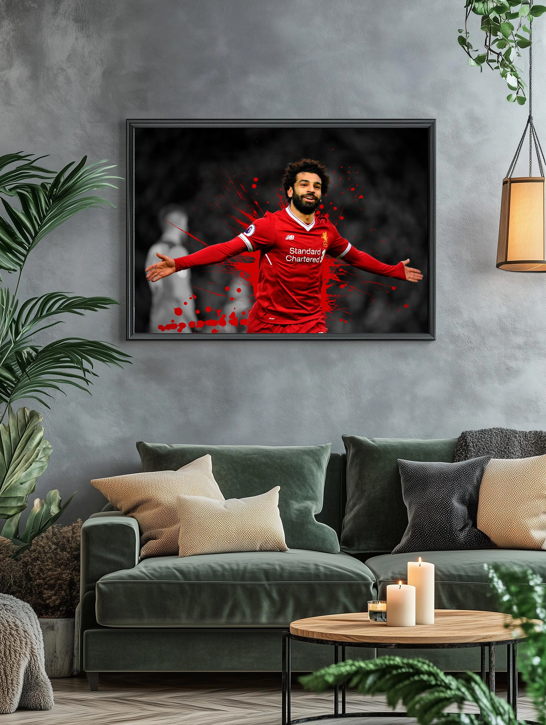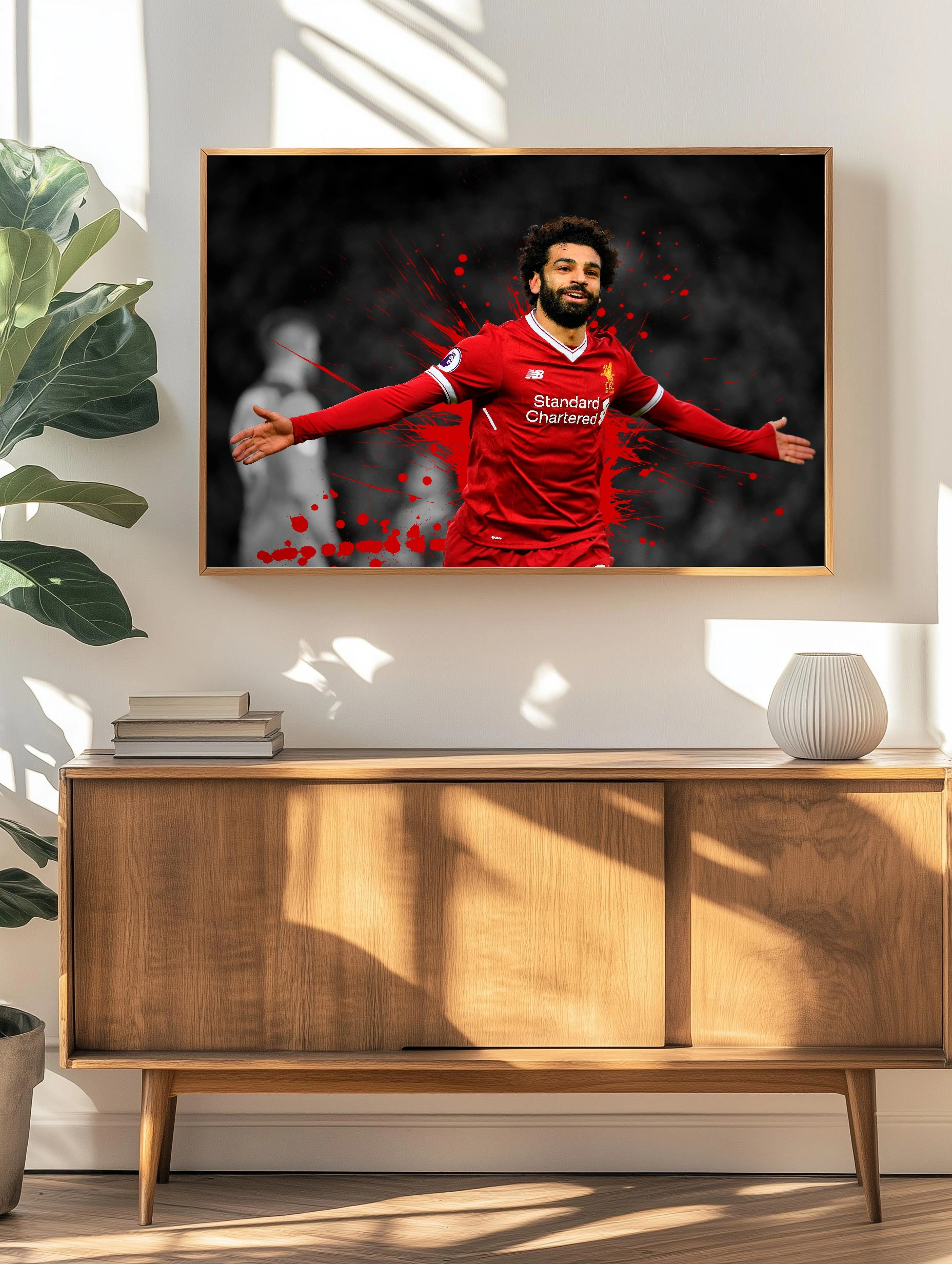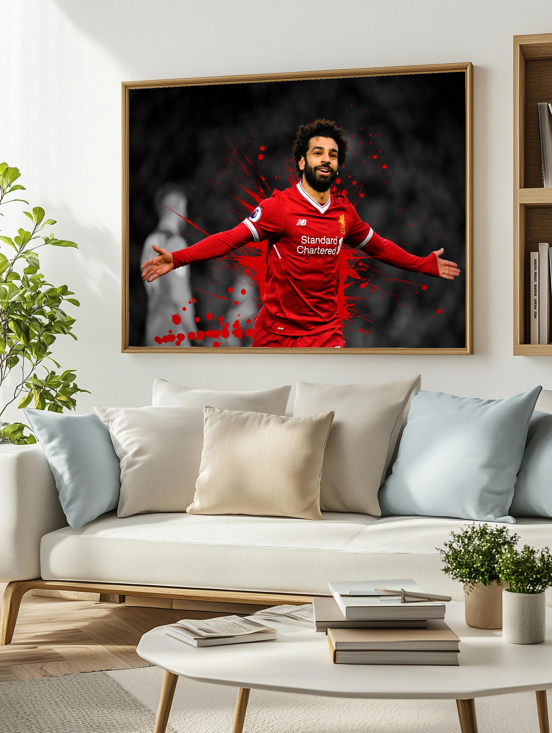 Изображение представляет собой динамичную картину звезды футбола Мохамеда Салаха в красной форме Ливерпуля. Фон выполнен в черно-белой гамме, что подчеркивает ярко-красный цвет формы и добавляет контраста. Художественные красные брызги вокруг футболиста придают интерьерному искусству экспрессивность и живость, делая этот декоративный плакат стильным декором стен для фанатов футбола и поклонников Салаха.