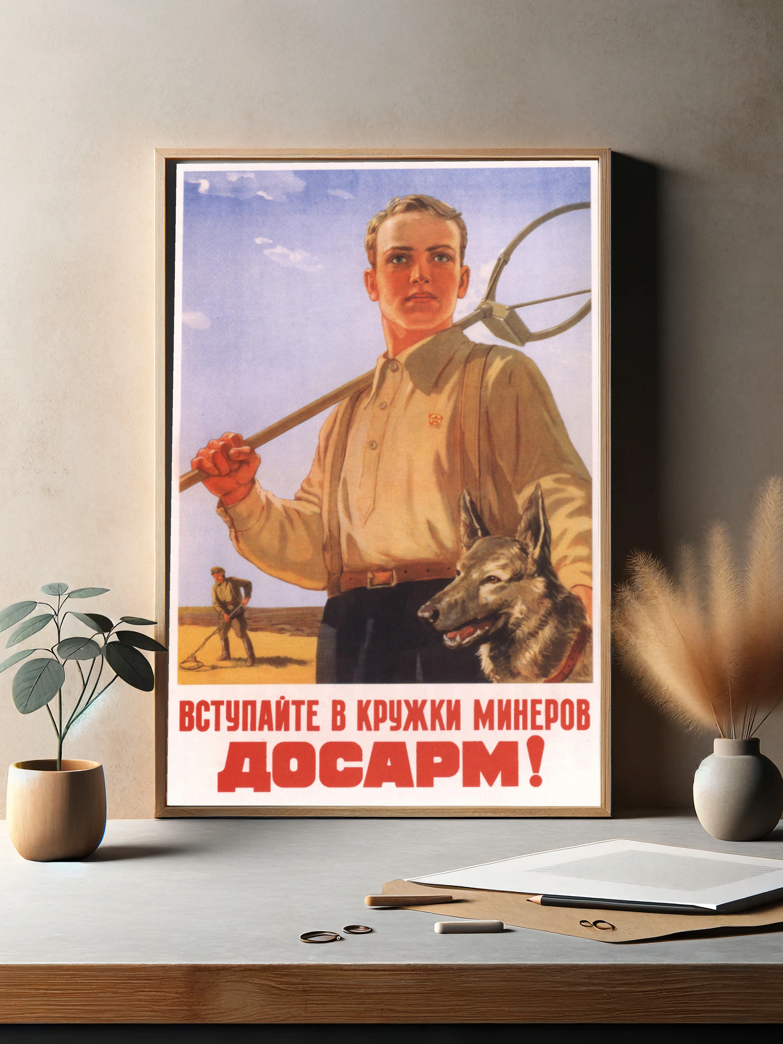 Изображение советского агитационного плаката с молодым мужчиной в рабочей одежде, держащим инструмент, и собакой на переднем плане. На заднем плане виден ещё один человек с металлоискателем. Цветовая гамма тёплая и реалистичная, с ярко выраженной энергетикой патриотизма и трудолюбия. Постер отлично подойдёт для интерьера в стиле советского ретро и исторических коллекций.