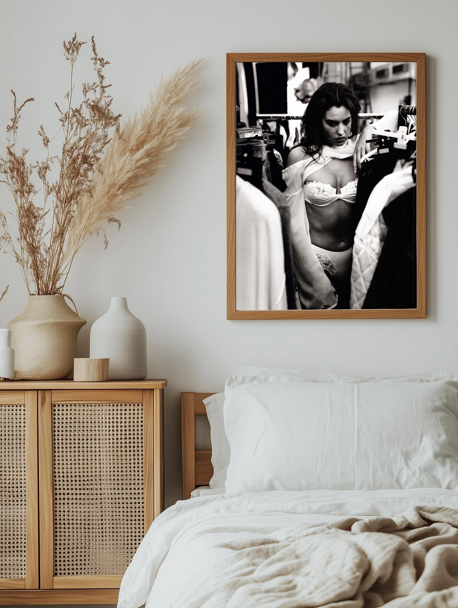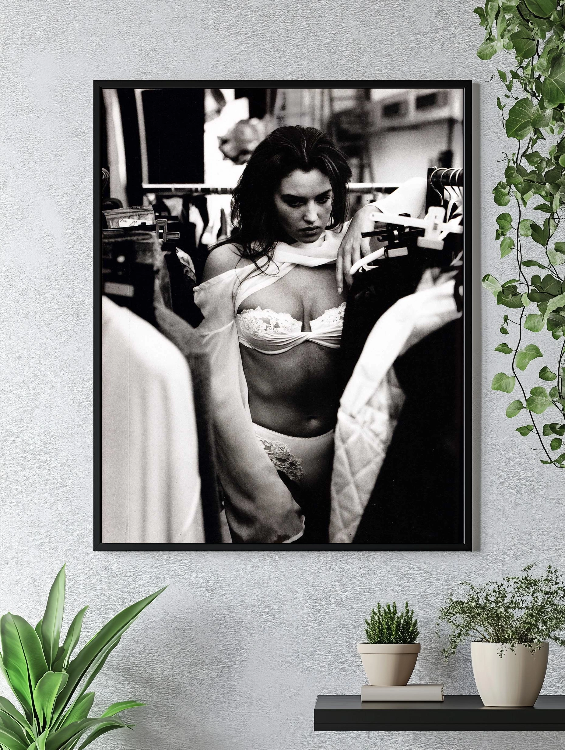 На изображении показана молодая женщина в черно-белом исполнении, облачённая в изящное кружевное белье и прозрачную ткань. Она окружена одеждой на вешалках, вероятно, в комнате для примерки или гардеробе. Монохромное цветовое решение усиливает драматизм и подчеркнутую интимность сцены, создавая художественный интерьерный плакат с элементами моды и чувственности.