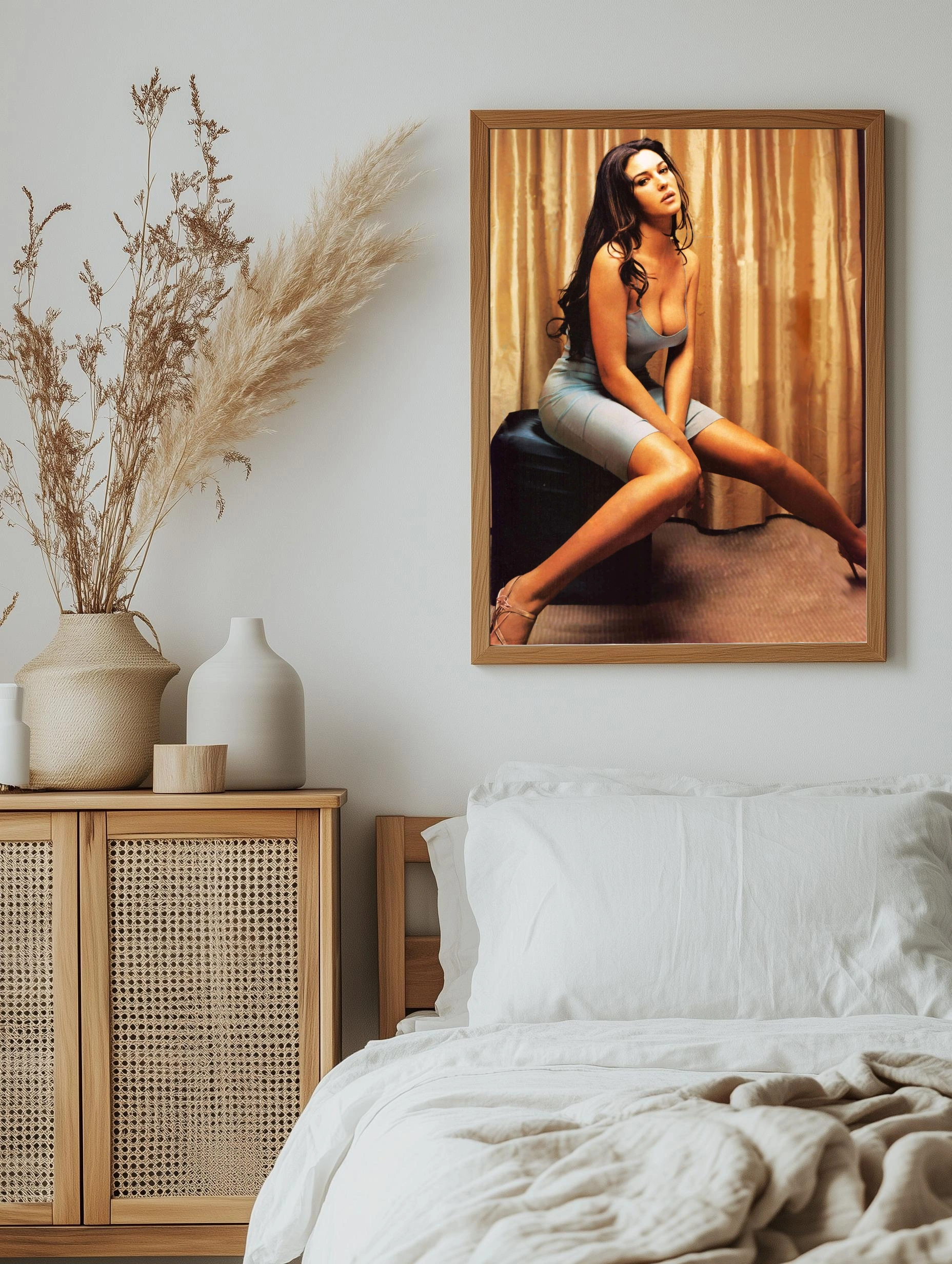 На изображении показана женщина в голубом платье с глубоким декольте, сидящая на черном кубе на фоне теплых золотисто-коричневых штор. Фото передает атмосферу уюта и интимности, сочетая мягкие цвета и выразительный образ. Идеальная картина для интерьера гостиной или спальни в стиле современного искусства.