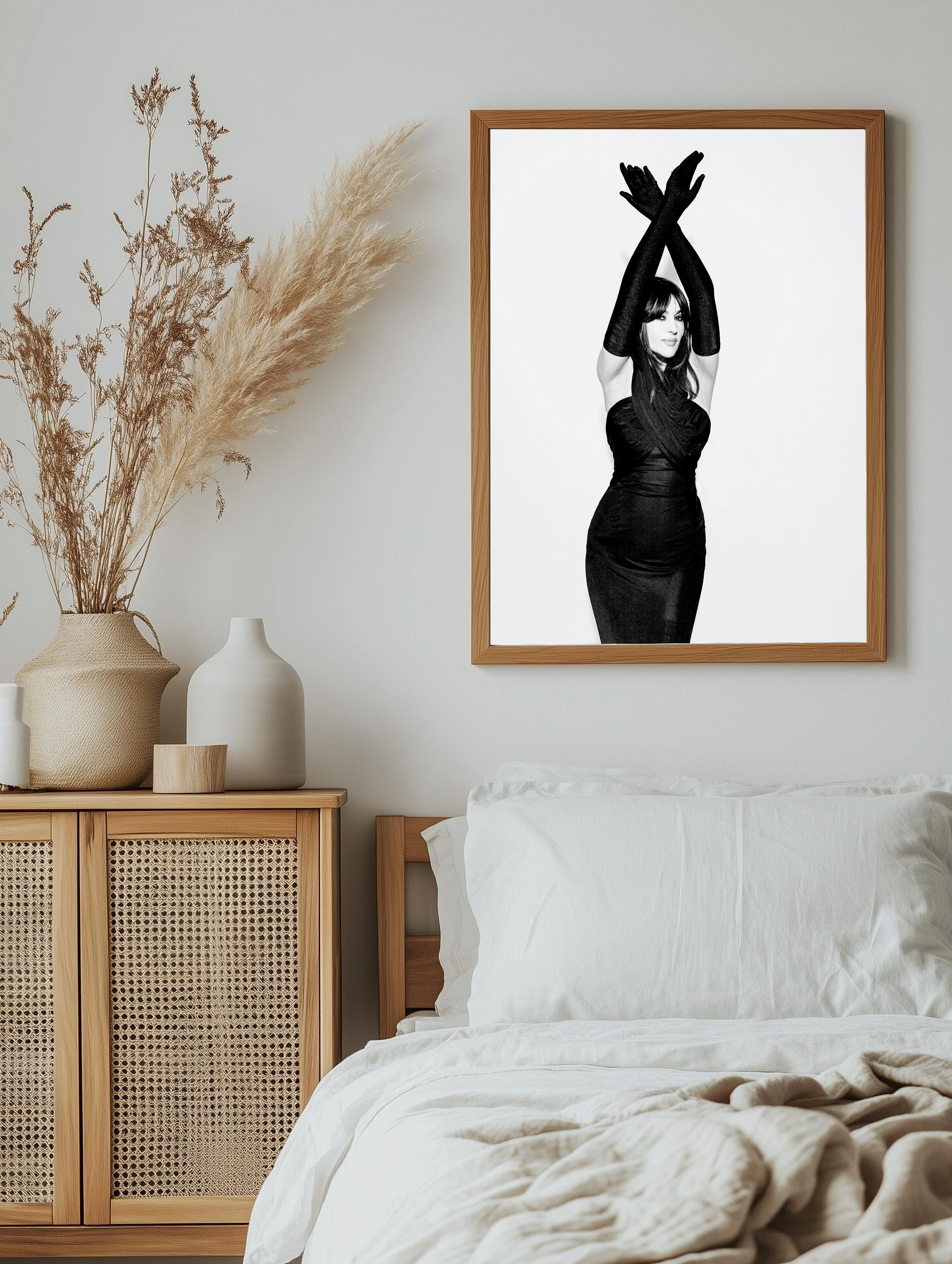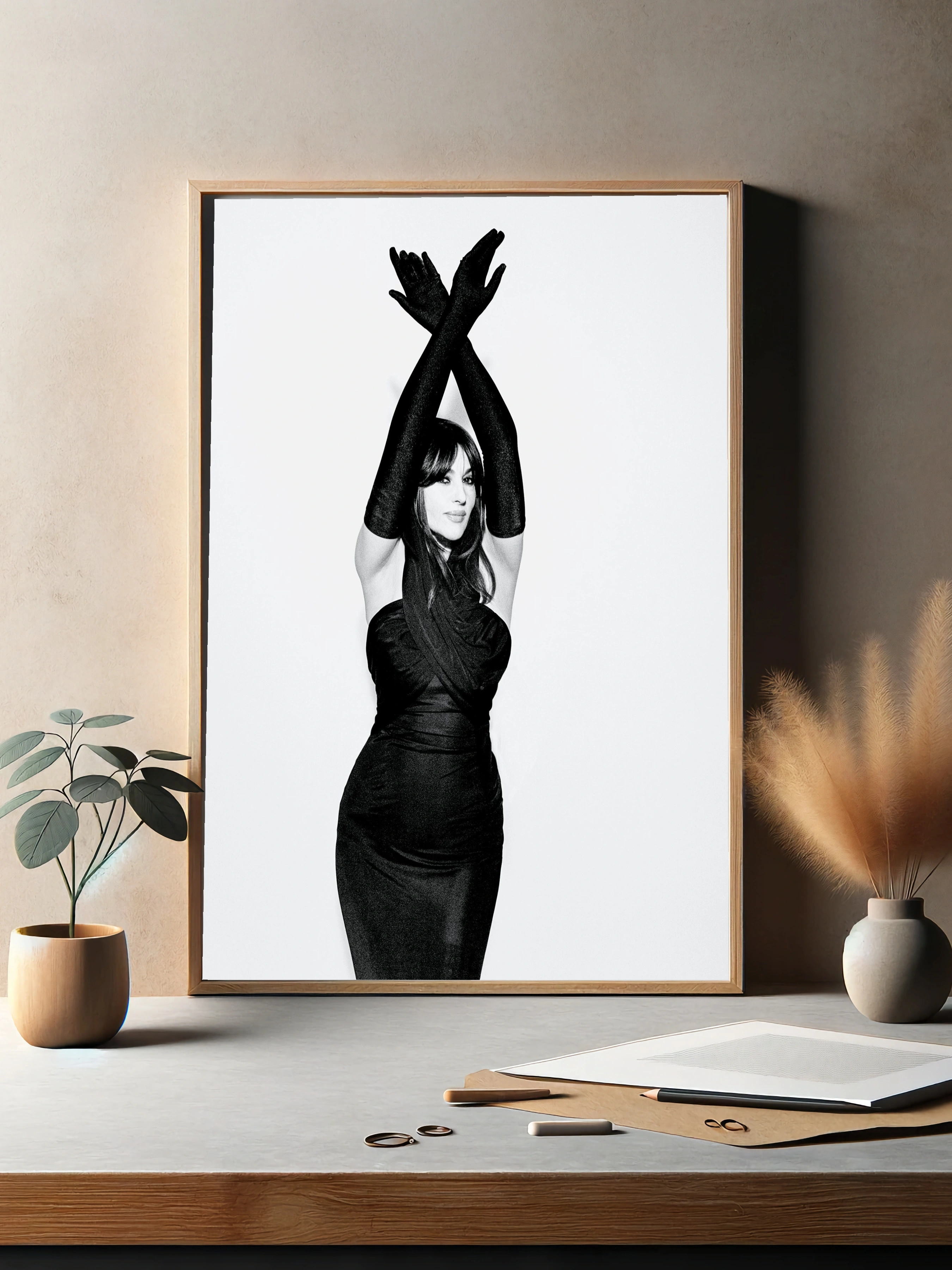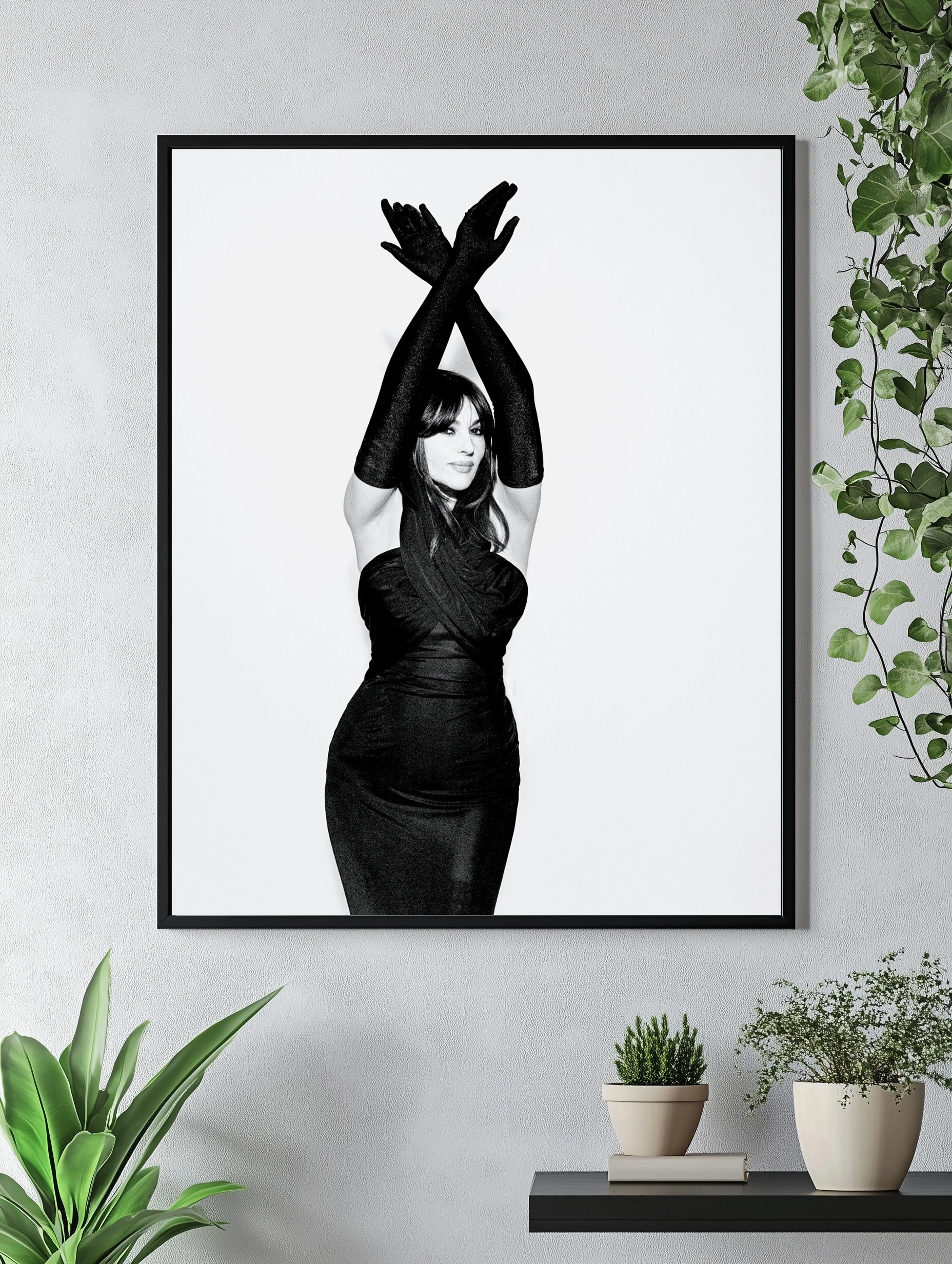 На изображении изображена женщина в элегантном вечернем платье и длинных перчатках, выполненных в чёрном цвете. Строгий минимализм, контрастный чёрно-белый стиль и выразительная поза создают атмосферу утончённости и загадочности. Это современное искусство для стен, подходящее как интерьерный постер в гостиную или офис, подчеркивающее изящество и стиль.