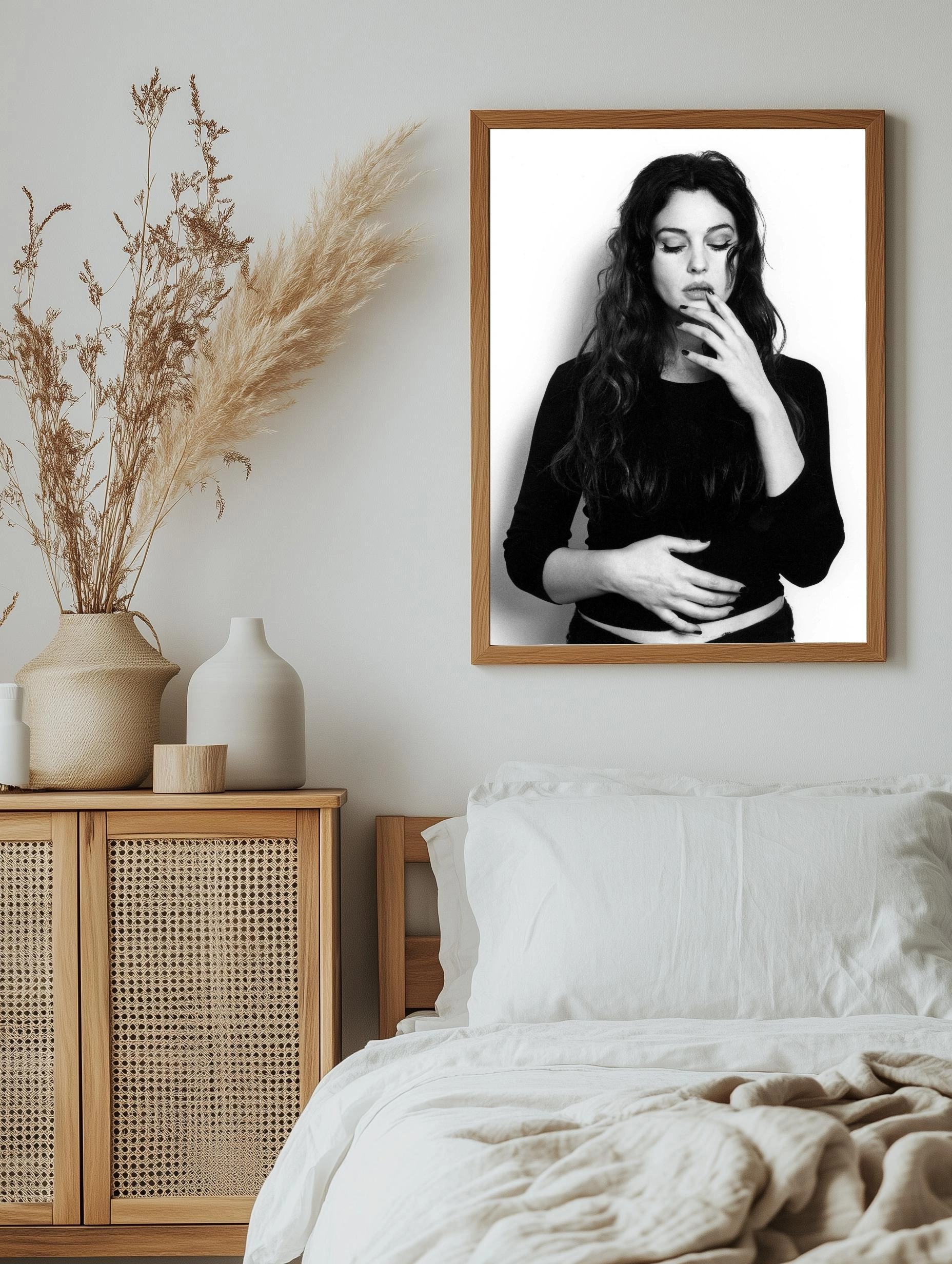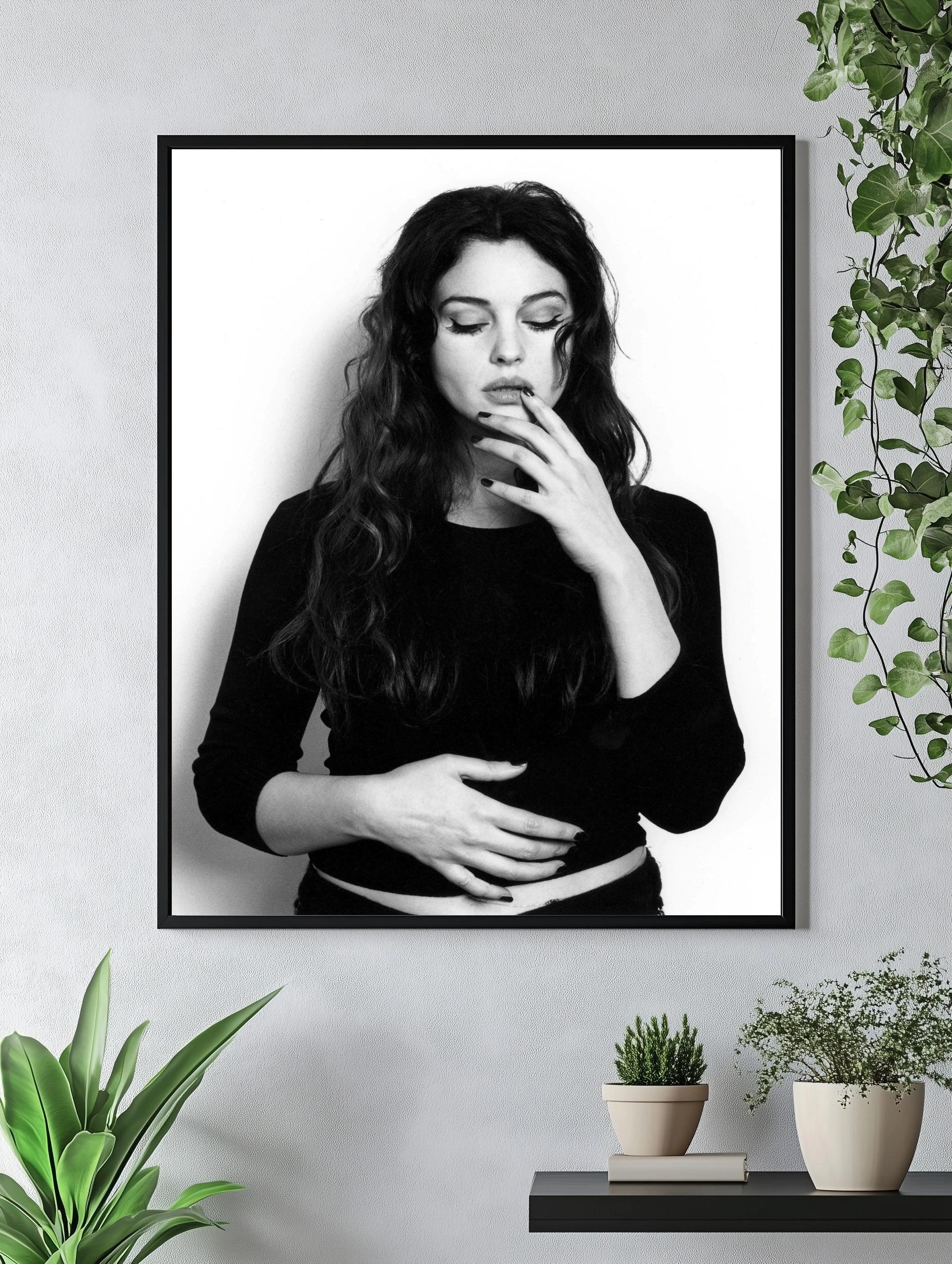 Черно-белая художественная картина изображает молодую женщину с закрытыми глазами, передающую настроение задумчивости и внутреннего покоя. Контрастные оттенки создают выразительный и стильный интерьерный декор, подходящий для гостиной, спальни или офиса. Уникальное современное искусство, подчёркивающее элегантность и мудрость.