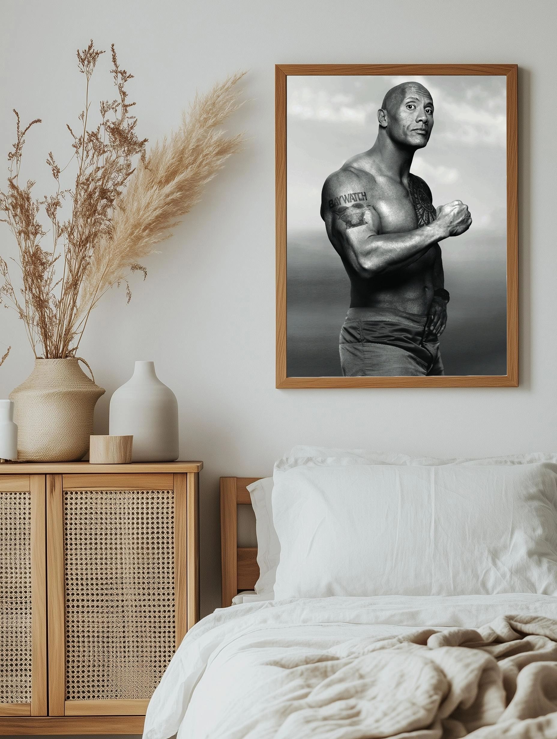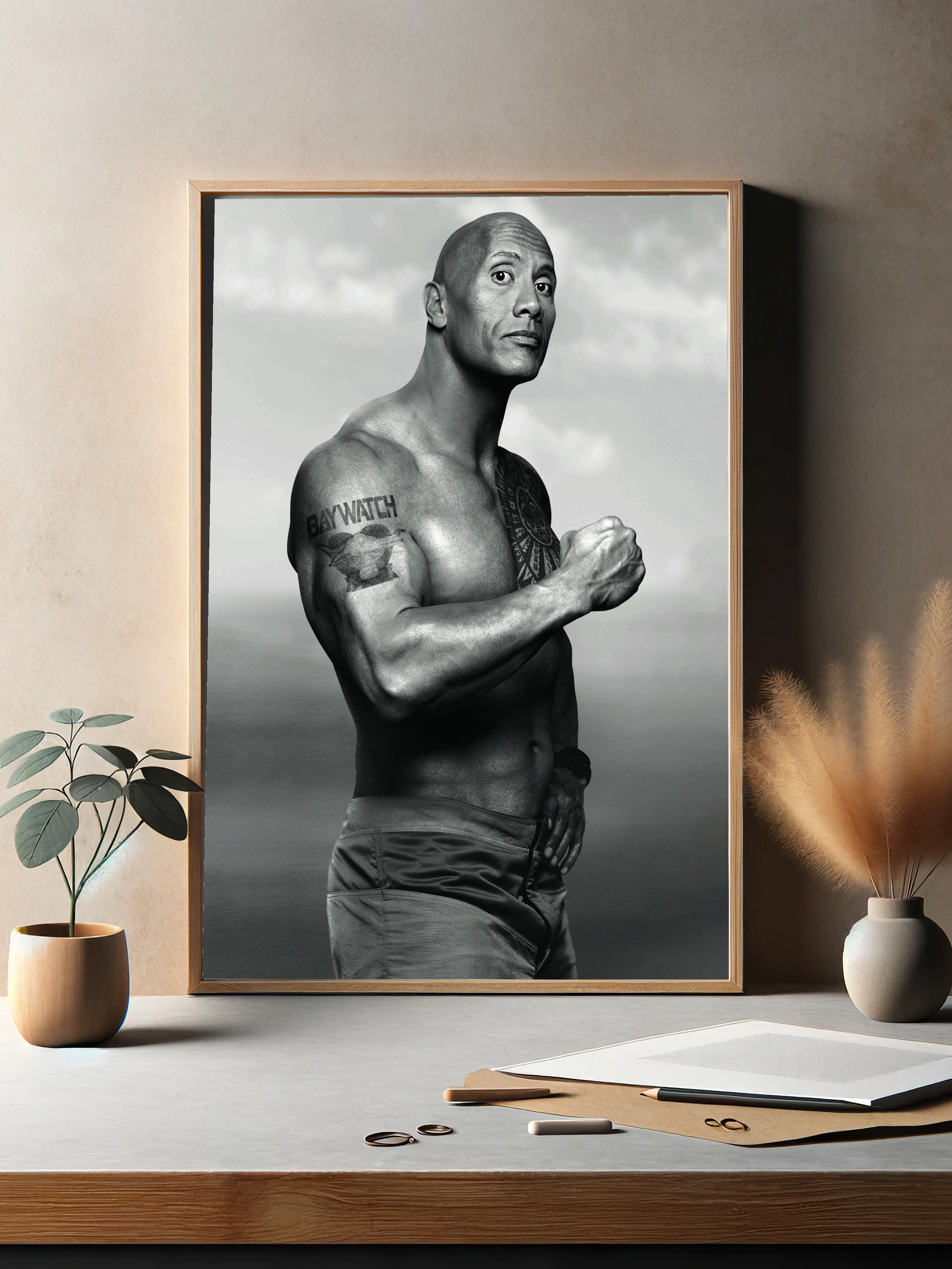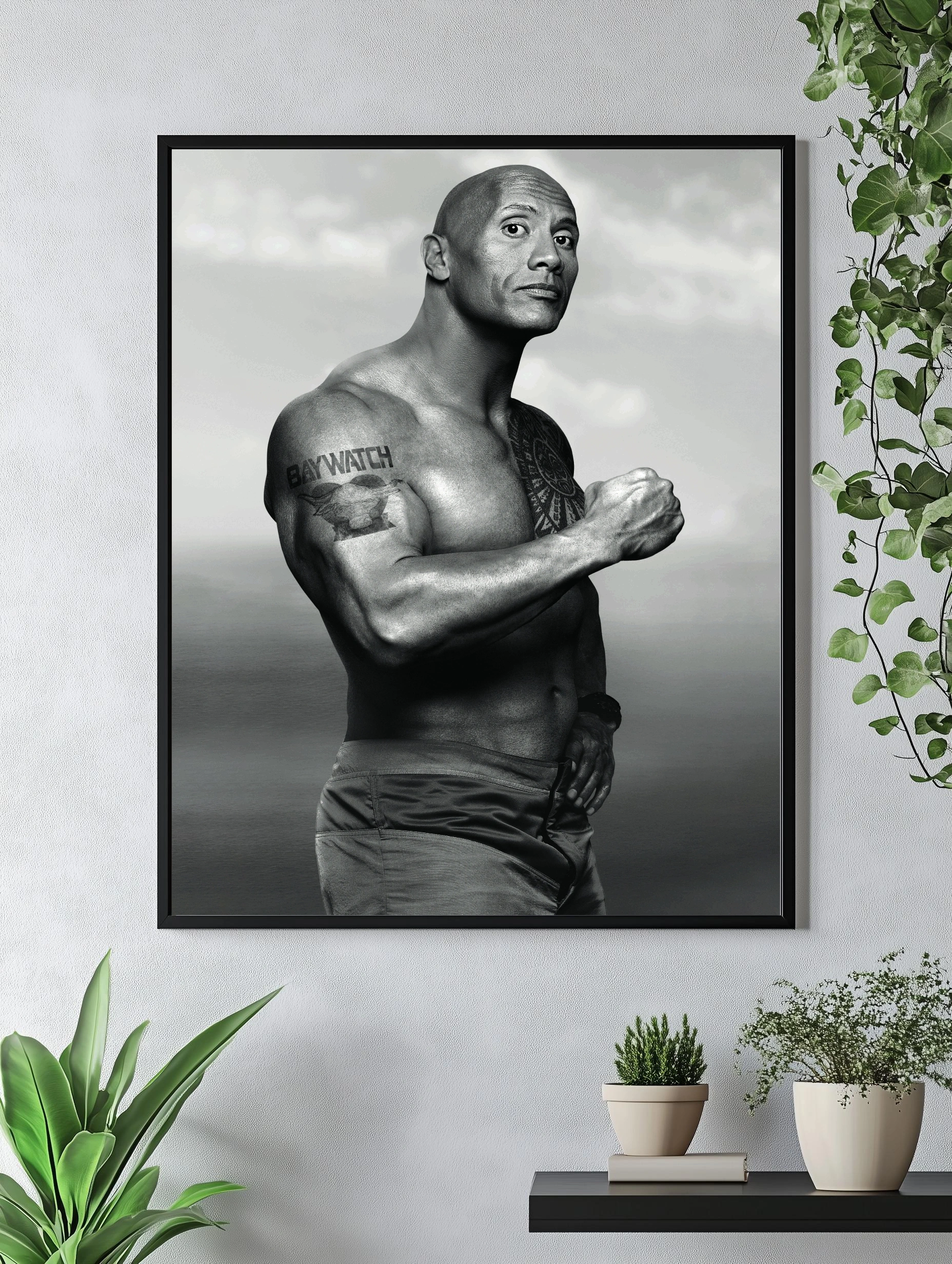 Черно-белая картина с изображением знаменитого актера и рестлера Дуэйна Джонсона, известного как Скалa. Лаконичная композиция акцентирует внимание на его мускулистом телосложении, с татуировками и надписью BAYWATCH на плече. Этот интерьерный арт с мужской энергетикой идеально подойдет для современного декора дома или офиса.