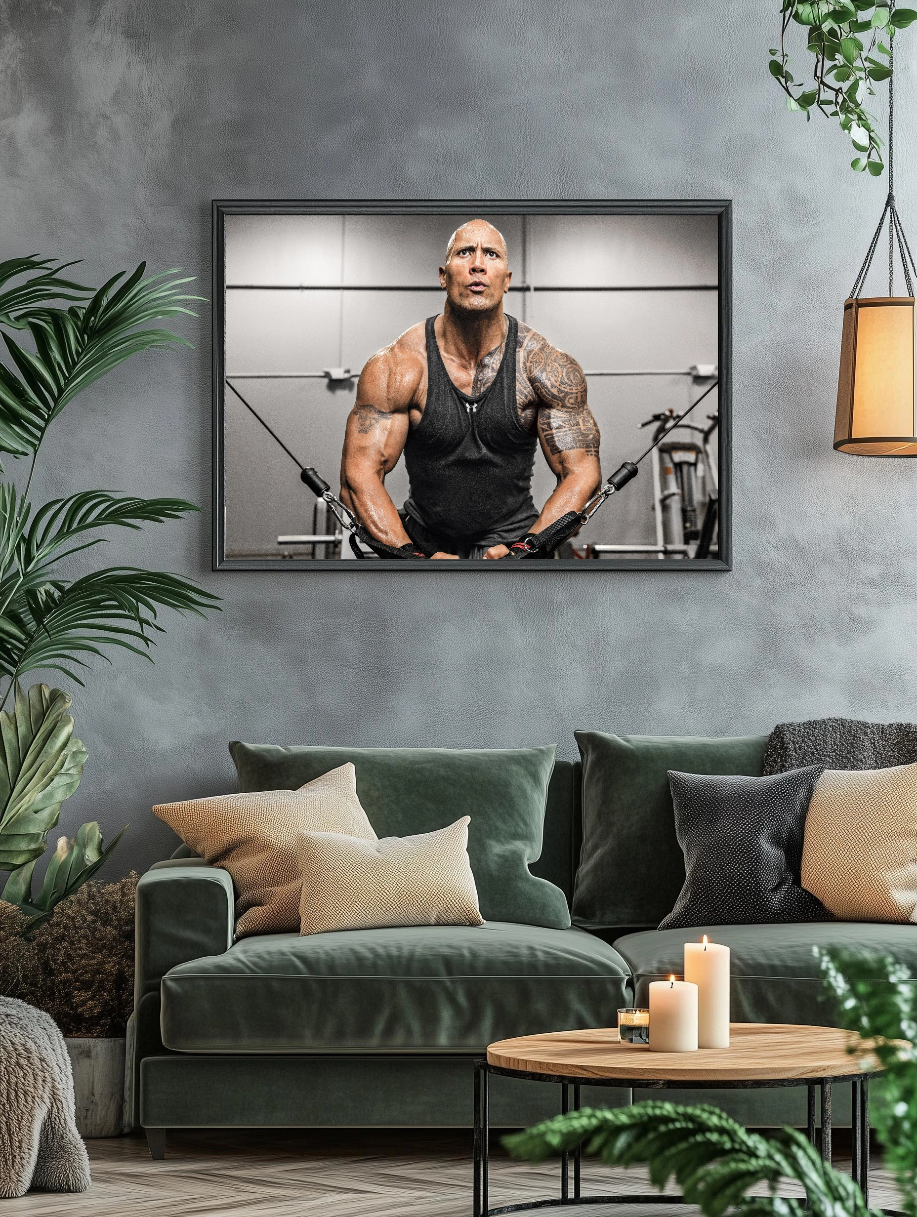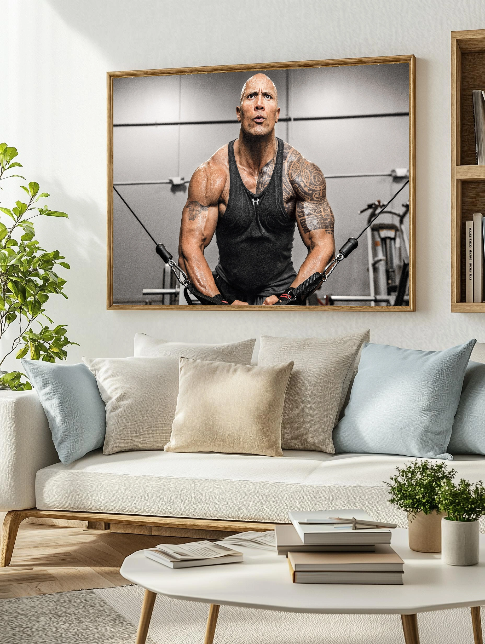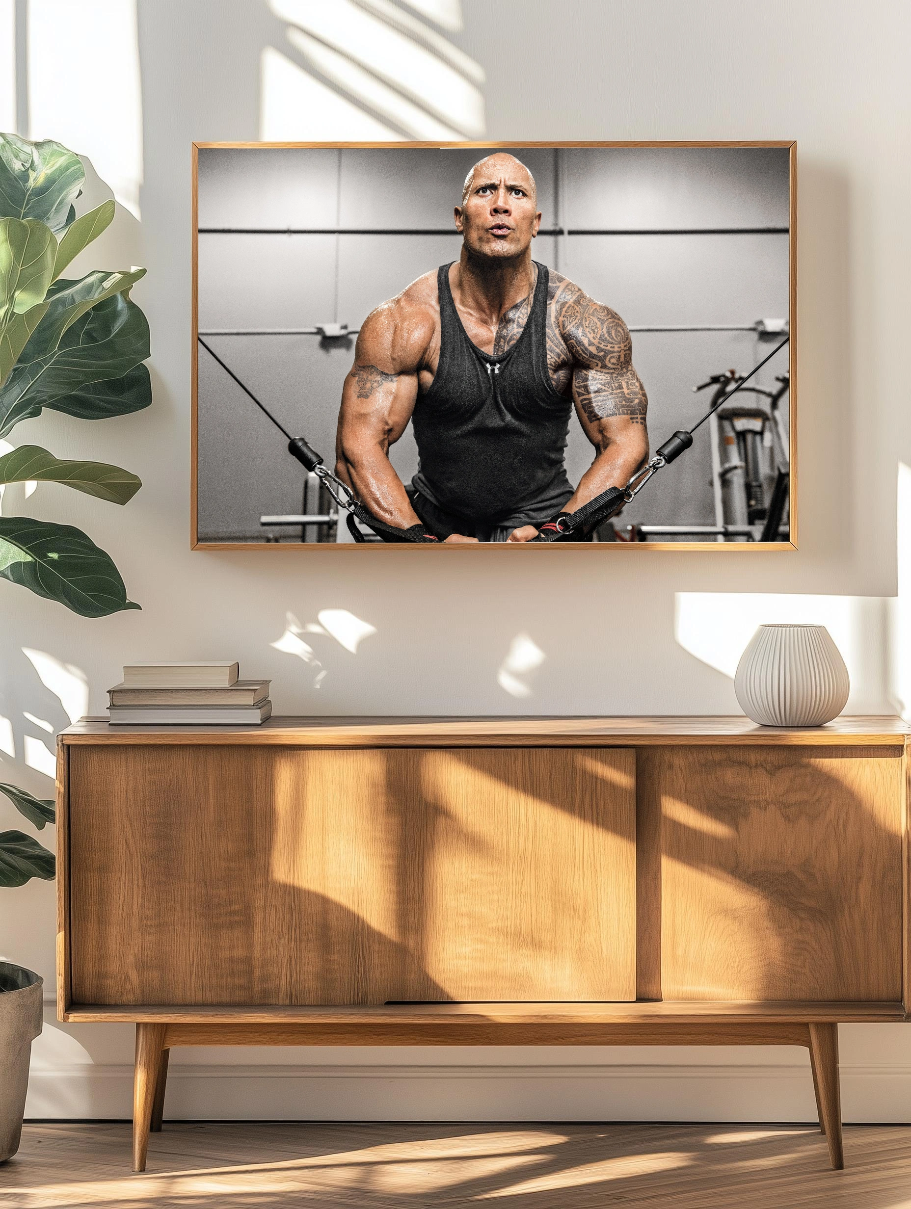 Изображение показывает мускулистого бодибилдера с татуировками, выполняющего упражнение на тренажёре в спортивном зале. Фон нейтральный, акцент сделан на телосложении и динамике движения. Этот интерьерный декоративный плакат отлично подойдёт для оформления спортзала, офиса или гостиной, вдохновляя на спортивные достижения и подчеркивая эстетику тела в современном искусстве для стен.