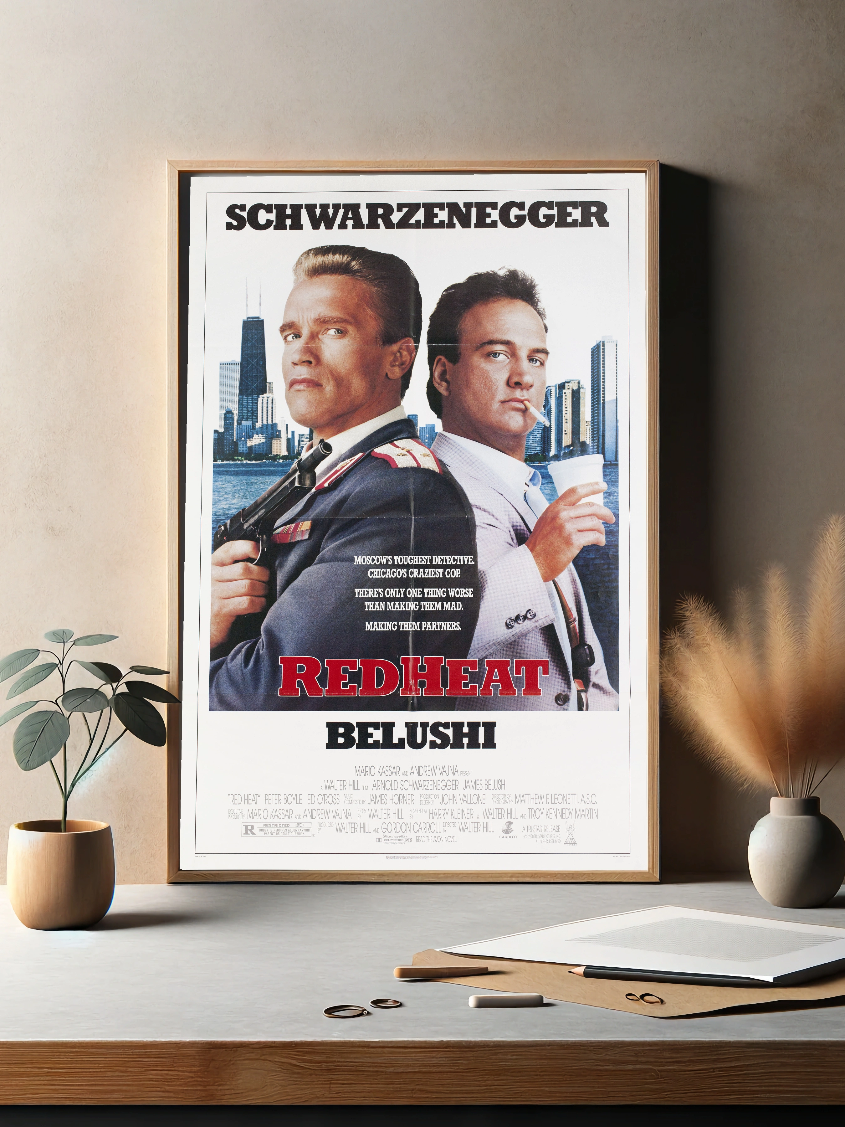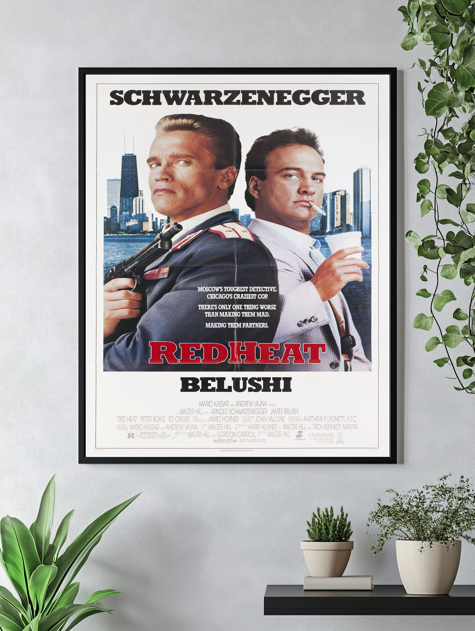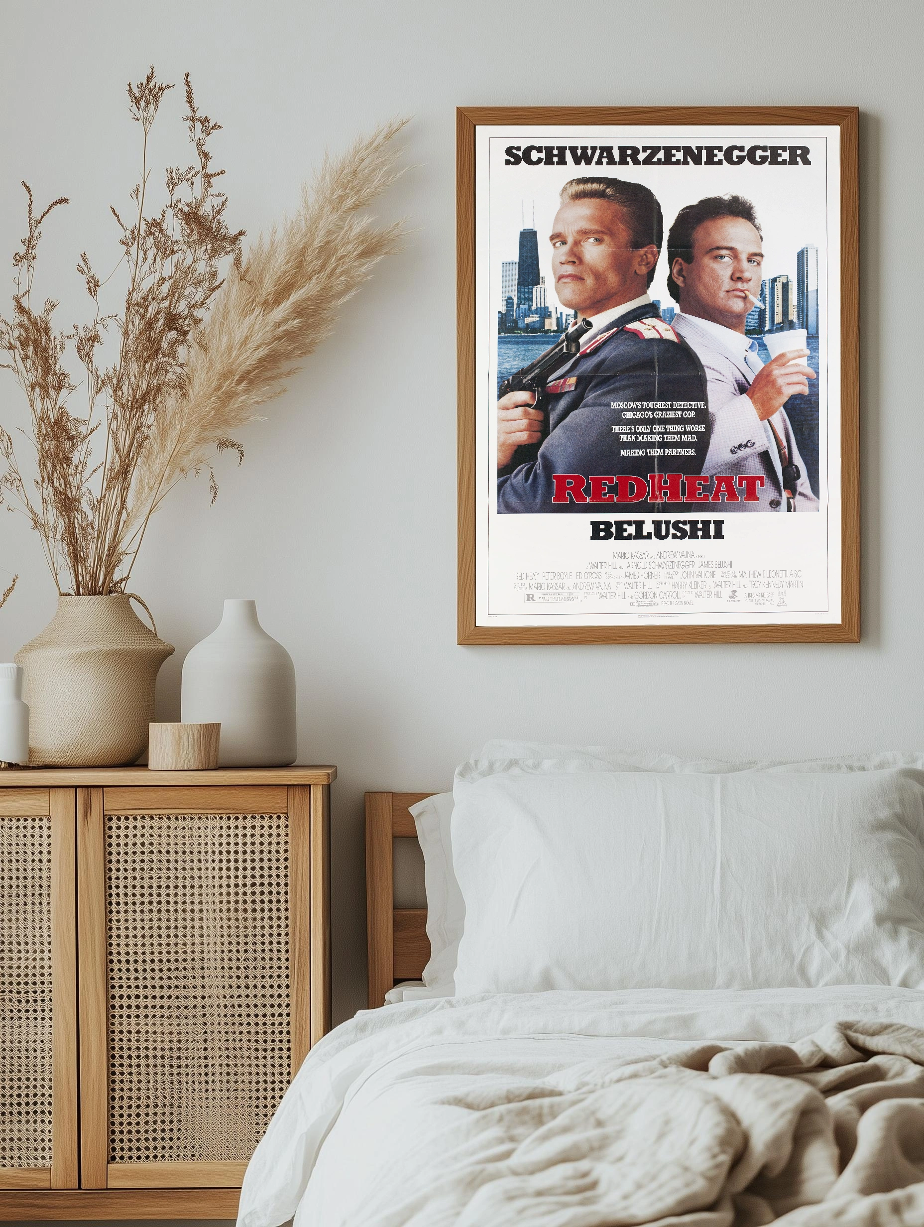Яркий интерьерный арт с изображением Арнольда Шварценеггера и Джеймса Белуши из культового криминального фильма «Красная жара». На фоне городских небоскребов, стильная картина для спальни или гостиной, создающая атмосферу напряжённого детективного сюжета. Отличный декоративный плакат с принтом для поклонников классики кино.