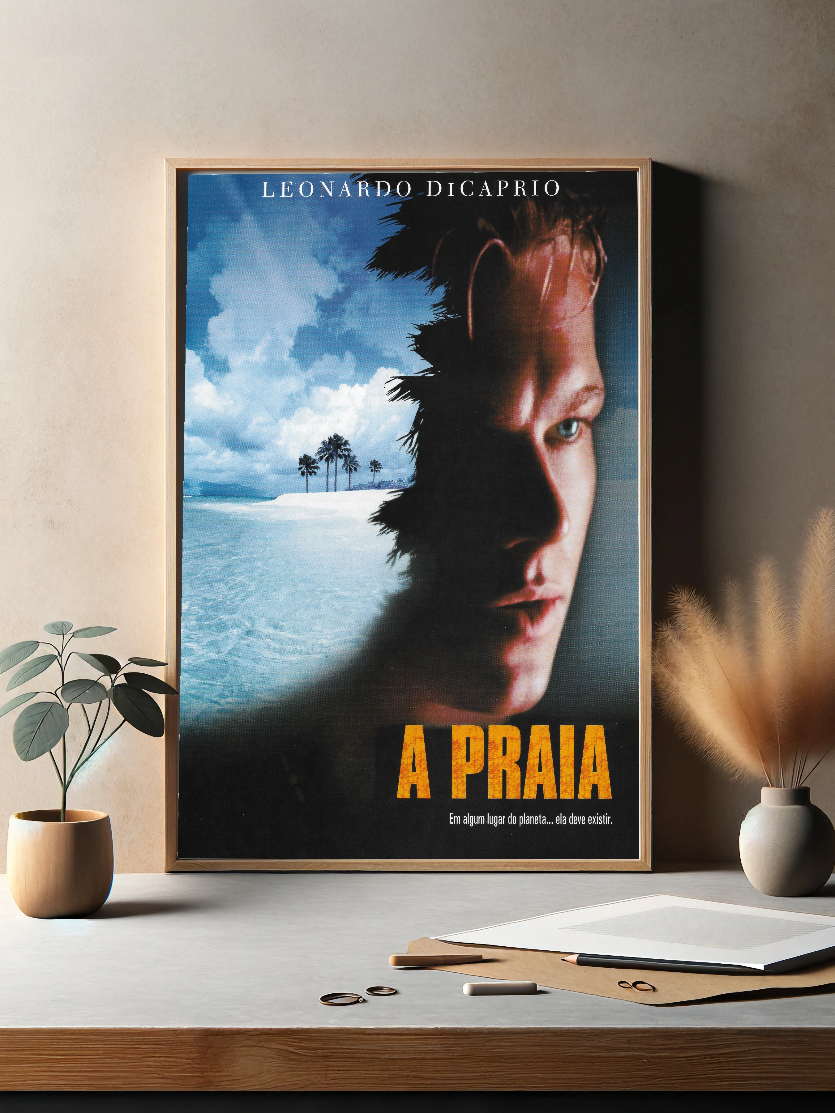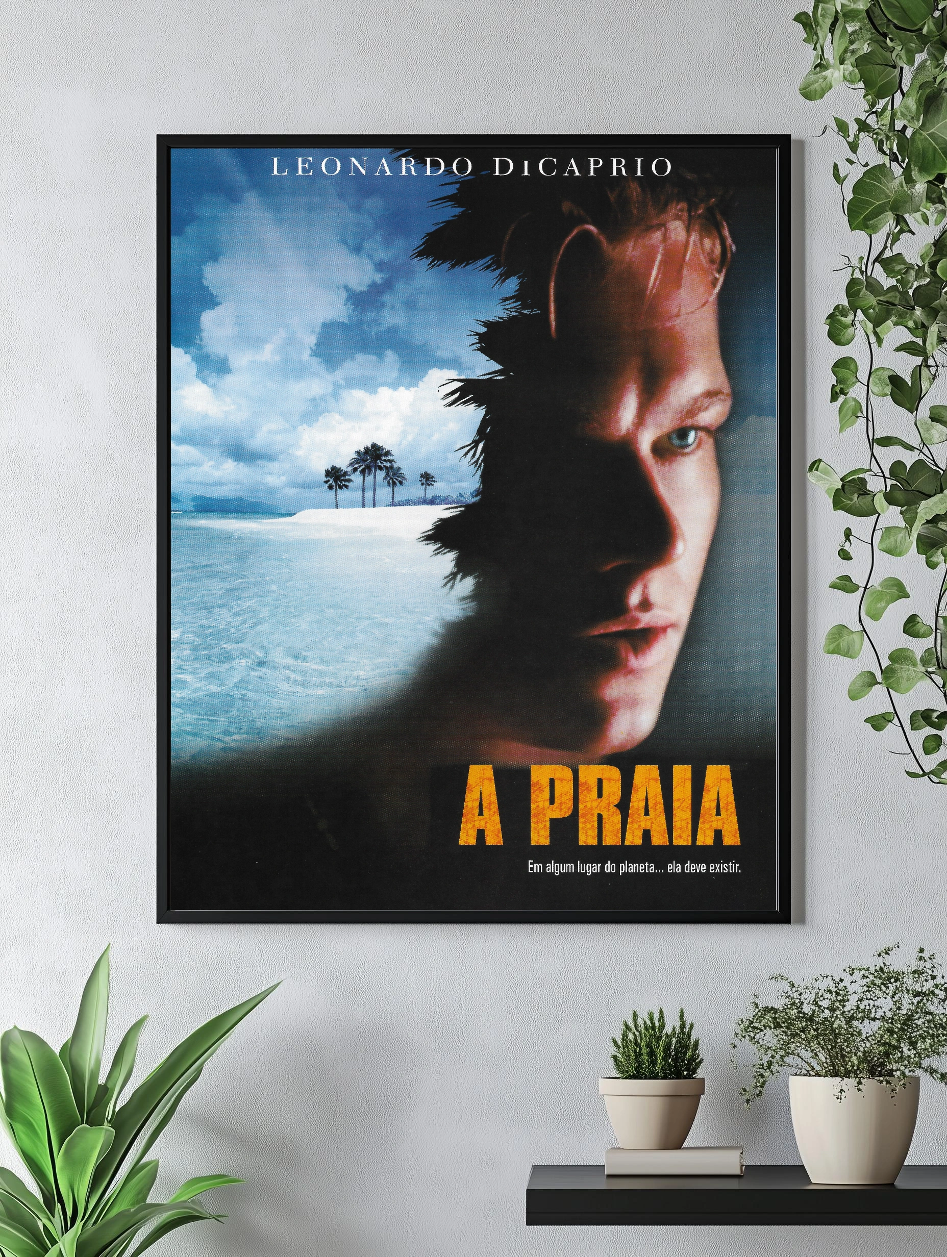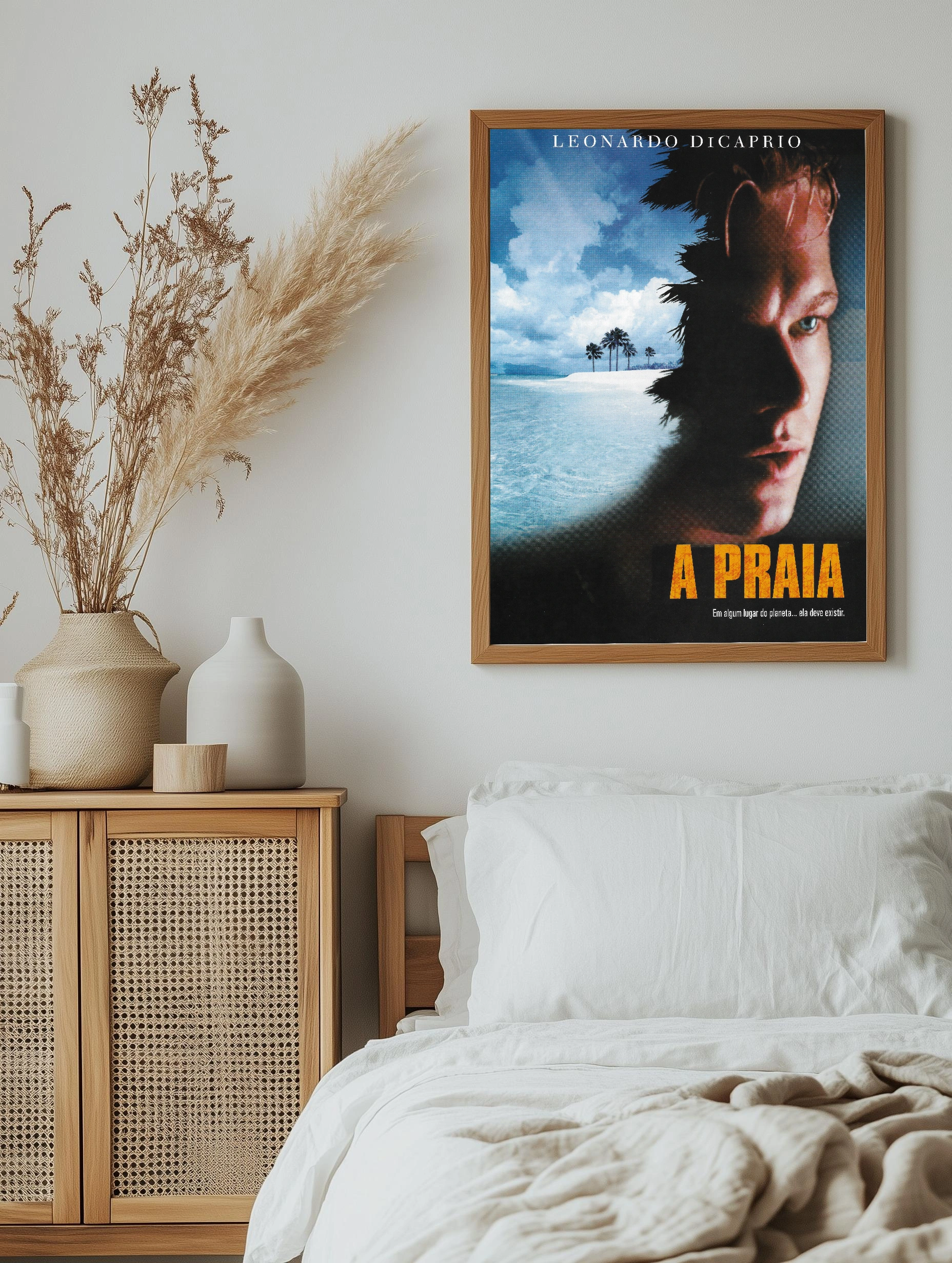 На изображении — крупный, драматический портрет знаменитого актёра Леонардо Ди Каприо, перемешанный с морским пейзажем. Светлое небо с белыми облаками и пальмами на заднем плане контрастирует с тёмной, концентрационной тенью лица. Используются синие и чёрные тона, что придаёт изображению атмосферу таинственности и глубины. Это интерьерное искусство для стен в декоративном стиле с элементами киноискусства и портретной фотографии.