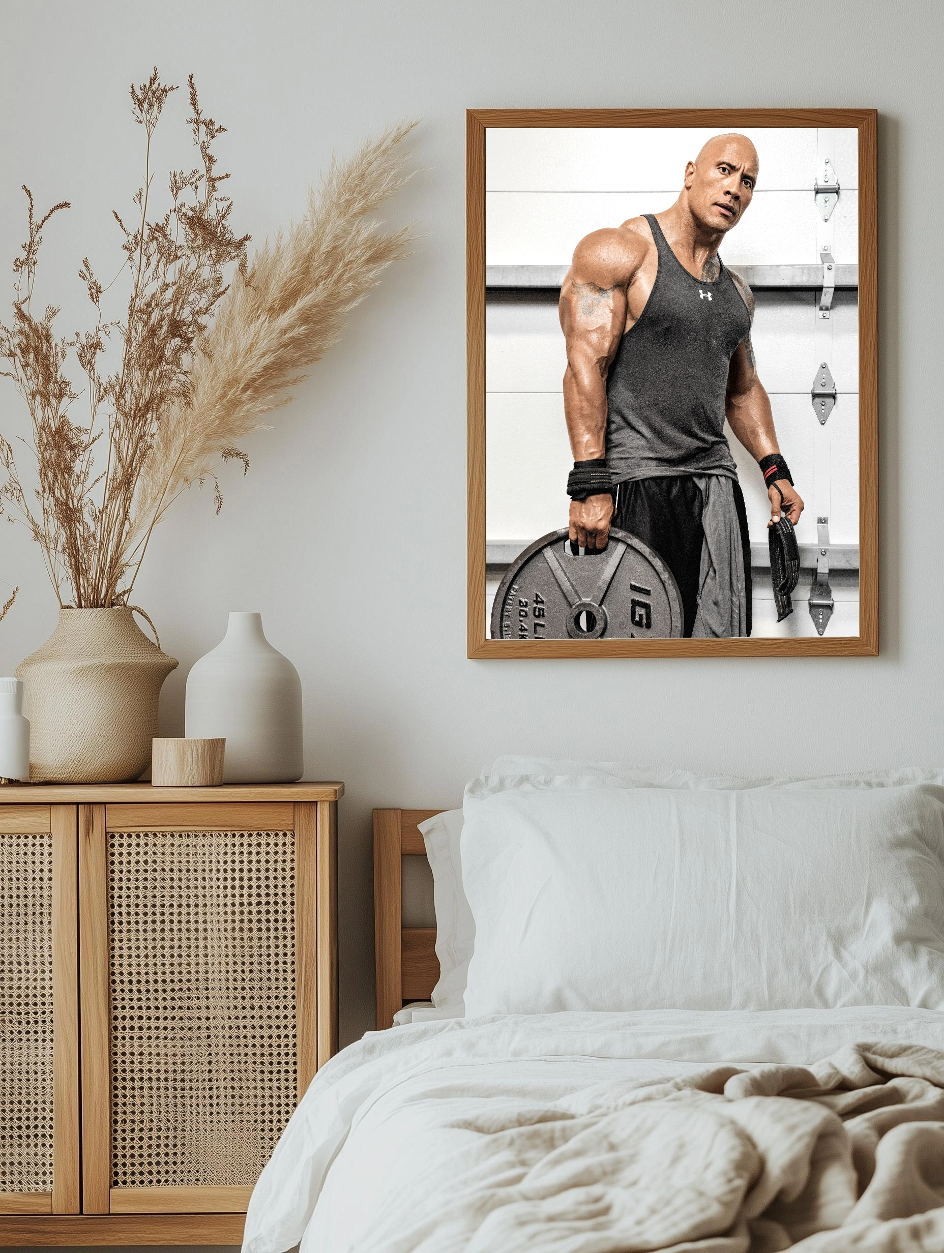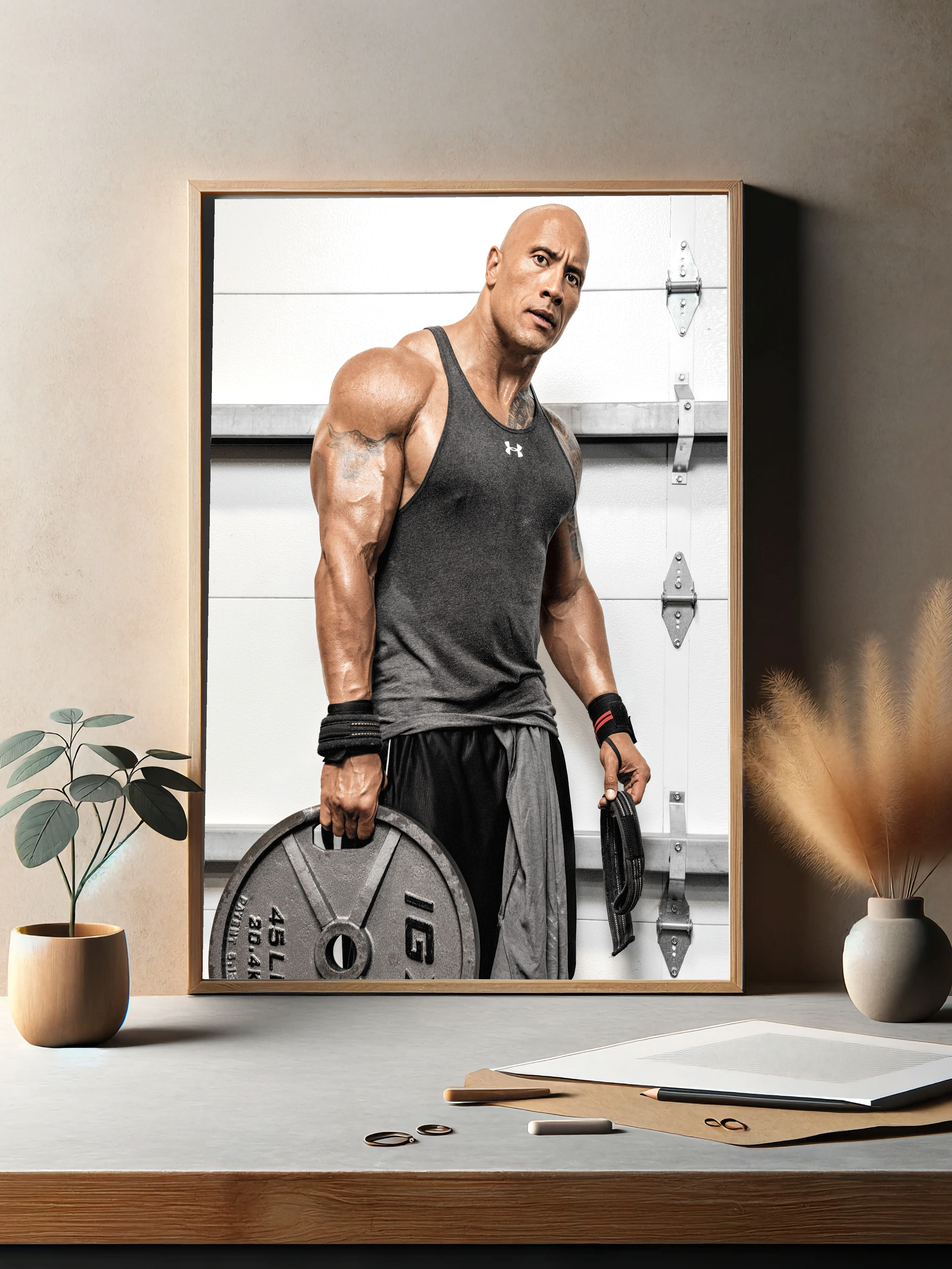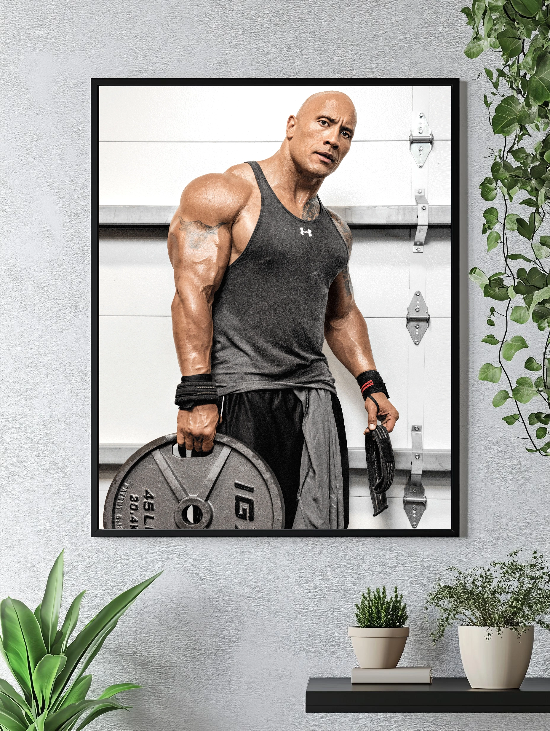 Изображение демонстрирует Дуэйна Джонсона, известного как Скала, в спортивной экипировке. Он держит груз 45LB в одной руке и спортивный пояс в другой, подчеркивая силу, мужественность и спортивный дух. Стиль фотографии — реалистичный, с акцентом на мускулатуру и напряжение, цвета преимущественно серый, черный и оттенки кожи. Такой интерьерный декоративный плакат идеально подходит для спортзала или комнаты тренировки, внося атмосферу мотивации и силы в пространство.