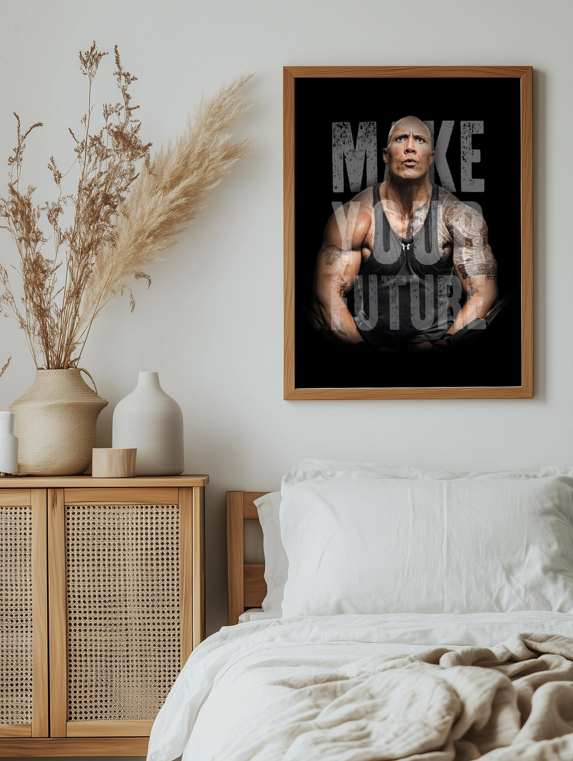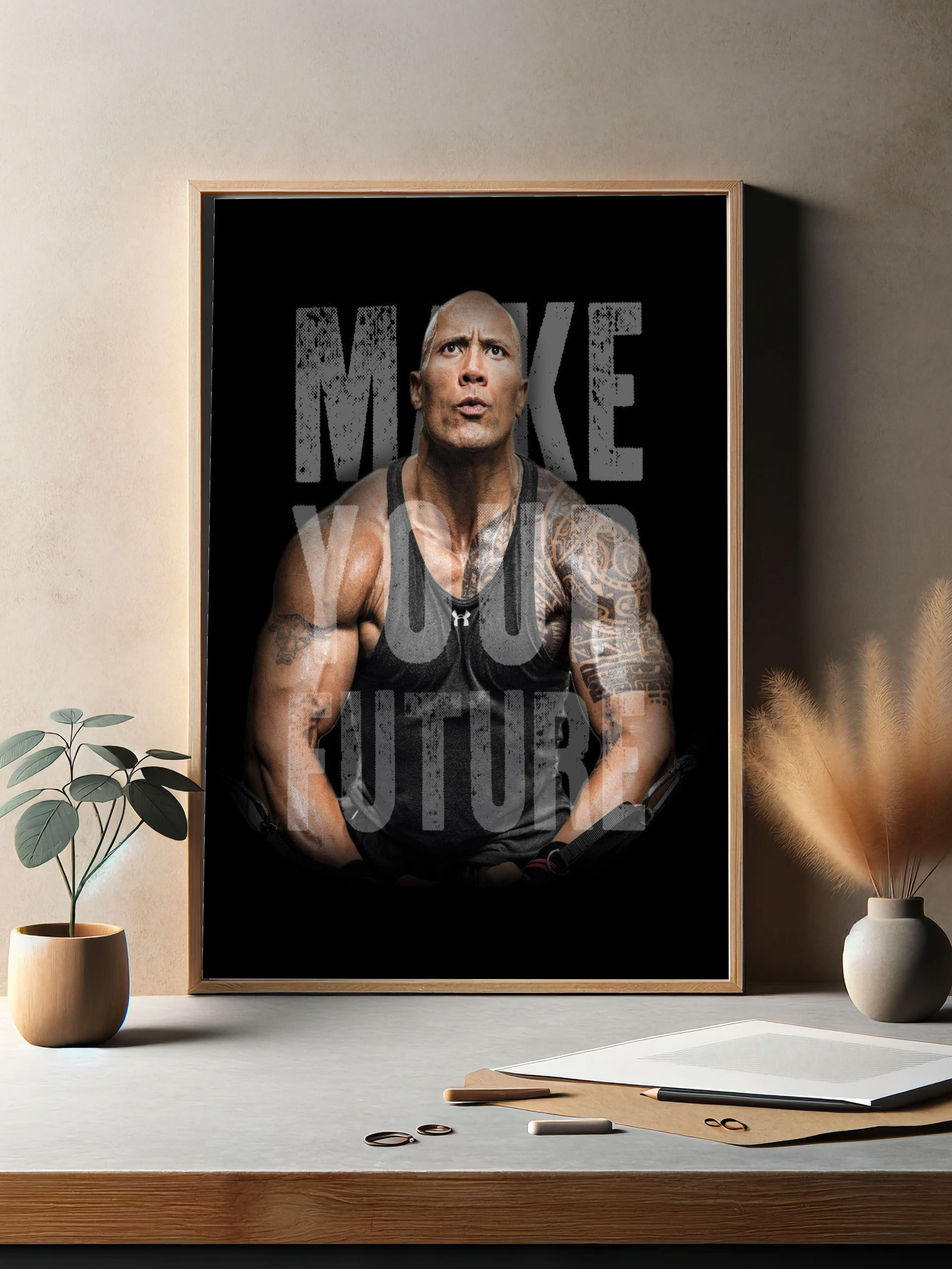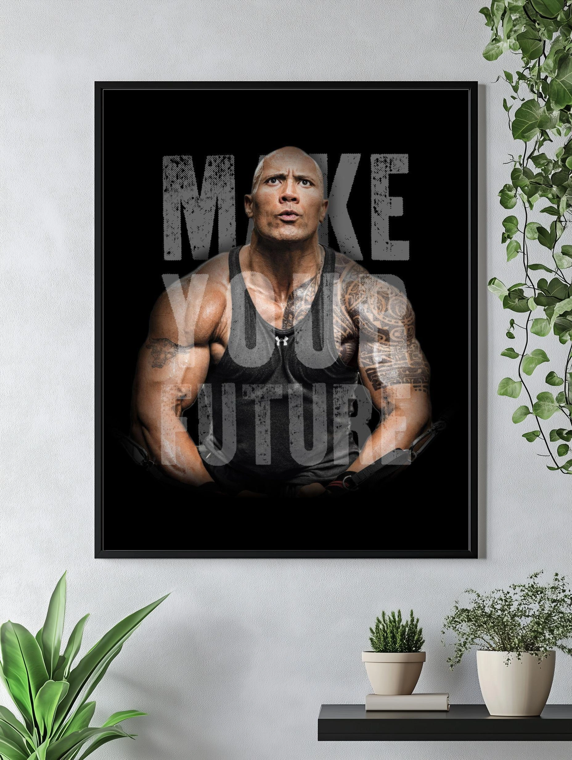 На изображении представлен знаменитый актёр и спортсмен Дуэйн Джонсон в чёрной майке на чёрном фоне. Его выразительный и сосредоточенный взгляд подчёркивается татуировками на руках и яркой мускулатурой. Фраза «MAKE YOUR FUTURE» накладывается крупным шрифтом, придавая изображению мощное мотивирующее настроение. Современное искусство для стен, отлично подходящее для интерьера спортзала или офиса.