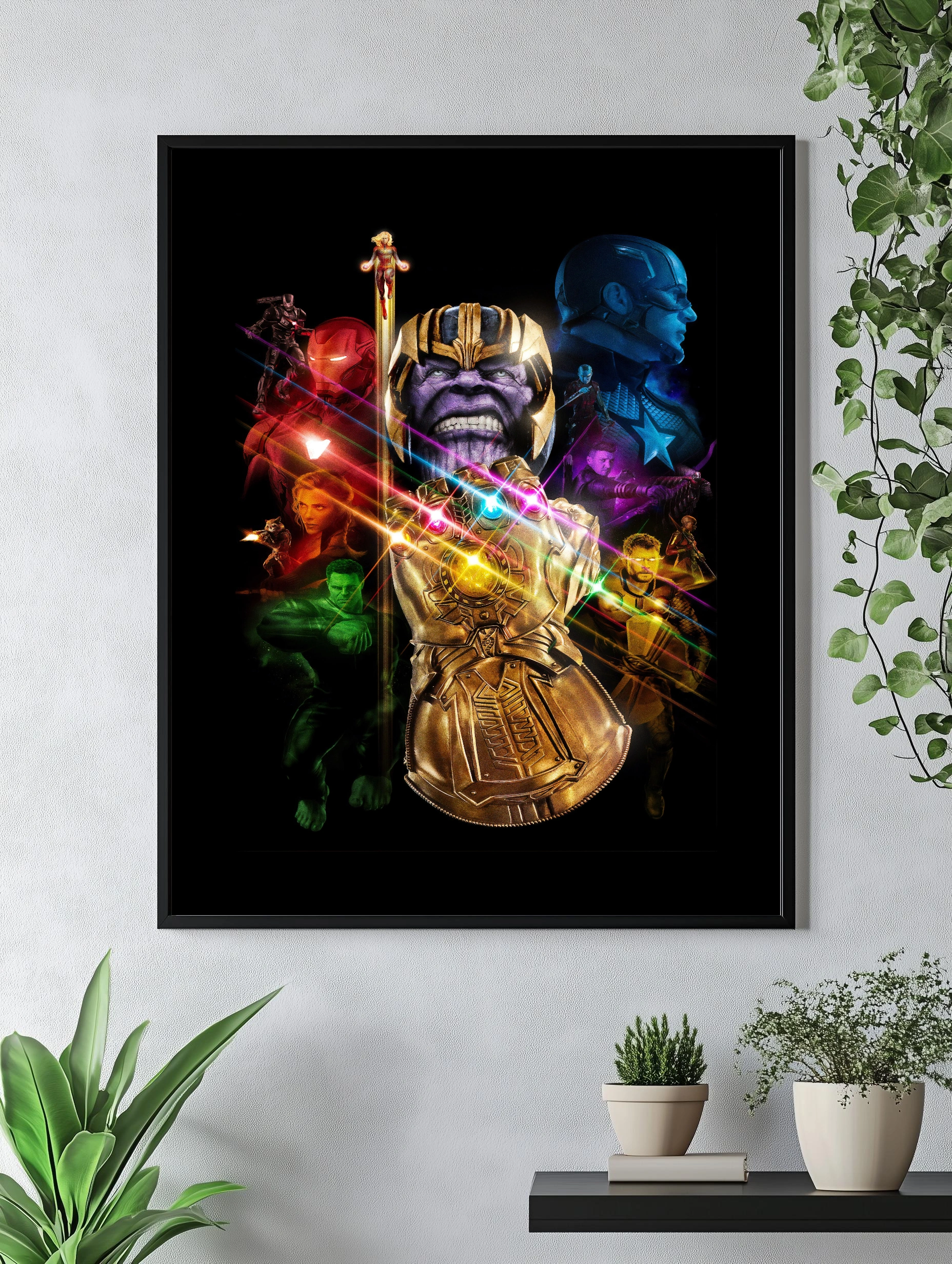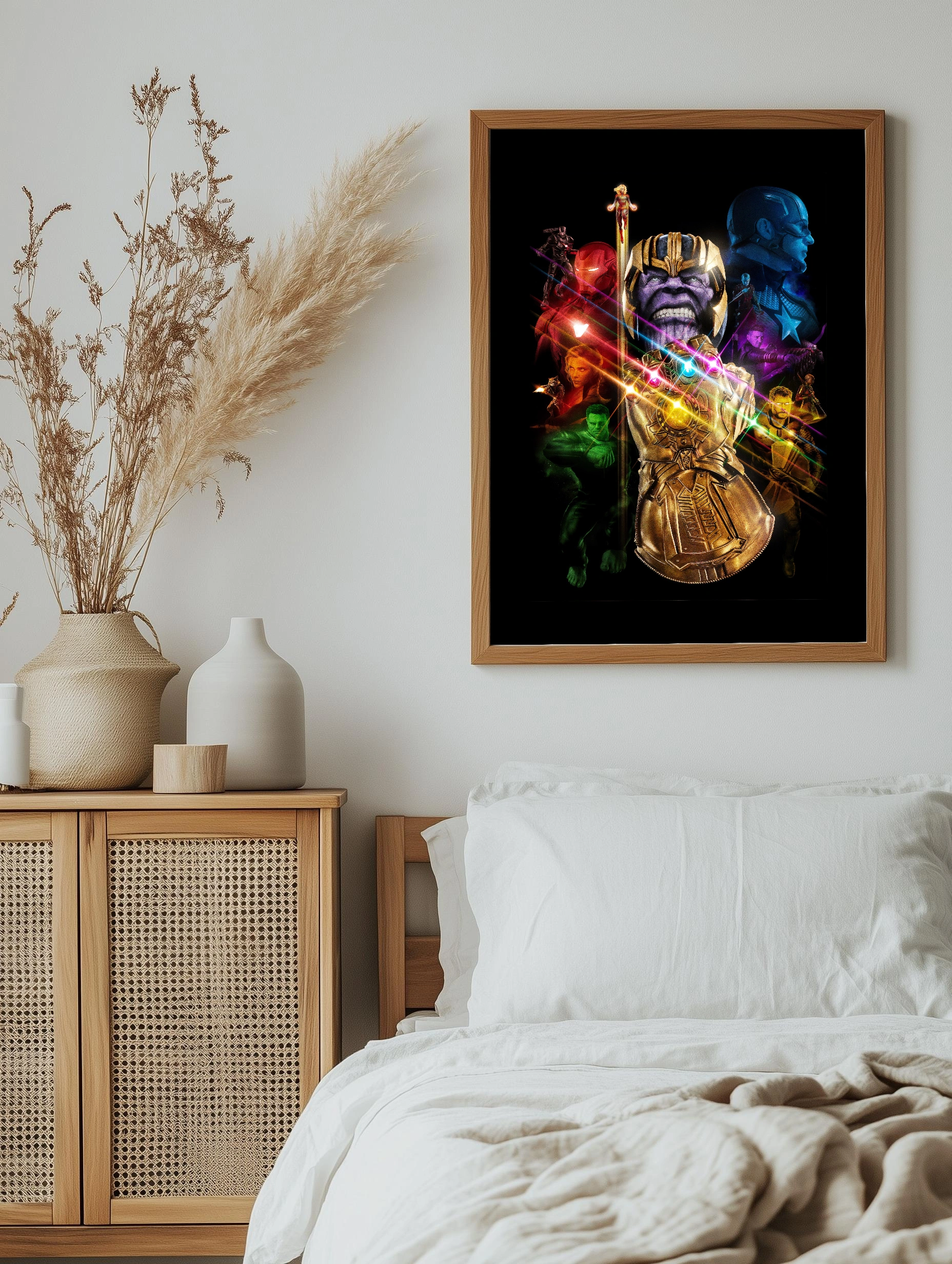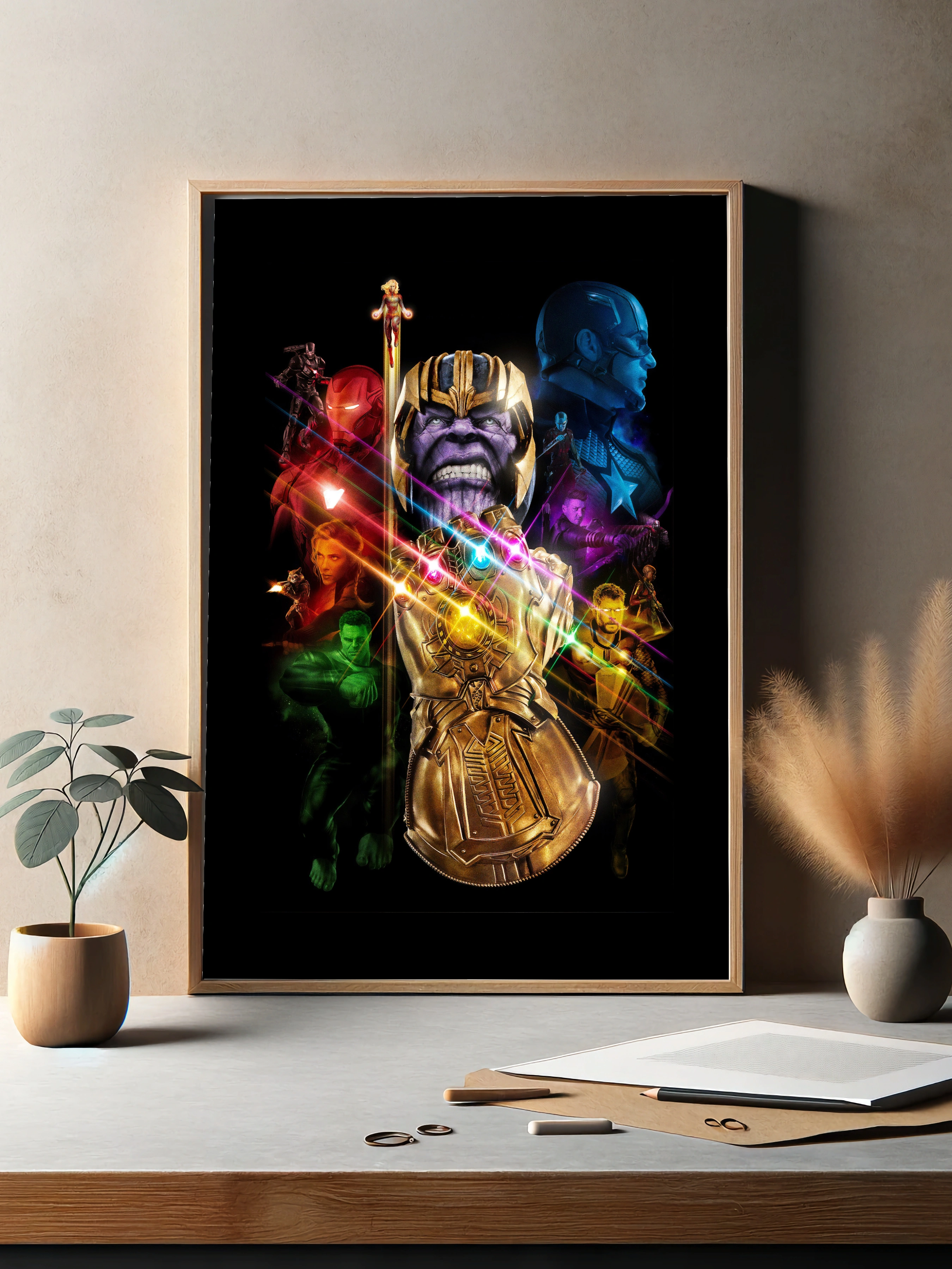 Яркий и динамичный интерьерный арт с персонажами Marvel – Танос с Инфинити Гаунтлетом в центре, окружённый Капитаном Америкой, Железным Человеком, Тором, Халком и другими героями. Стильное декоративное искусство для стен с акцентом на силу, борьбу и единство, идеальное для современной гостиной или офиса.